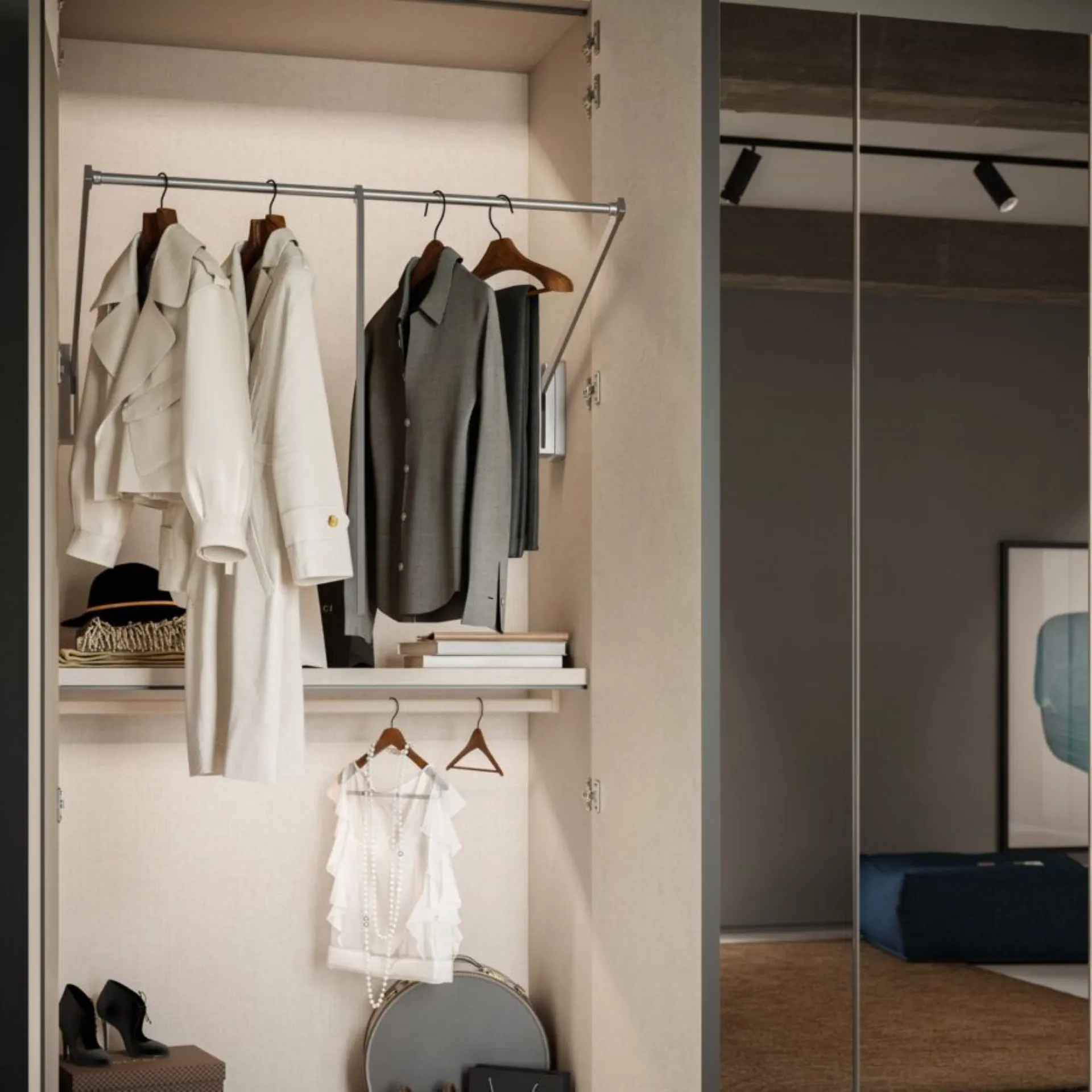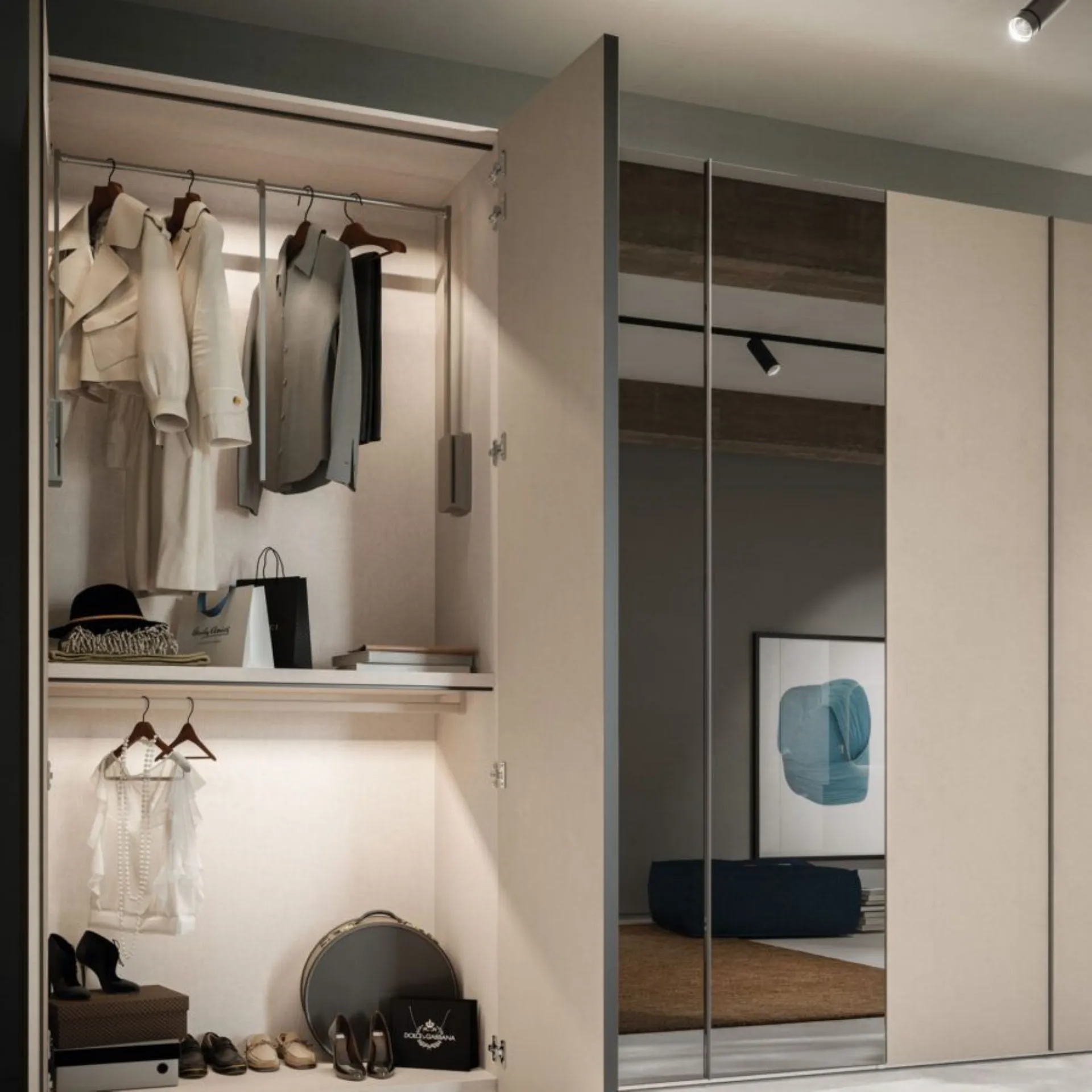 Mottes Mobili propone questo armadio in laminato con ante battenti mod. Manlò in Cemento Aragona e ante Specchio in specchio Fumè, profili bruniti. Colonna armadio attrezzata con Servetto appendiabiti, ripiano, tubo e luci LED orizzontali. L'offerta per questo armadio è di euro 1.900,00. compreso Iva e trasporto, montaggio escluso. Tempi di consegna 40 gg. circa. Per maggiori informazioni contattaci via mail o passa a trovarci nel nostro showroom.