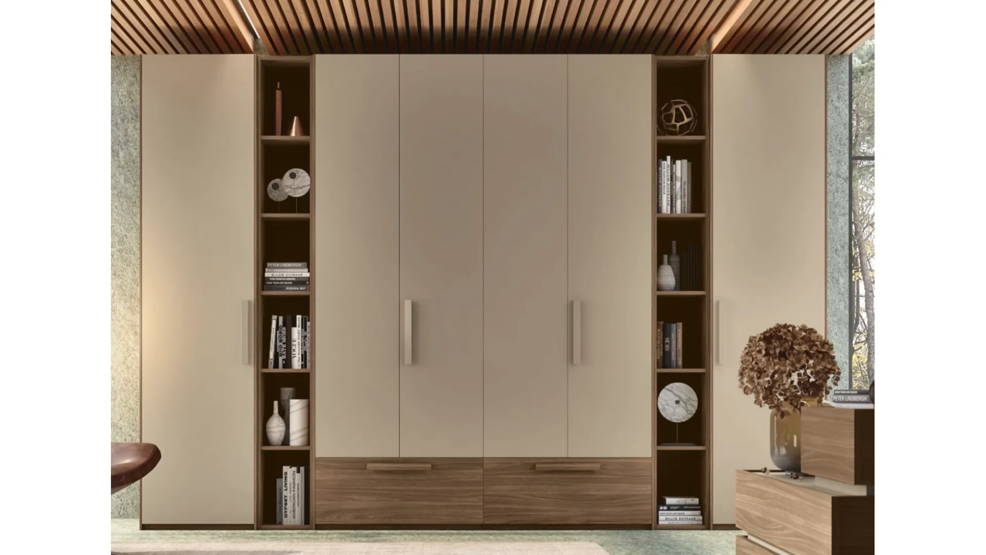 La zona notte è luogo del riposo che più di altri ambienti rispecchia il gusto di chi lo abita e per questo va ammobiliato con molta cura. Con i modelli di armadi in laccato opaco si potranno dare forma alla zona notte giusta per voi. Obiettivo del progetto della zona notte è un interno votato al massimo agio, accogliente, ricercato. Nella zona notte sono molti i pezzi di arredo che arredano l'ambiente e le funzioni. Mottes propone armadi in stile moderno per la zona notte pensati per organizzare al meglio gli interni. Armadio modello Quadro a 6 ante e 2 cassettoni con maniglie in legno, cassettoni lunghe 90cm e vani a giorno da 30cm. Finiture dei materiali personalizzabili, tempi per la fornitura 30-35 giorni.