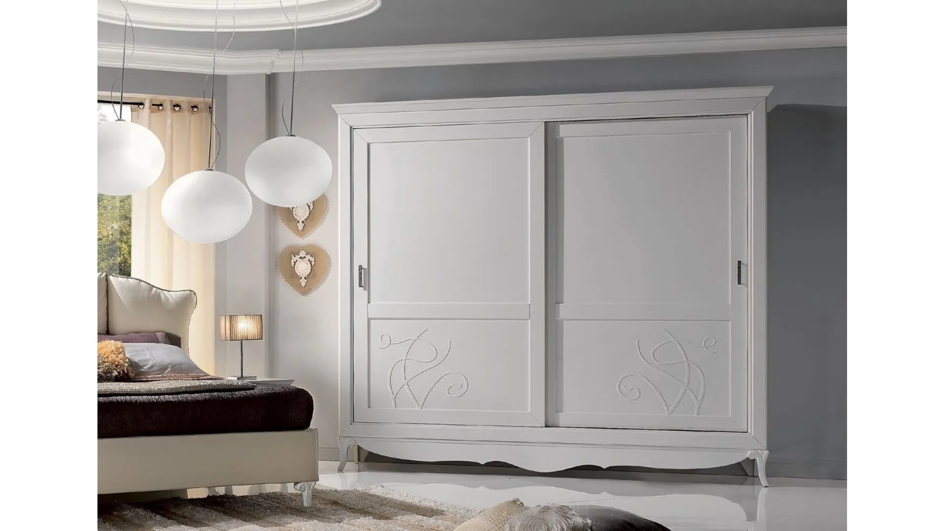 Dalla collezione Mottes Mobili, presentiamo armadio modello Silvia. Armadio 2 ante scorrevoli in legno con decori in rilievo, zoccolo e piedini sagomati ed intagliati. Dotazione interna: tre paletti appendiabiti, tre ripiani ed una cassettiera interna. Finitura in fotografia laccata di colore bianco opaco. Larghezza: 281cm, Altezza: 253cm, Profondità: 63cm. Possibilità di scelta delle finiture senza variazione di prezzo. Tempi di consegna 40-50 giorni, il montaggio è escluso. Consegna compresa nel prezzo in tutta Italia. L'offerta per questo armadio è di euro 3050,00. Per maggiori informazioni contattaci via mail o passa a trovarci nel nostro showroom.