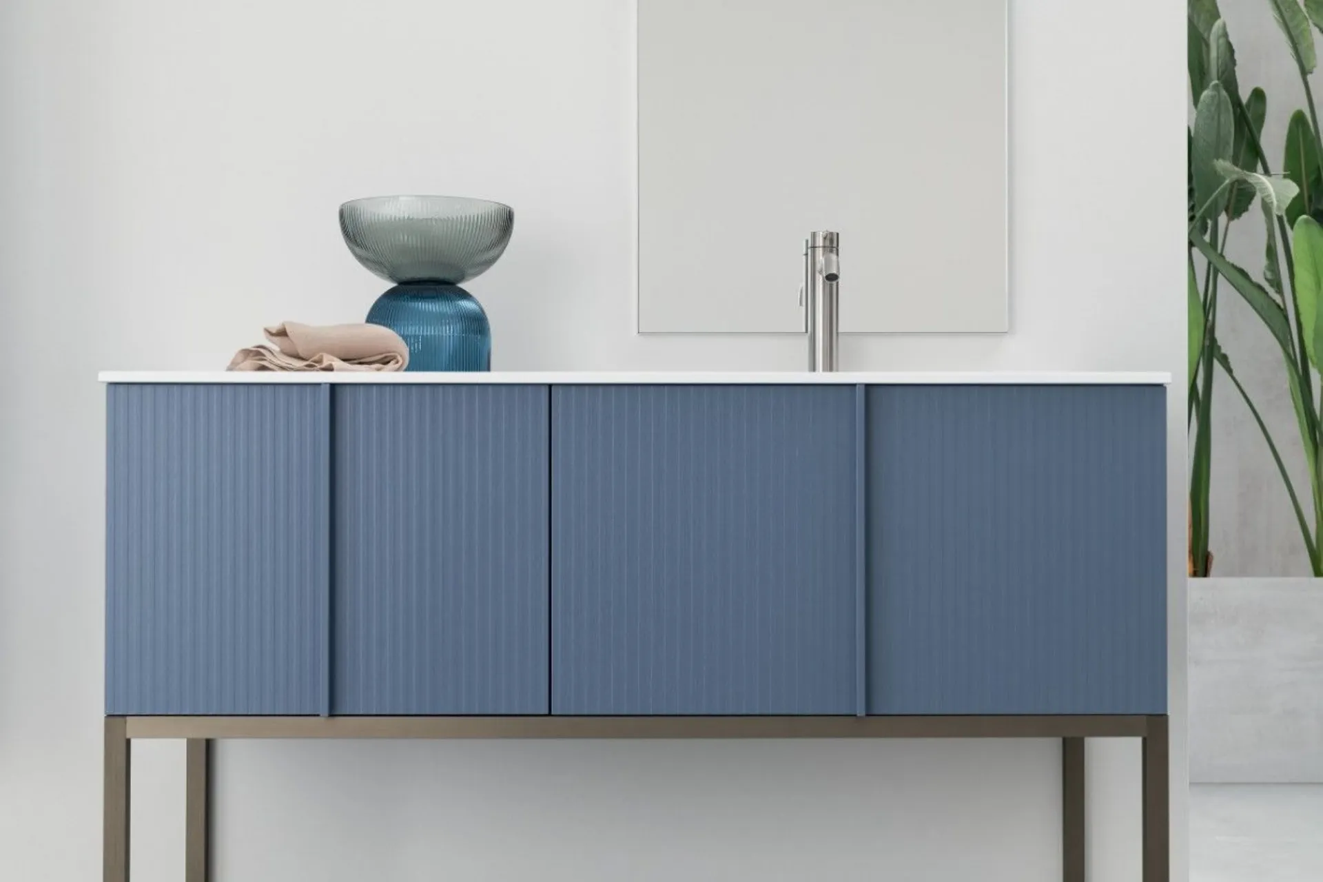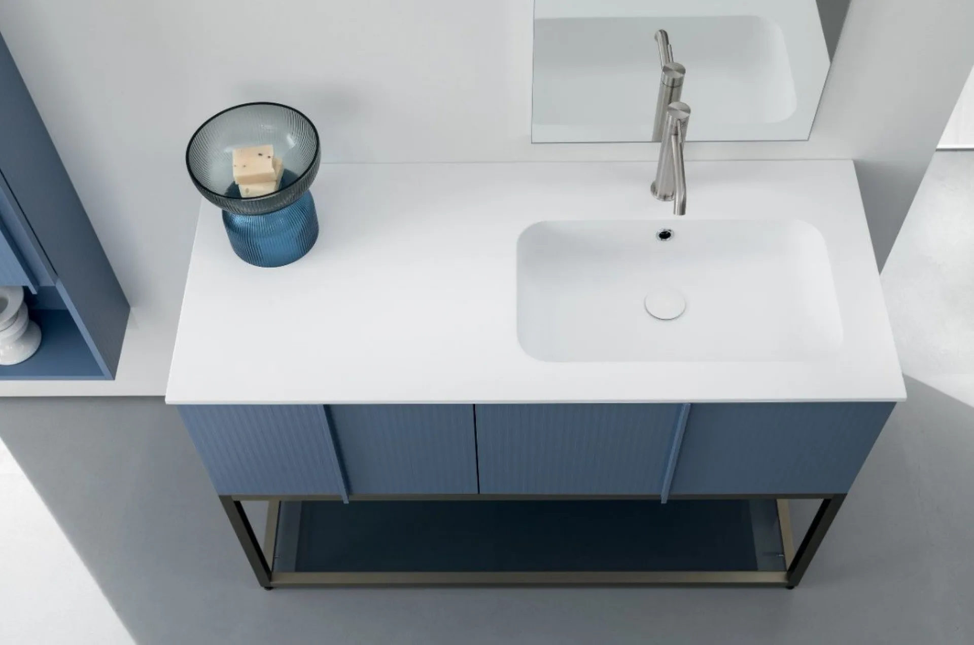 Bagno mod. B201 composizione 13 con frontali in laccato Opaco e piano in Mineralguss bianco opaco con vasca integrata . Composizione l.120.5 con pensile a giorno l.35. Struttura portante in metallo verniciato. Possibilità di personalizzarlo con misure e finiture anche in laminato.