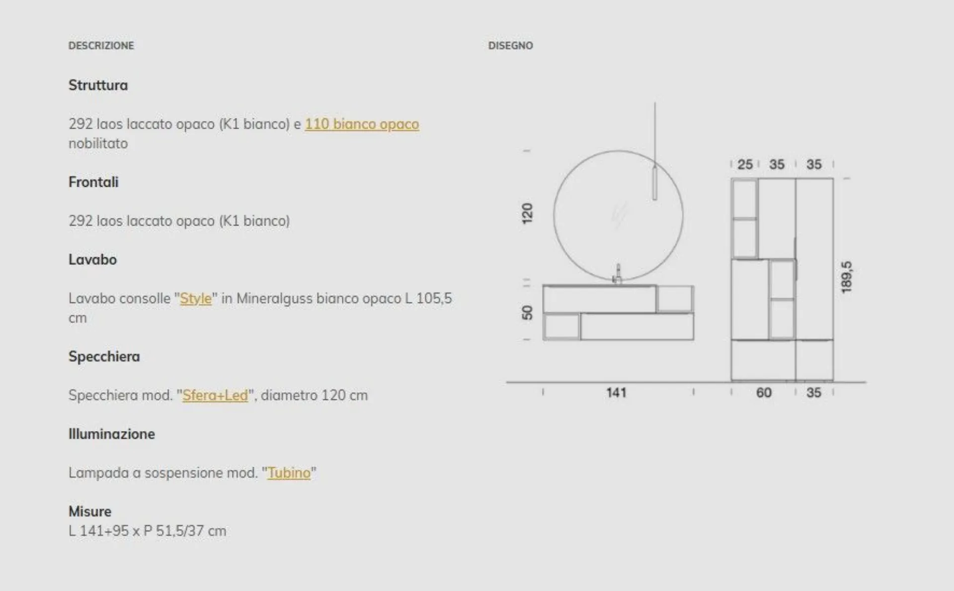 Bagno mod. B201 composizione 29 con frontali in laccato Opaco e piano in Mineralguss bianco opaco con vasca integrata . Composizione l.141 colonne a terra l.95. Possibilità di personalizzarlo con misure e finiture anche in laminato.