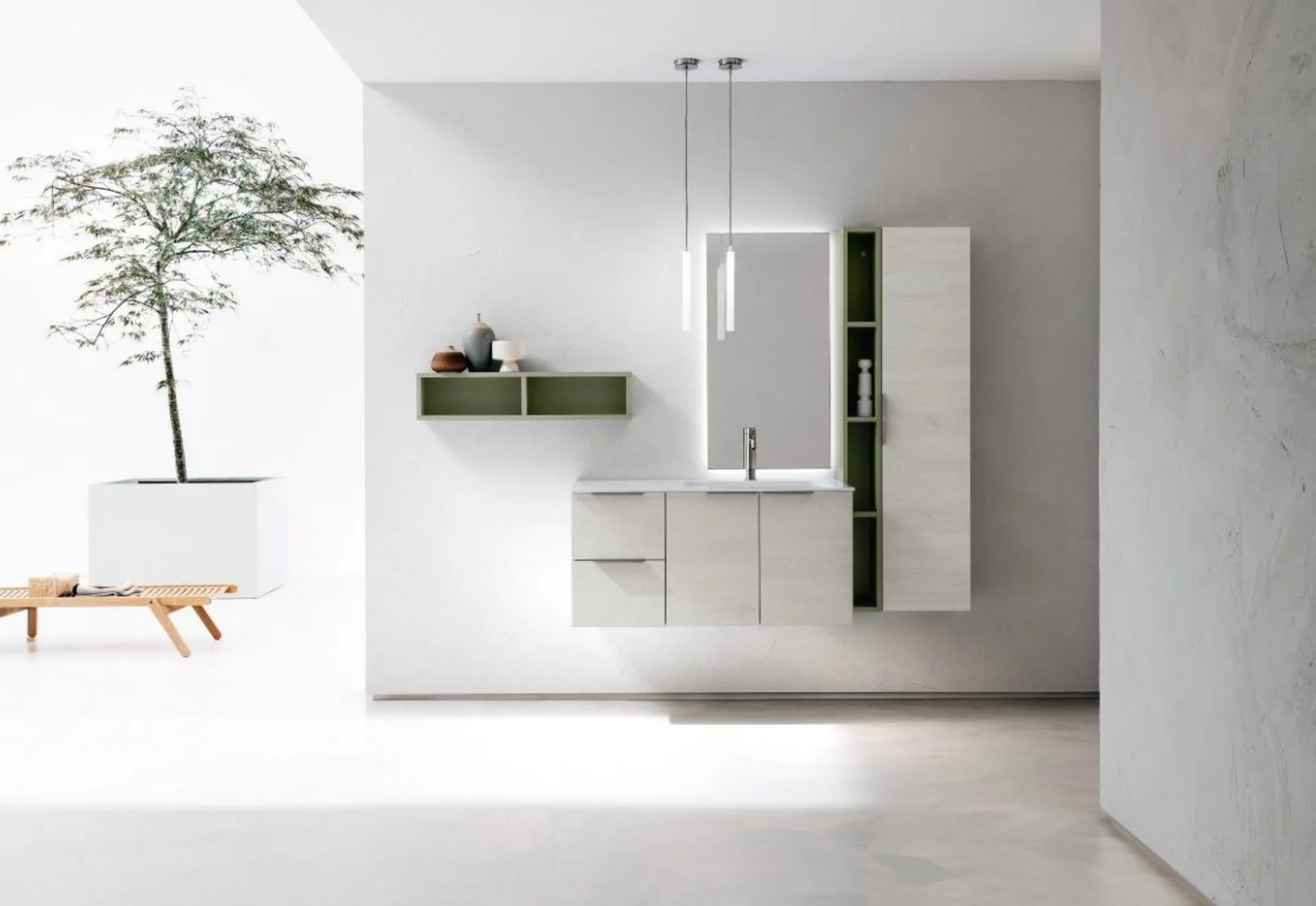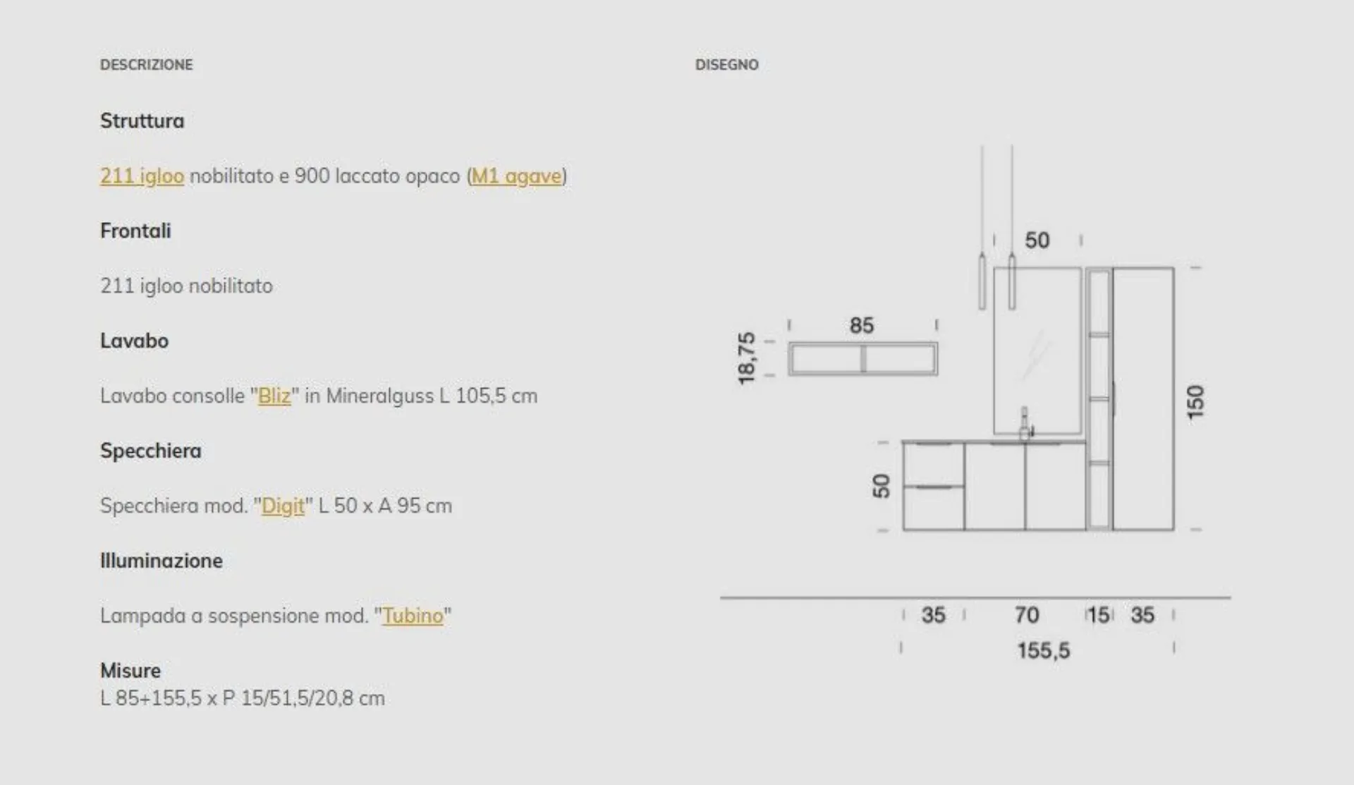 Bagno mod. B201 composizione 08 con frontali in laminato Igloo e pensile laccato Agave Opaco. Lavabo consolle in Mineralguss lucido con vasca integrata . Composizione l.155,5 con pensile a giorno a sbalzo. Possibilità di personalizzarlo con misure e finiture anche in laccato.