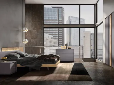 Camera da letto matrimoniale in stile moderno dotata di un letto e due comodini. Letto in legno versione giroletto di 10cm con piedini in plexiglass di lunghezza 214cm, larghezza 172cm e altezza della testiera 95cm. Rete a doghe e materasso non compresi. Due comodini con finitura effetto cemento con due cassetti di lunghezza 48cm, larghezza 54cm e altezza 44cm. Con finiture a scelta, il complesso è disponibile a €1.300,00. Gli articoli sono su ordinazione, la spedizione varia dai 30 ai 35 giorni e la consegna è compresa nel prezzo.