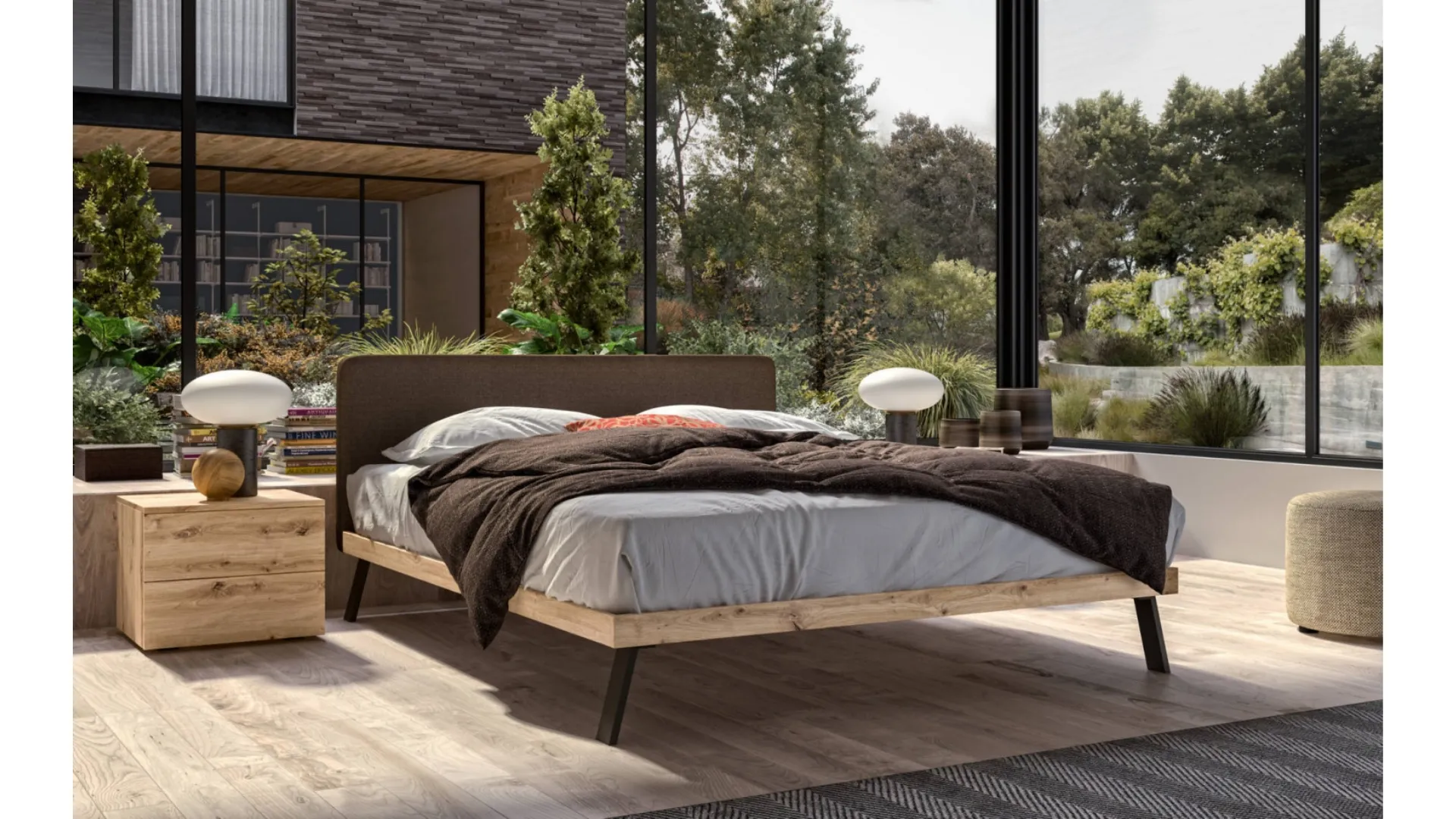Camera da letto matrimoniale in stile moderno dotata di un letto e due comodini. Letto con testiera imbottita in similpelle o tessuto versione giroletto in legno di 7cm, di lunghezza 203cm, larghezza 172cm e altezza della testiera 92cm. Rete a doghe e materasso non sono compresi. Comodini con due cassetti di lunghezza 48cm, larghezza 54cm e altezza 44cm. Con finiture a scelta, il complesso è disponibile a €1.500,00. Gli articoli sono disponibile su ordinazione, la spedizione varia dai 30 ai 35 giorni e la consegna è compresa nel prezzo.