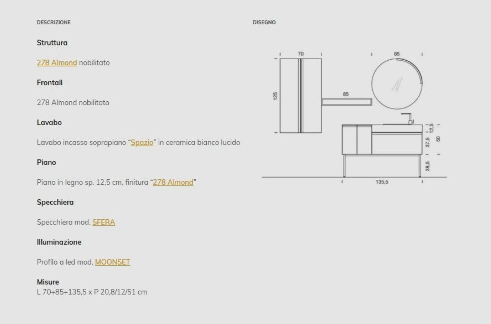 Bagno mod. BIK composizione 13 con frontali in laminato, piano in laminato sp.12.5 con lavabo in ceramica ad incasso . Composizione l.135.5 pensili l.70. Possibilità di personalizzarlo con misure e finiture anche in laccato o legno Rovere.