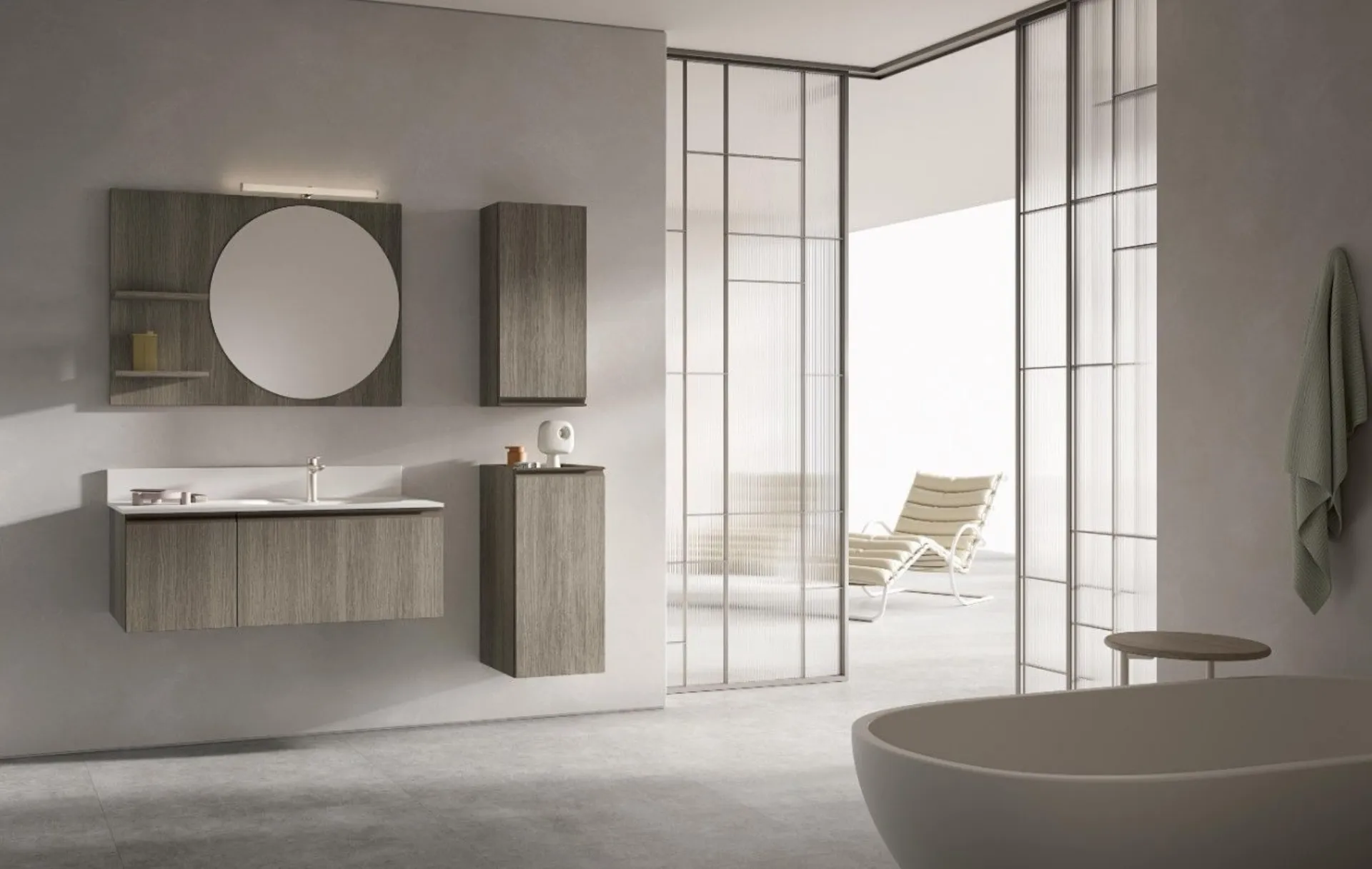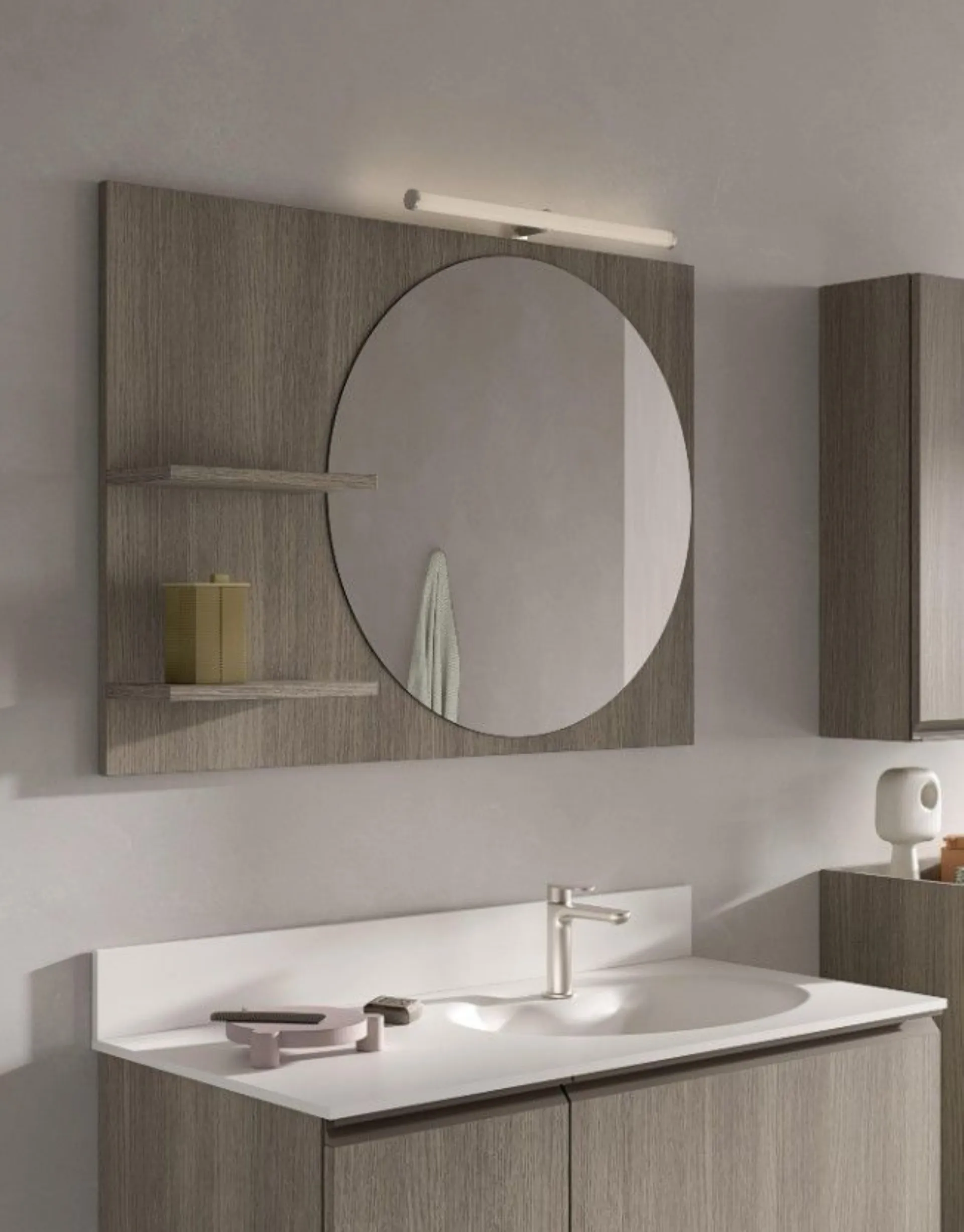Bagno mod. BIK composizione 07 con frontali in laminato e piano in Corian con vasca integrata . Composizione l.106 pensile l.35 . Possibilità di personalizzarlo con misure e finiture, anche in laccato o legno Rovere.