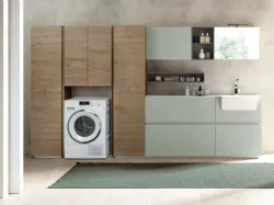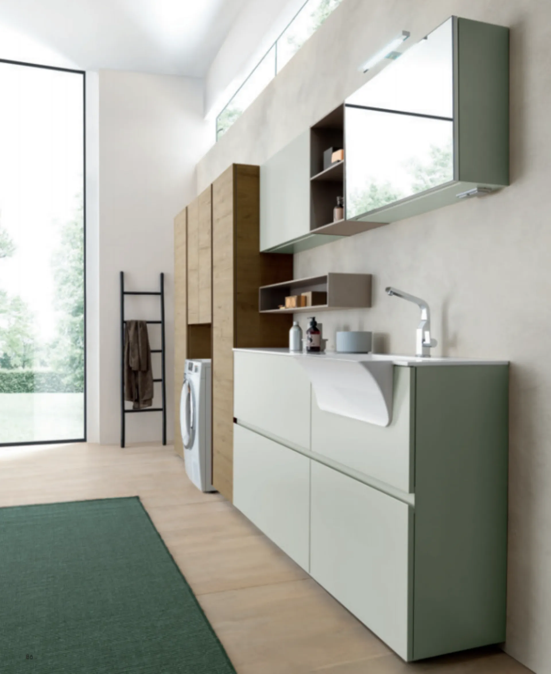 Composizione lavanderia can basi a gola e pensili in laccato verde polvere opaco, pensile a giorno in Dekorativo 3D reflex metallizzato, pensile e anta specchio in laccato verde polvere opaco. Colonne in Dekorativo 3D rovere sherwood castano e Top con lavatoio integrato a semincasso One in Geacril bianco lucido. La composizione misura in totale 345cm di lunghezza, 195cm di altezza e 37cm di profondità. Il complesso è disponibile a €4.000,00 con finiture a scelta. La consegna varia da 30 a 35 giorni.