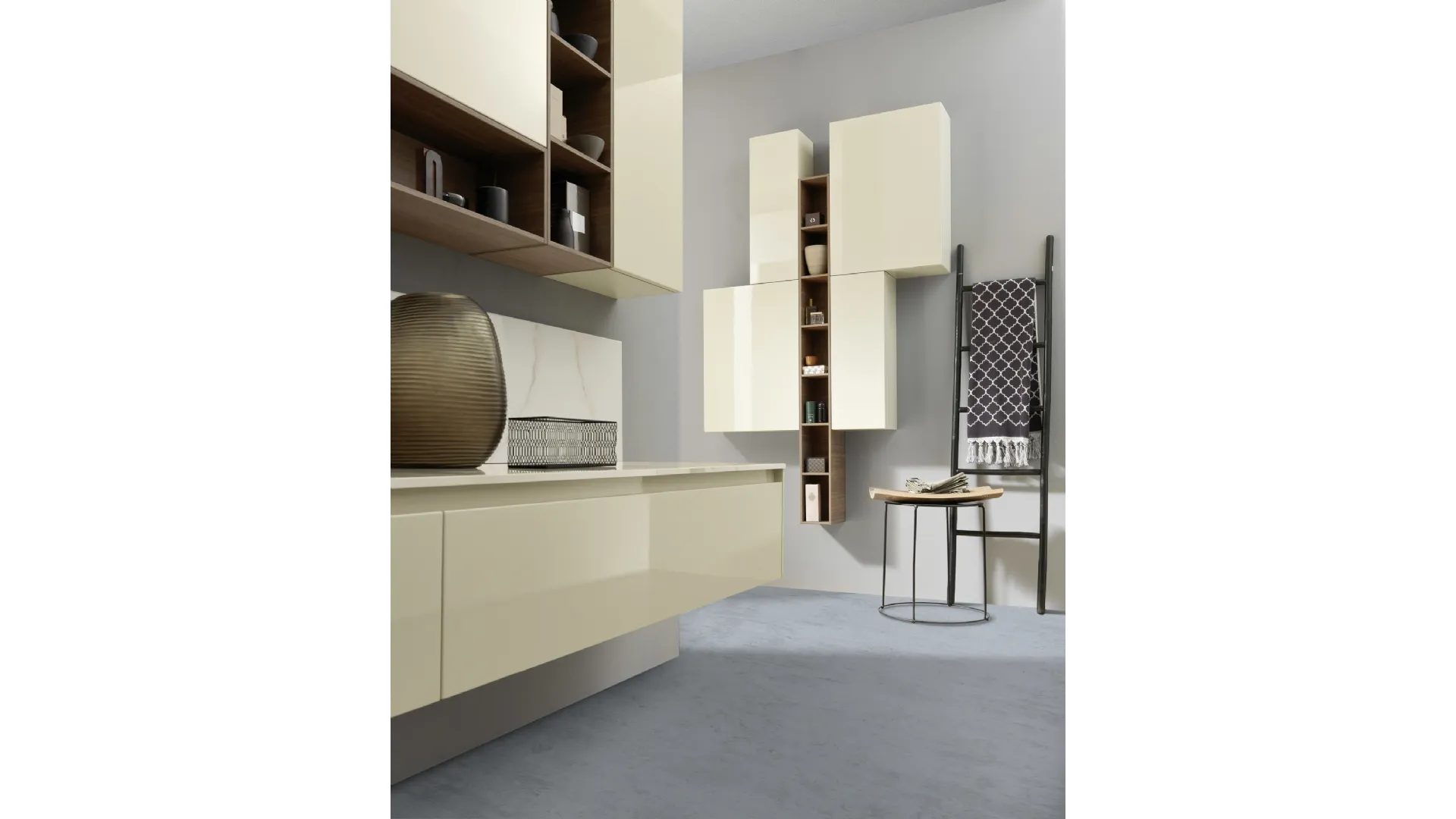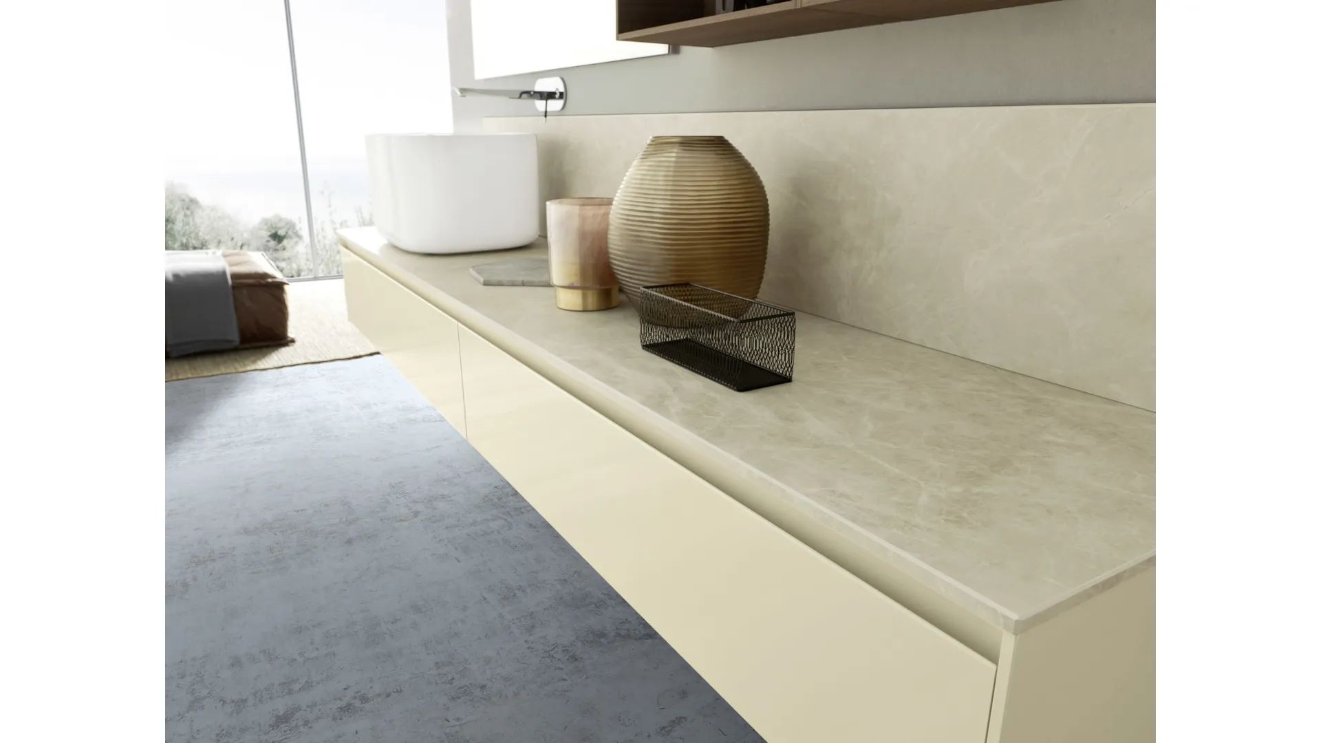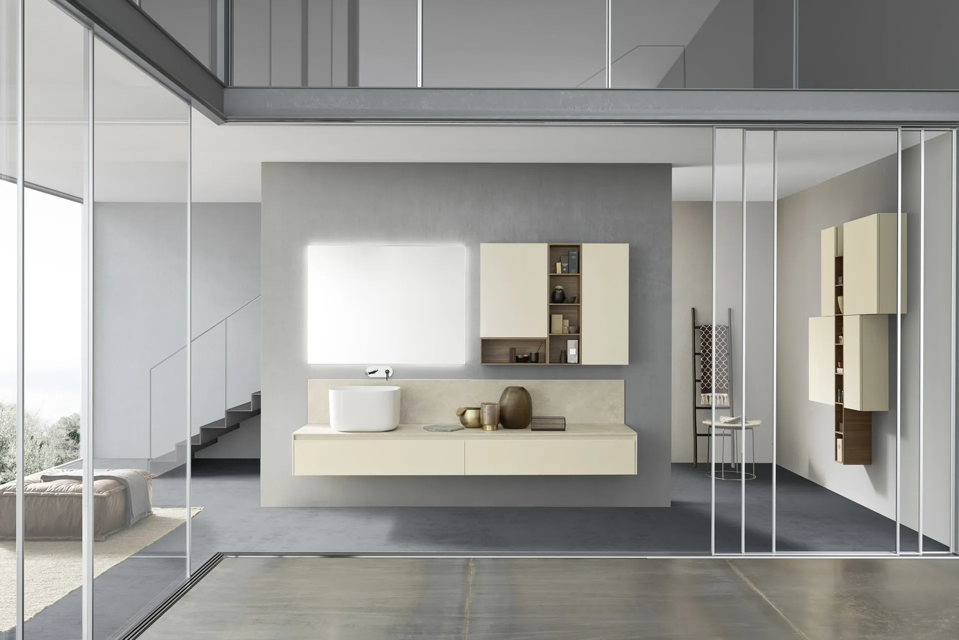 Mobile bagno a elementi sospesi con basi-gola e pensili in laccato cappuccino lucido, pensili a giorno in Dekorativo 3D Eucalipto sablè canaletto, top senza alzatina in mineralmarmo perla opaco. Specchiera rettangolare retroilluminata 120x90cm. La composizione misura 242cm di lunghezza, 195cm di altezza e 50,5cm di profondità. Il complesso è disponibile a €3.680,00 con finiture a scelta. la consegna varia da 30 a 35 giorni.