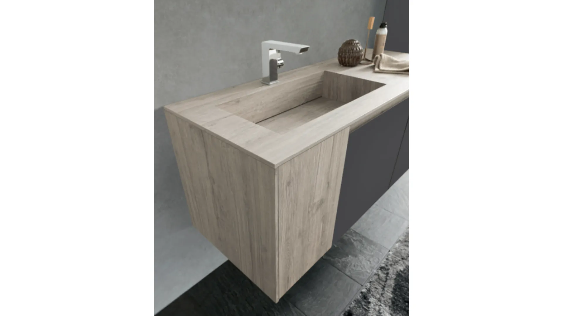 Mobile bagno a elementi sospesi con base double in HPL unicolor quercia grigia, base in laccato grigio grafite opaco, pensile-gola in HPL unicolor quercia grigia, colonne in laccato grigio grafite opaco. Top mineralmarmo antracite opaco con vasca integrata. Specchiera rettangolare 80x70cm. La composizione misura 220cm di lunghezza, 195cm di altezza e 50,5cm di profondità. Il complesso è disponibile a € 3.150,00 con finitura a scelta. La consegna varia da 30 a 35 giorni.