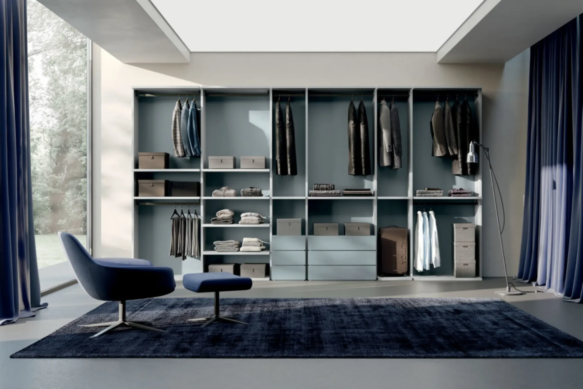Cabina armadio che si distingue per la ridotta profondità dei fianchi a spalla, creando un armadio aperto senza dimenticare solidità e rigore. Struttura in materico e laccato opaco. Lunghezza 471cm, altezza 257cm e profondità 45cm. Articolo su ordinazione con finiture a scelta, la nostra offerta Euro 3.600, 00