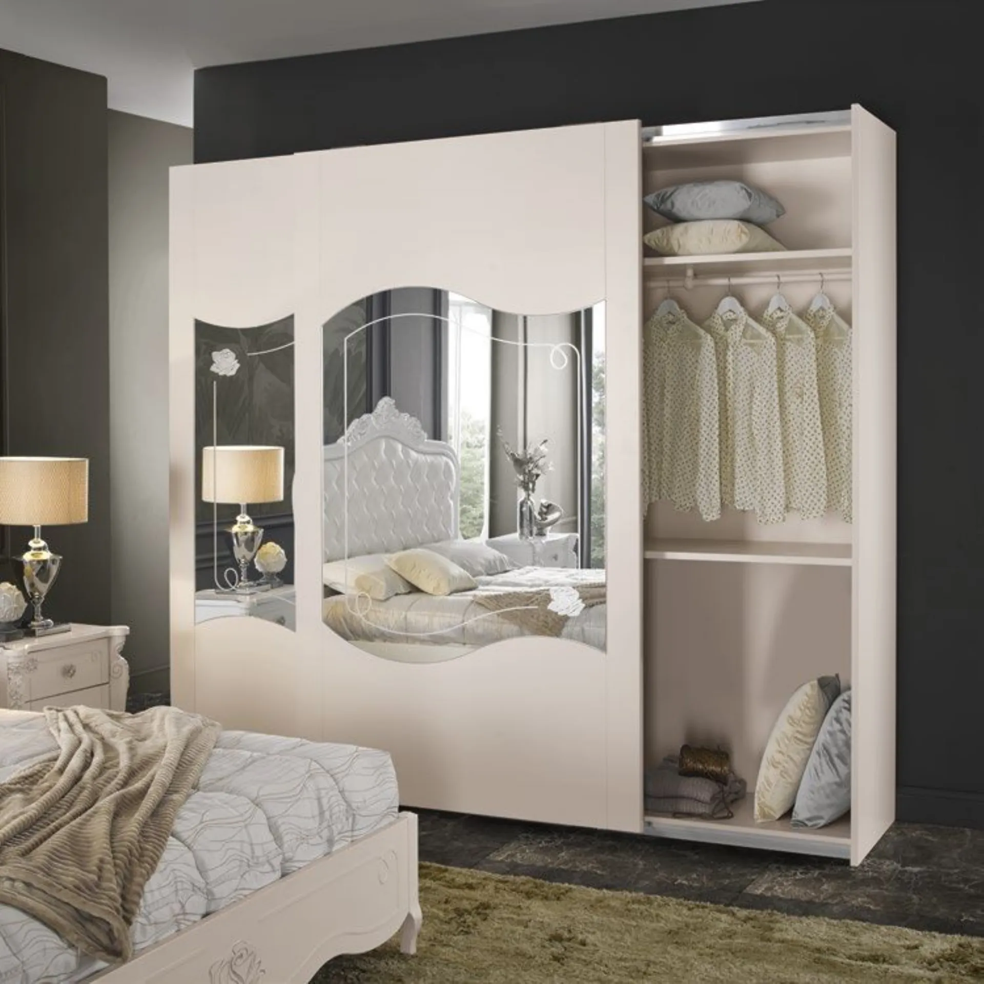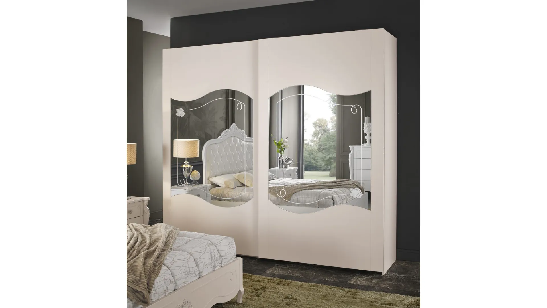 La camera da letto rappresenta un vero e proprio luogo dell’anima, l’ambiente in cui dire addio alla formalità della vita pubblica e rintanarti dedicandoti al meritato riposo. Per questa ragione la scelta dello stile è fondamentale: deve farti sentire a tuo agio e garantirti il massimo comfort possibile. Camera matrimoniale completa stile classico modello Stella. Letto matrimoniale con testata imbottita, contenitore interno, stile classico con piedini sagomati e rifiniture. Ha una lunghezza di 182cm, profondità 212cm, altezza 156cm. Nello stesso stile, comodino a tre cassetti con guide ammortizzate, comò a quattro cassetti ammortizzati dove risalta la specchiera tonda con luce a Led integrata. A concludere armadio ad ante scorrevoli in legno, con ripiani interni, appendiabiti e quattro cassetti. A risaltare, set specchi sagomati con decoro nelle ante. Lunghezza 276cm, profondità 65cm, altezza 247cm. Consegna compresa nel prezzo, 30-40 giorni lavorativi. La nostra offerta per questa camera matrimoniale è di euro 5900,00. Per maggiori informazioni contattaci via mail o passa nel nostro showroom.