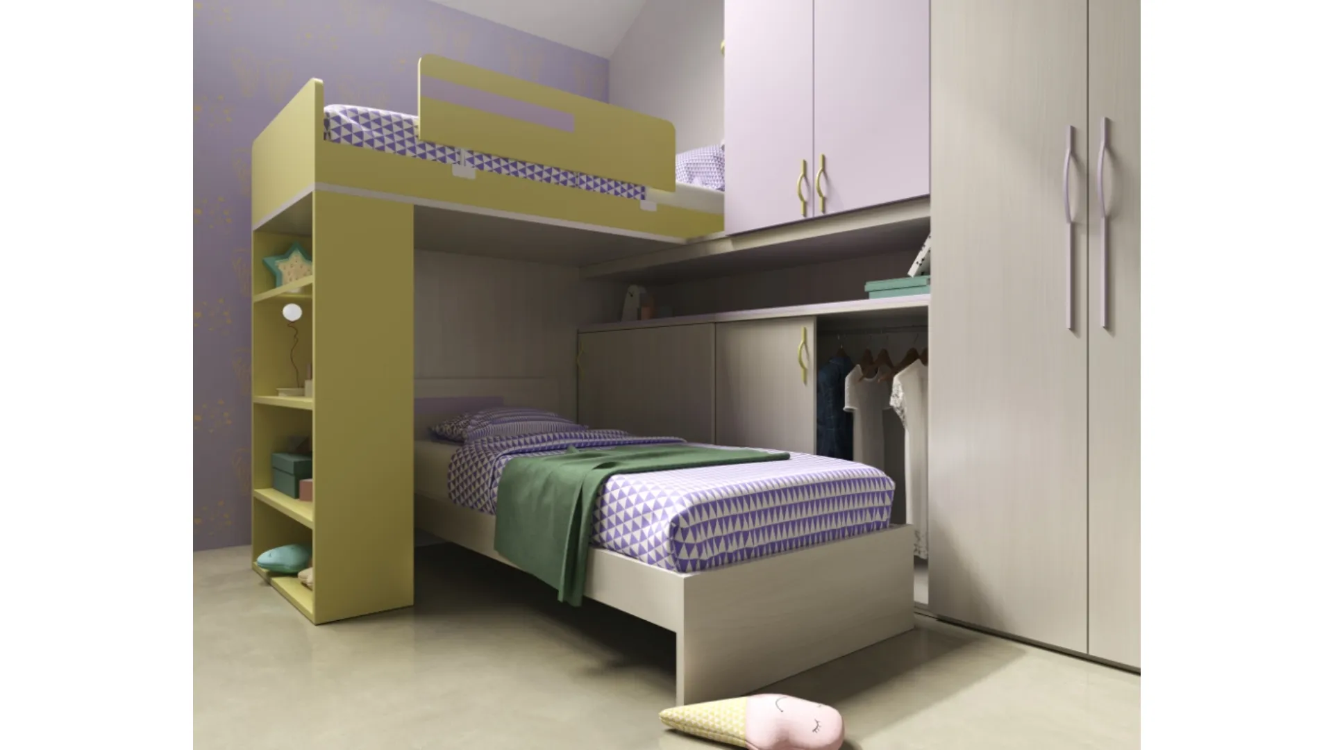 Una proposta angolare a due letti sfalsati con una comoda scaletta e pedana per salire sul letto superiore. Colonna armadio ante lunga con altezza 258 cm. un pensile a due ante, modulo libreria a giorno. La libreria portante con mensole colorate, la scaletta e pedana per salire sul letto superiore. I due letti sono comprese le reti a doghe. La consegna è compresa nel prezzo in tutta Italia* e' una composizione su ordinazione, i tempi per la fornitura sono anche brevi. La possibilità di scelta delle finiture materiali a vostro gusto, come le maniglie, come tutti i campioni foto allegati. La possibilità di scelta personalizzazione predisposizione dei vari elementi che compongono questa soluzione dietro gli spazzi di casa vostra.