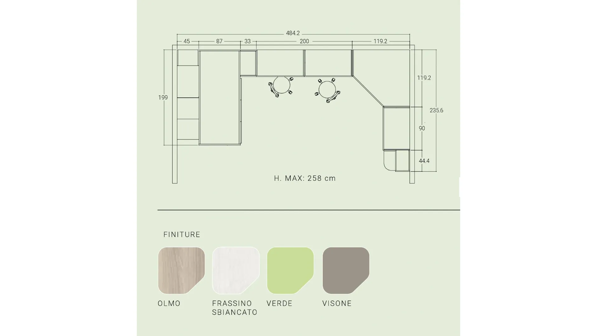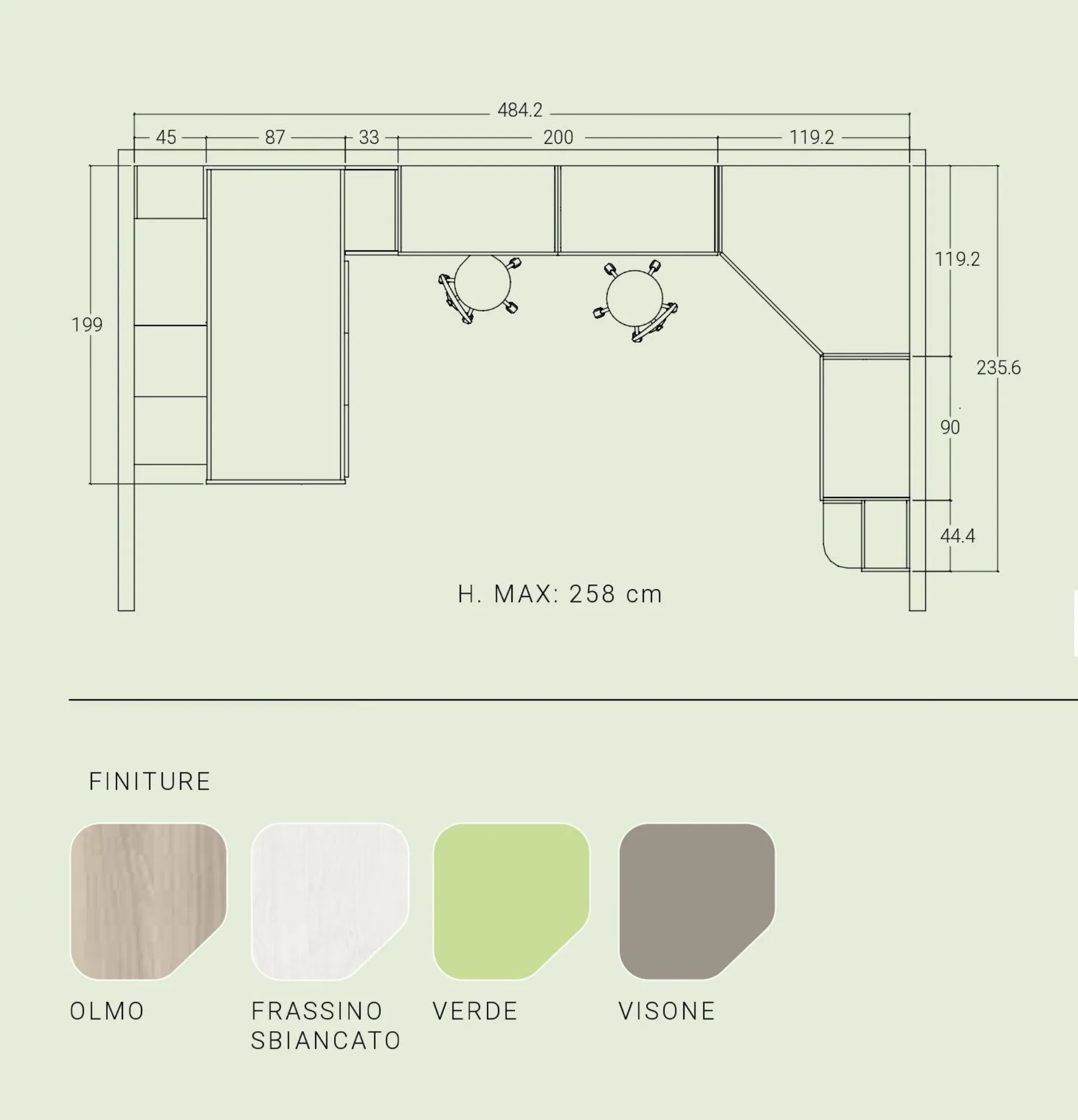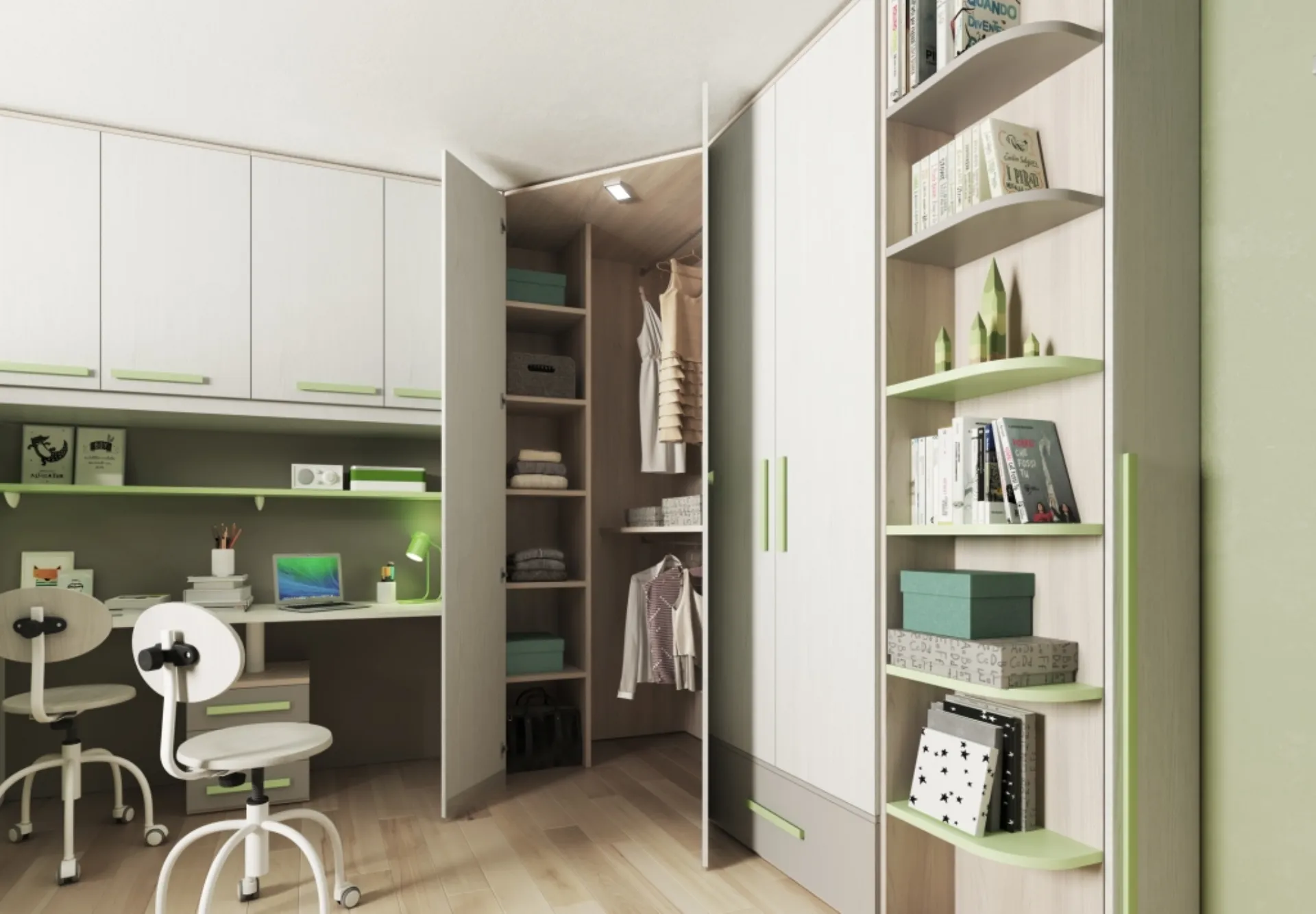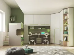 Una proposta angolare a due letti a soppalco con una comoda scaletta e pedana per salire sul letto superiore. Colonna armadio anta lunga con altezza 258 cm. libreria a giorno, armadio con cabina ad angolo. Zona studio a Ponte. Nei due letti sono comprese le reti a doghe. Per le misure vede allegata la planimetria. Composizione su ordinazione, i tempi per la fornitura sono anche brevi. La possibilità di scelta delle finiture materiali a vostro gusto, come le maniglie, come tutti i campioni foto allegati. La possibilità di scelta personalizzazione predisposizione dei vari elementi che compongono questa soluzione dietro gli spazzi di casa vostra.