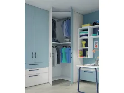 Cameretta singola per ragazzi realizzata con un grande armadio angolare bicolore olmo sbiancato e cielo a 4 ante e 3 cassetti, letto singolo in colore blu baltico con testiera e pediera sagomati. La scrivania è accostata a cassettoni e mensole per i libri.