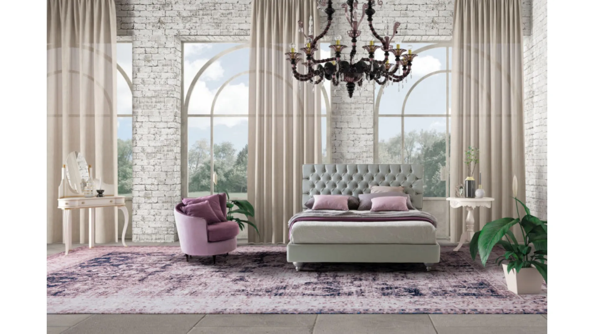 Bottoni in tessuto ed eleganti cristalli decorativi si sfidano nel dipingere i morbidi giochi di volume che animano il signorile capitonné della testiera squadrata. La tridimensionalità suggerita dalla soffice trapuntatura si riflette con efficaci effetti di luce sulla superficie della base, elegantemente sorretta da alti piedini dal profilo circolare.