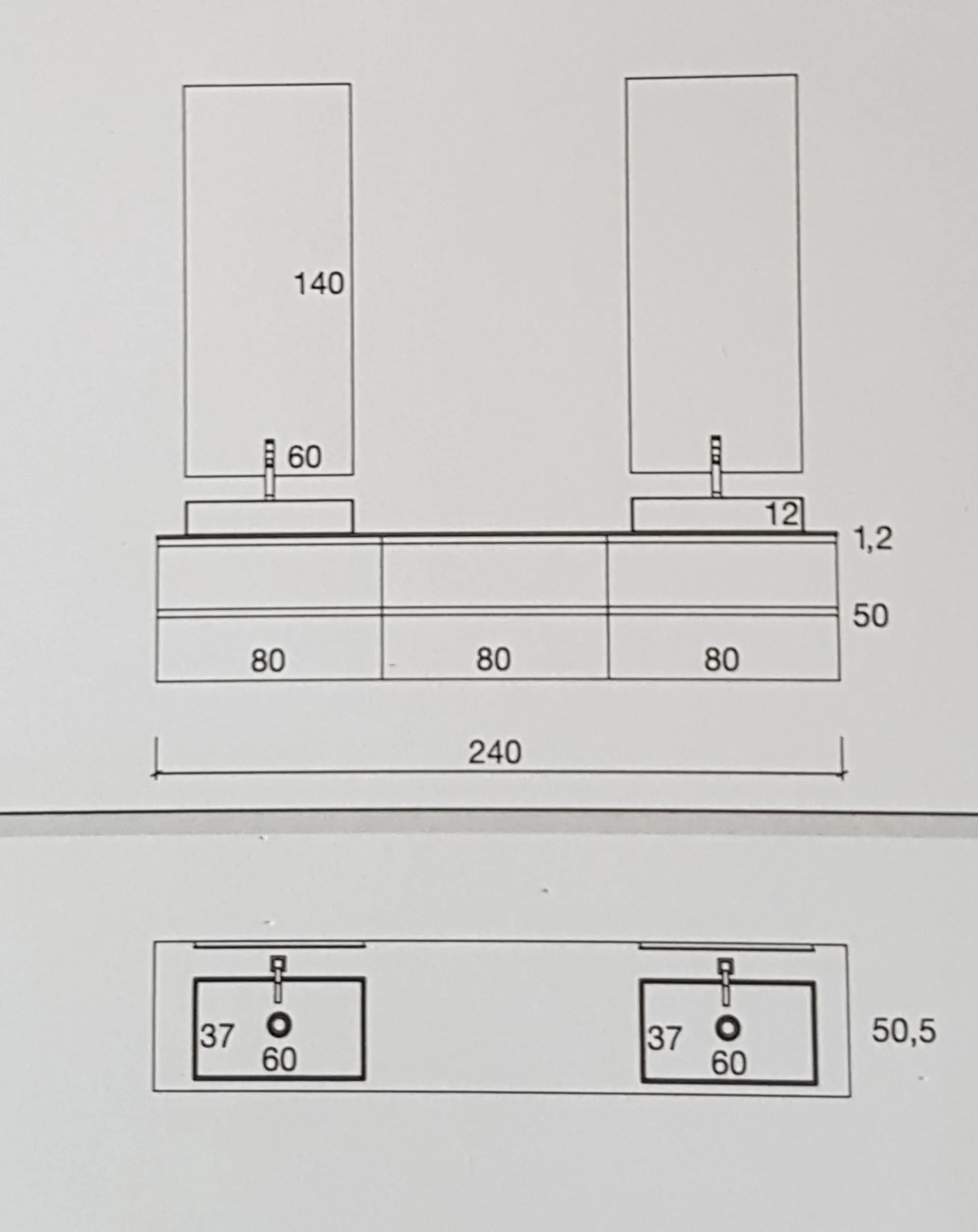 Un mobile composto da cestoni sospesi, una lunghezza di 240 cm. profondità 50 cm. Basi e pensili giorno lacati metal Piombo. Pensili con apertura Push&Pull laccati Bianco Opaco, Maniglia Surf Integrata nel frontale con la stessa finiture. Specchiera rettangolare retroilluminata a Led di Lunghezza 60cm e Altezza 140cm. Top di spessore 12cm in Deimos Stone Bianco Traffico con Lavabo Tutto Fuori Icon 60 in Ceramica Bianca. Le misure complete sono visibili in foto. E' una composizione su ordinazione, con la possibilità di scelta delle misure e finiture, del catalogo BAXAR.