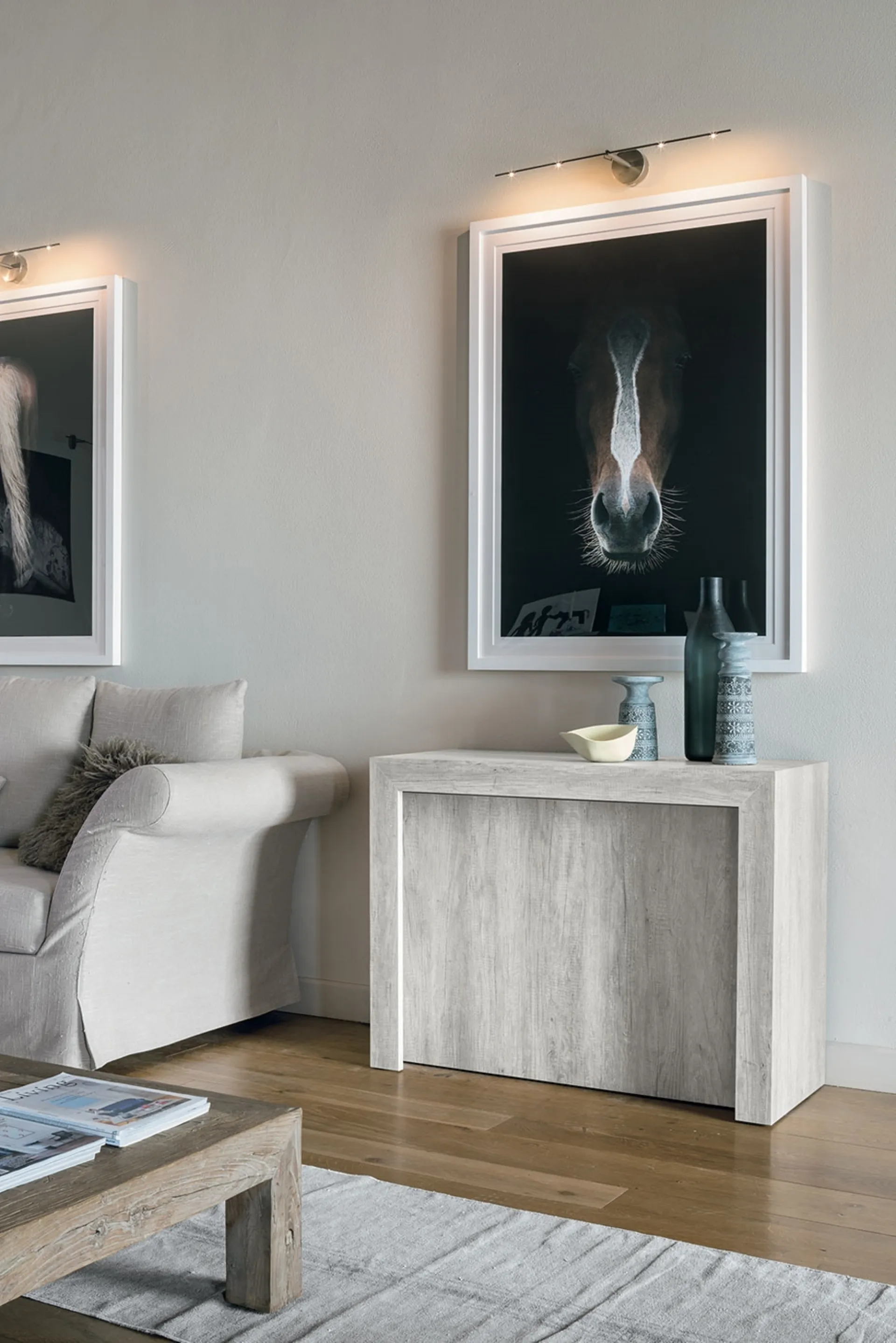Consolle allungabile in laminato con vano per riporre le allunghe. Visitateci nel nostro negozio per vedere la proposta di tavoli di Mottes Mobili che fa al caso vostro. Appartiene alla ricca offerta di tavoli di Mottes Mobili la proposta in legno qui presentato. Nel soggiorno o in cucina Tavoli sono elementi fondamentali, che rendono riconoscibile lo stile e rispondono a un ruolo indispensabile. Questa soluzione di tavoli del marchio Mottes Mobili scalda con il suo stile moderno l’ambiente della zona pranzo. Il tavolo, in abbinamento alle sedute, caratterizza l'atmosfera della zona giorno. Mobile in pronta consegna con finiture a scelta, proposto ad €1.300,00. Altezza 77cm, Larghezza 100cm, Lunghezza da 46 a 299cm.
