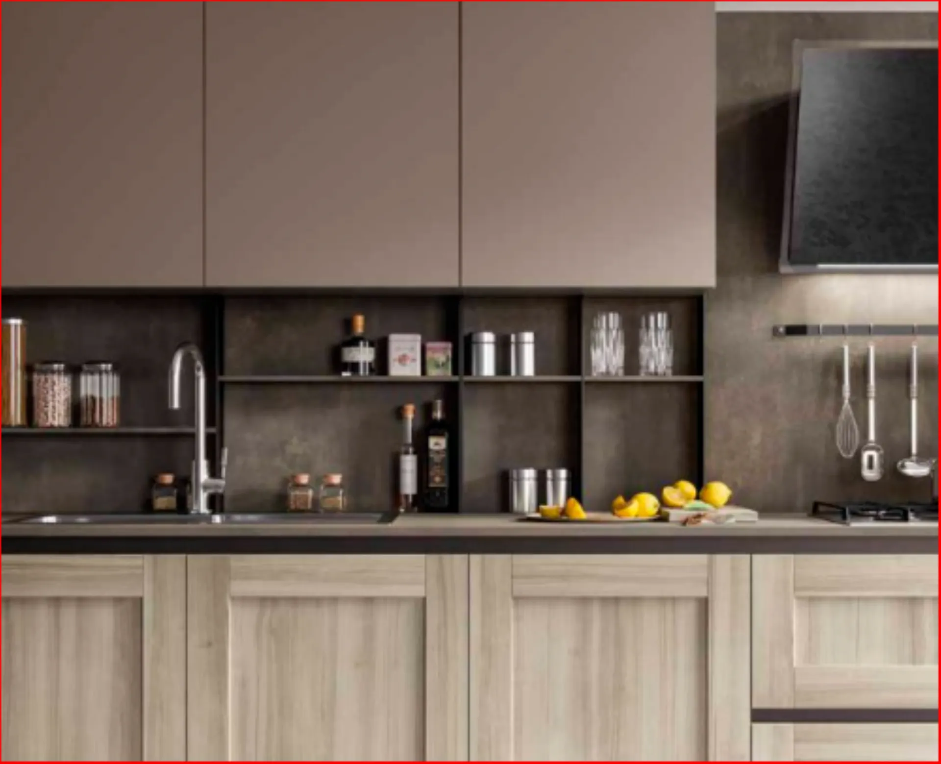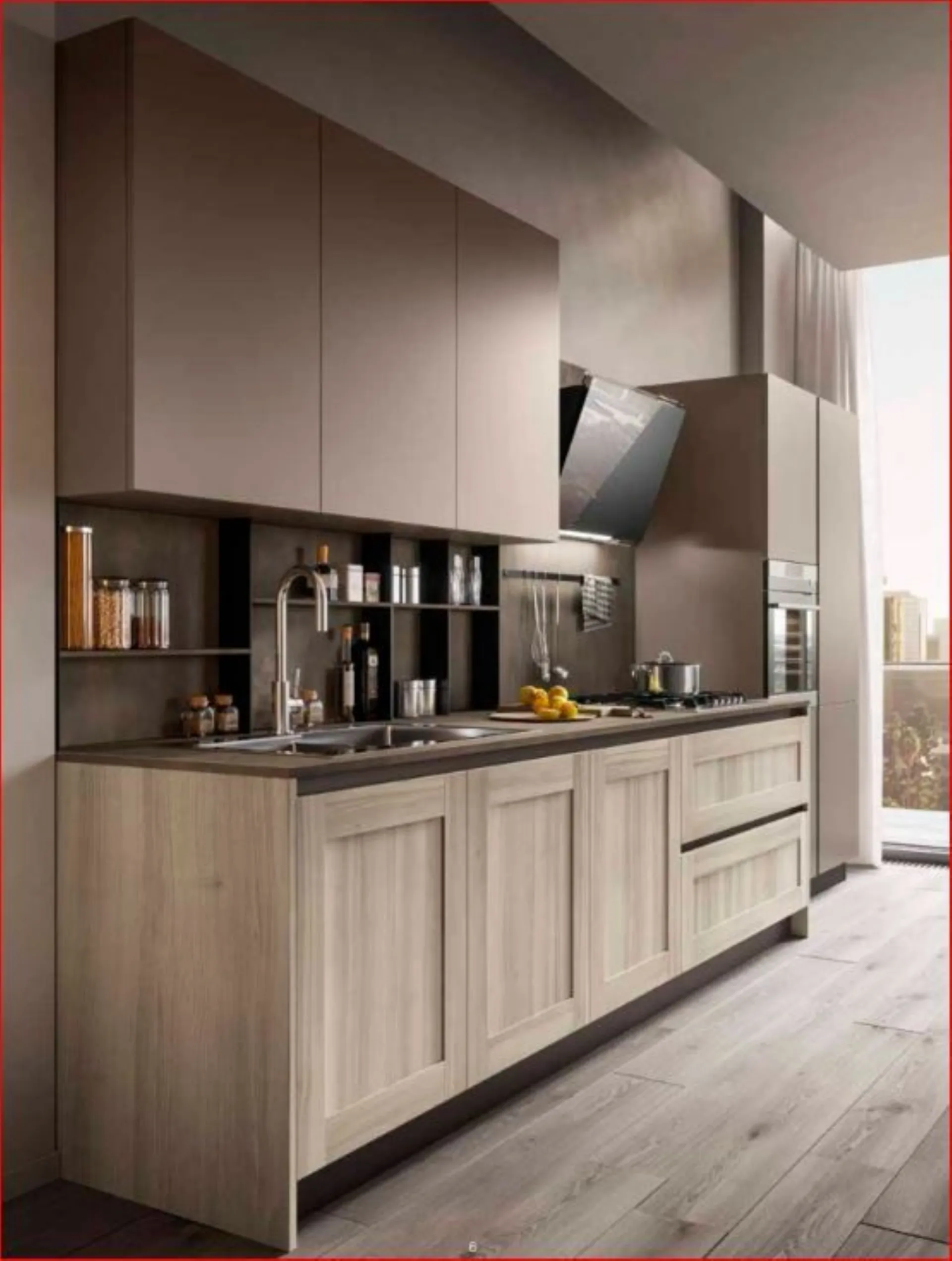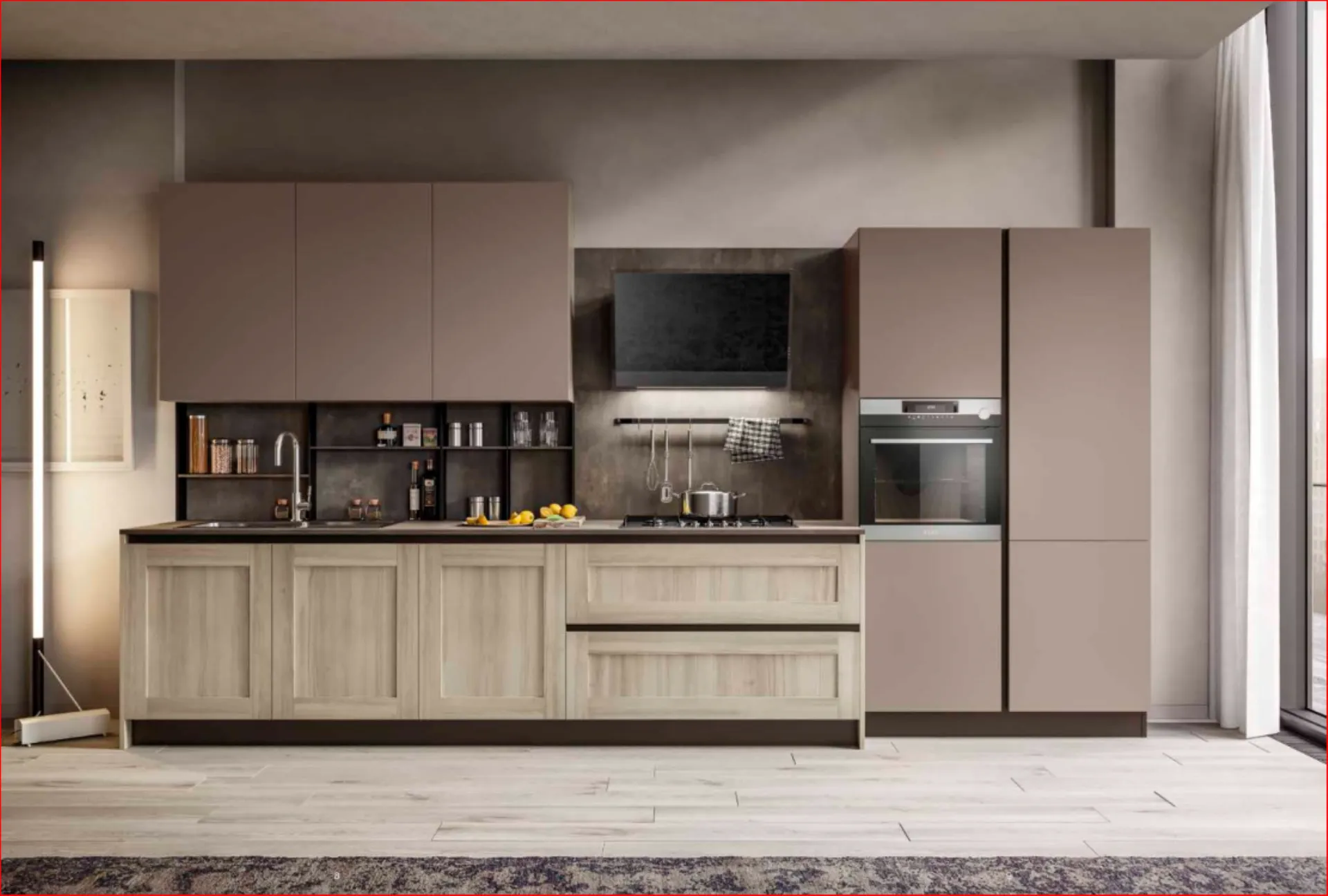 Cucina Cloe con ante laccate opaco UV Eccimeri che offrono una finitura ultra-opaca e setosa con eccezionale resistenza a graffi e impronte. Le basi a terra con piano top profondità cm.70 danno modo di inserire elementi in metallo con mensolina sottopensile aggiungendo ulteriore spazio anche nelle composizioni più piccole. Proposta con altezza cm. 216 per le colonne e cm.240 per i pensili in modo da dare movimento alla composizione. Completa la cucina lo schienale in laminato a tutta altezza al posto delle piastrelle