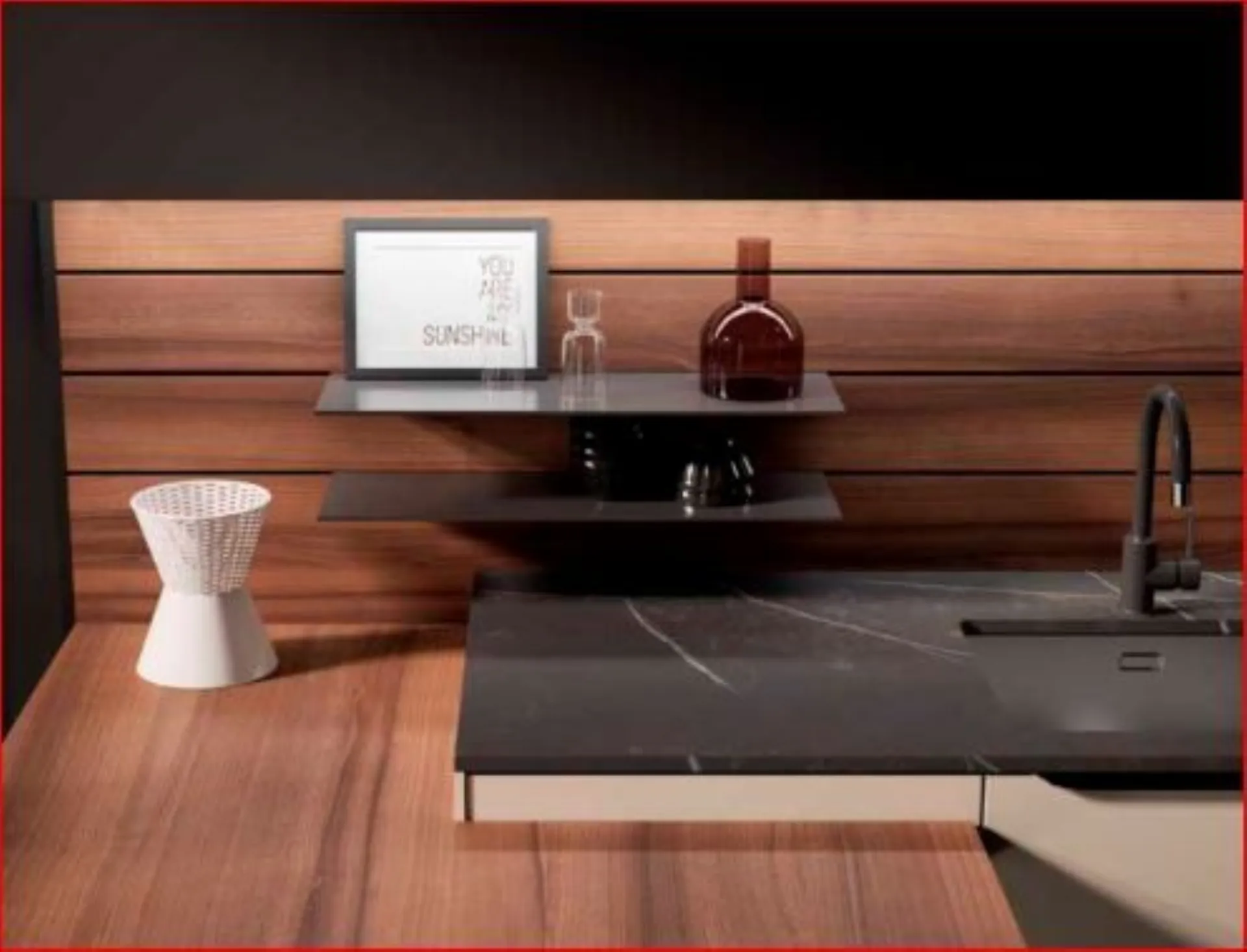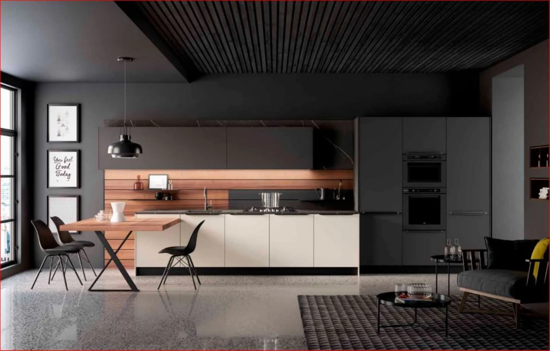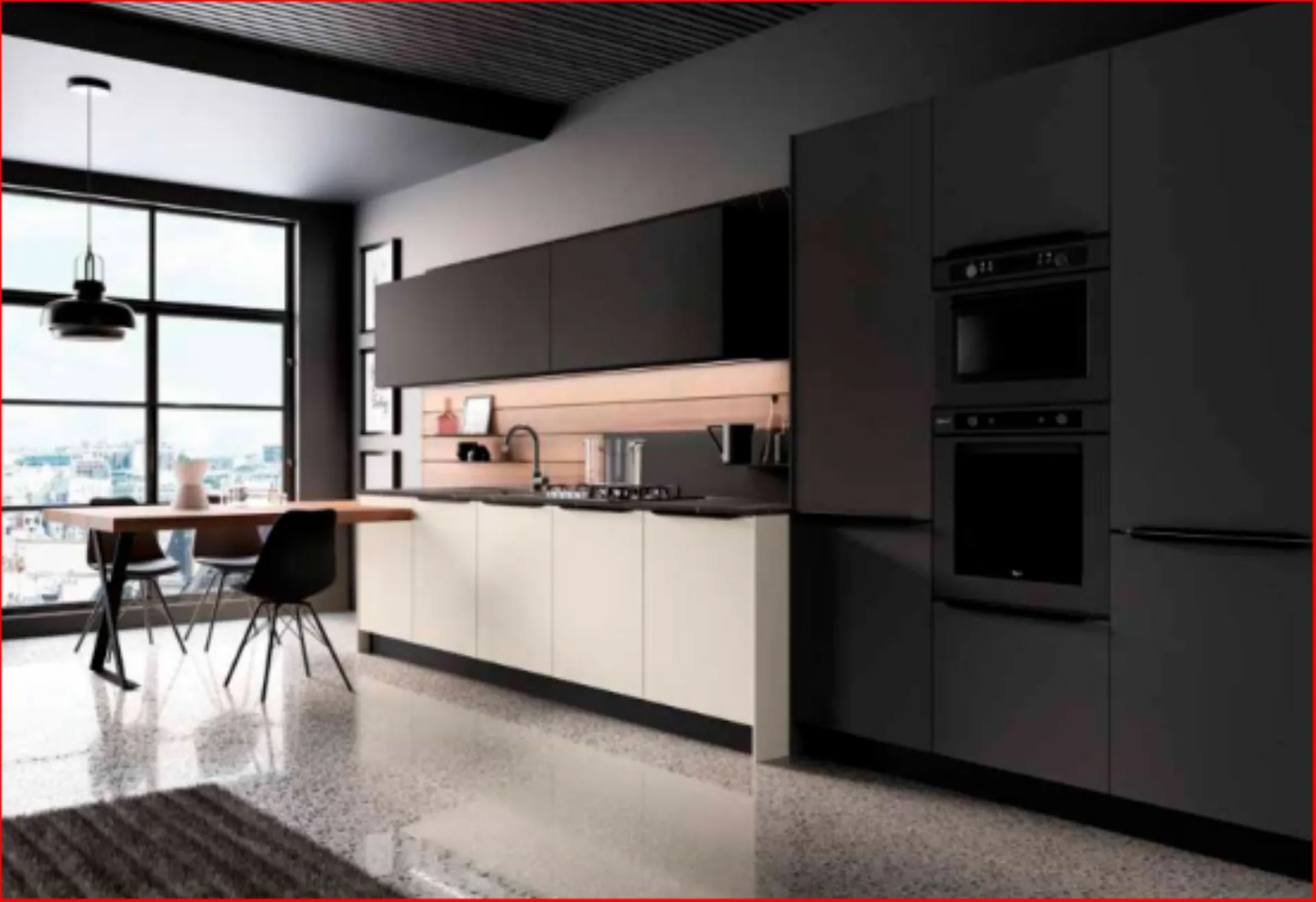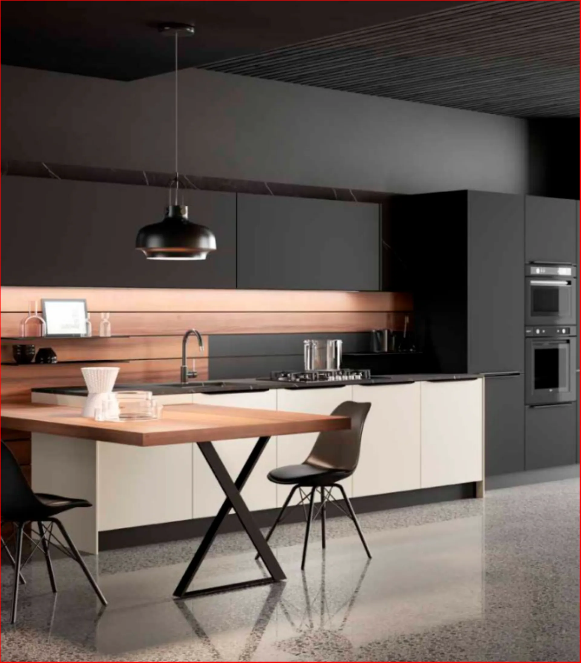 Per questa cucina Kali dai toni scuri del laminato PET Lavagna Opaco e al laminato Noce America per schienali e piano snack, il risultato è una composizione moderna e dl carattere deciso, la cui personalità e rafforzata dalla maniglia Riga in metallo finitura Titanio . Piano top in laminato ad alta resistenza con lo schienale retro cottura in laminato Vulcano, spezzano la continuità delle linee.