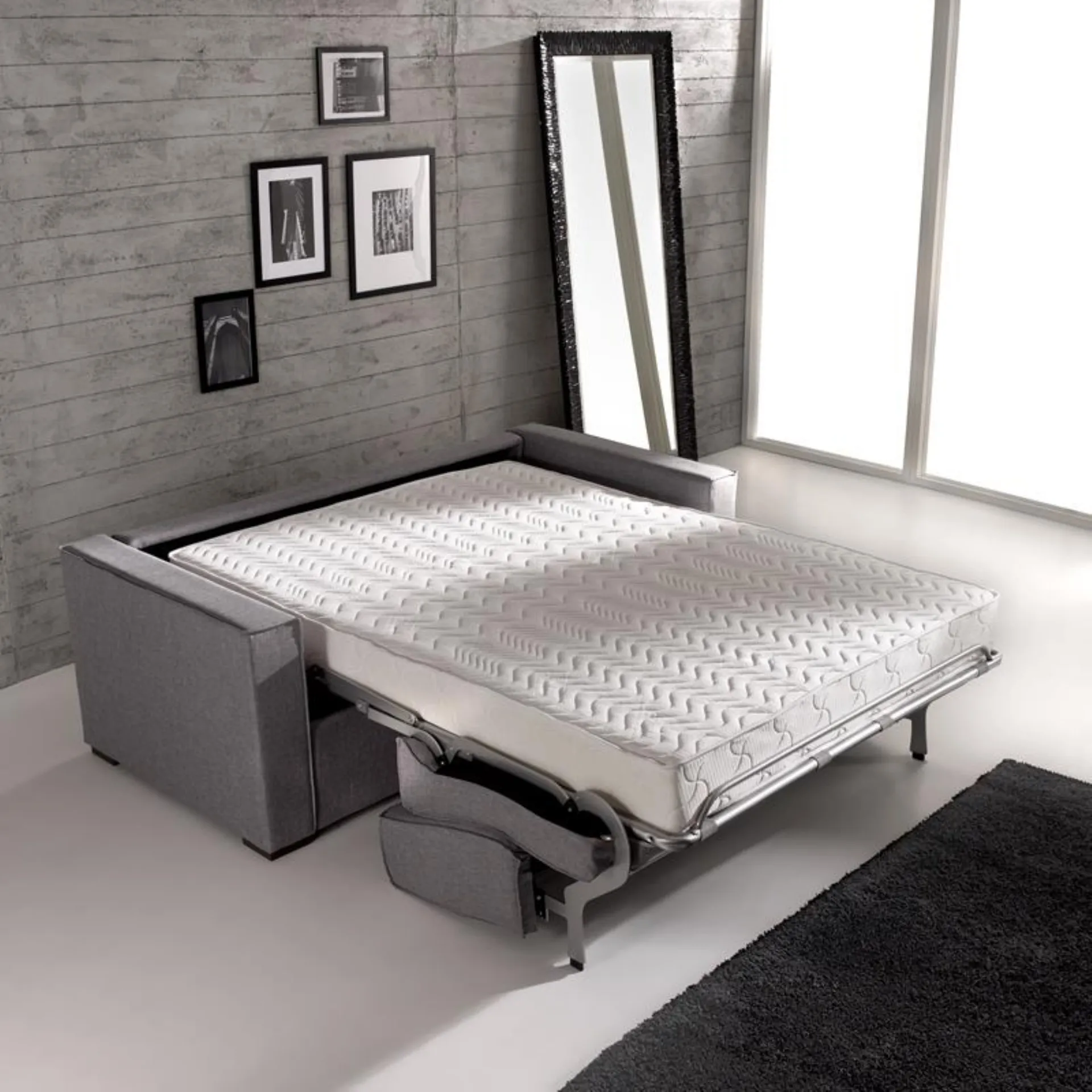 Divano letto trasformabile in tessuto con struttura in particelle di legno - rete in maglia di ferro elettrosaldata. Materasso H18 in espanso circa con memory foam sfoderabile, anallergico, antiacaro e lavabile in lavatrice. Imbottitura dei cuscini di seduta e schienale in poliuretano espanso completamente sfoderabile. Viene fornito con piedini in plastica color alluminio di serie. Portacuscini di serie. Divano letto di lunghezza 195cm, con finiture a scelta, disponibile a €1.200,00. Divano letto disponibile anche in lunghezza 215cm a €1.300,00. Le finiture sono a scelta e la consegna è prevista in 40-50 giorni lavorativi.