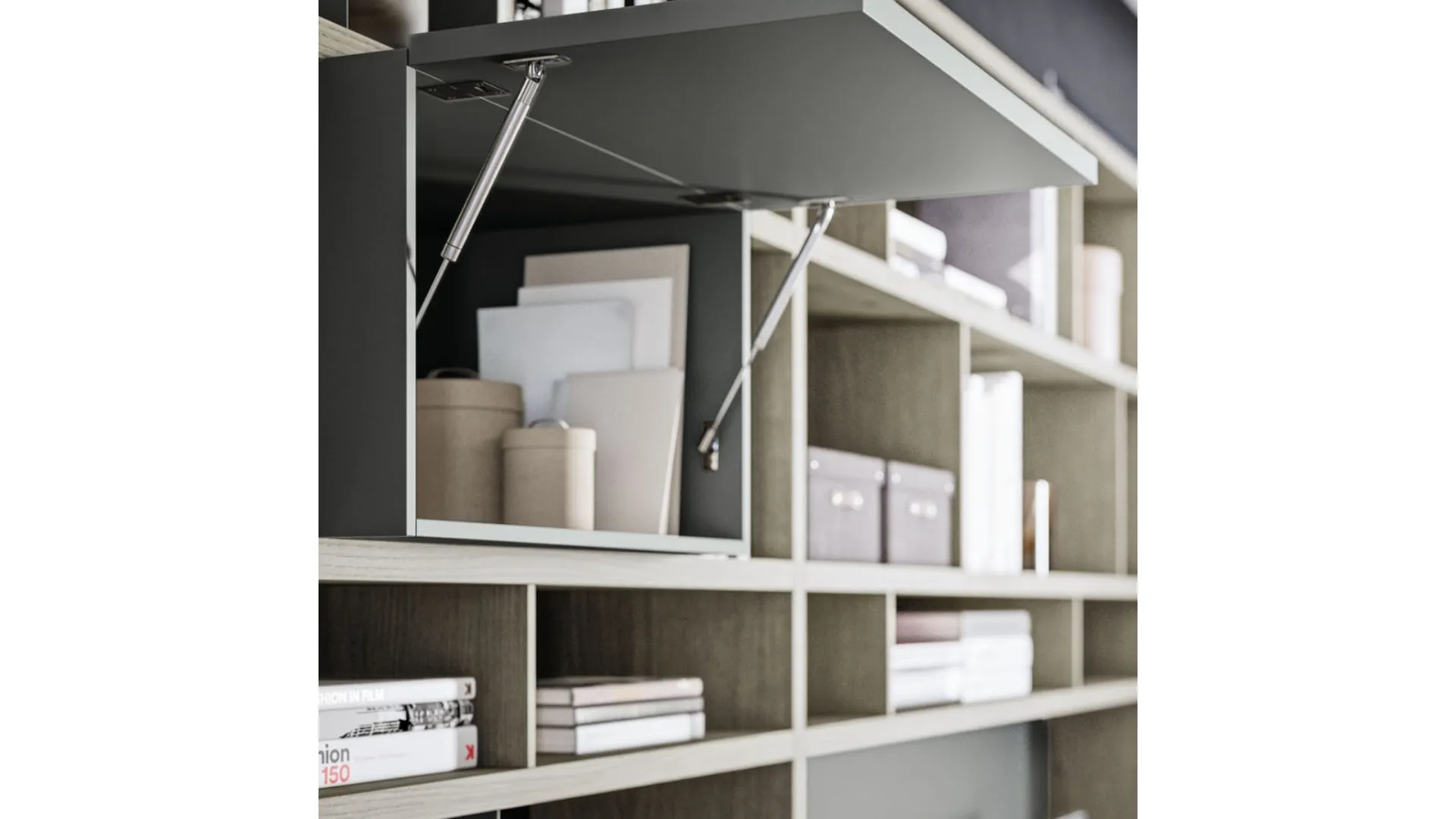 Fra i vani a giorno della libreria con porta TV, i contenitori laccati con apertura push–pull rappresentano degli elementi al tempo stesso funzionali e decorativi, come dei volumi pieni all’interno di una griglia grafica. L’ambiente è completato da un pensile con una particolare texture superficiale. La composizione misura 333 cm di Lunghezza, 224.3 cm di Altezza e Profondità tra 35 e 42 cm. Libreria Orizzontale con pensili per vano Libreria, Consolle porta TV, divisori in metallo laccato opaco Piombo. Il prezzo con finiture Frassino Ossidato, laccato opaco Piombo, Maniglia Push Pull come in foto, è di 2.550,00€, finiture personalizzabili. Su richiesta è possibile avere la composizione con finiture esclusivamente in Laminato Materico a 2.250,00€. Articolo su ordinazione, il montaggio non è compreso nel prezzo. Per info 340 0557150, Jhonny.