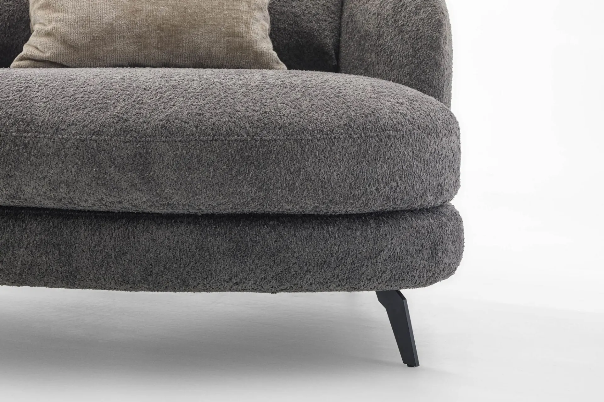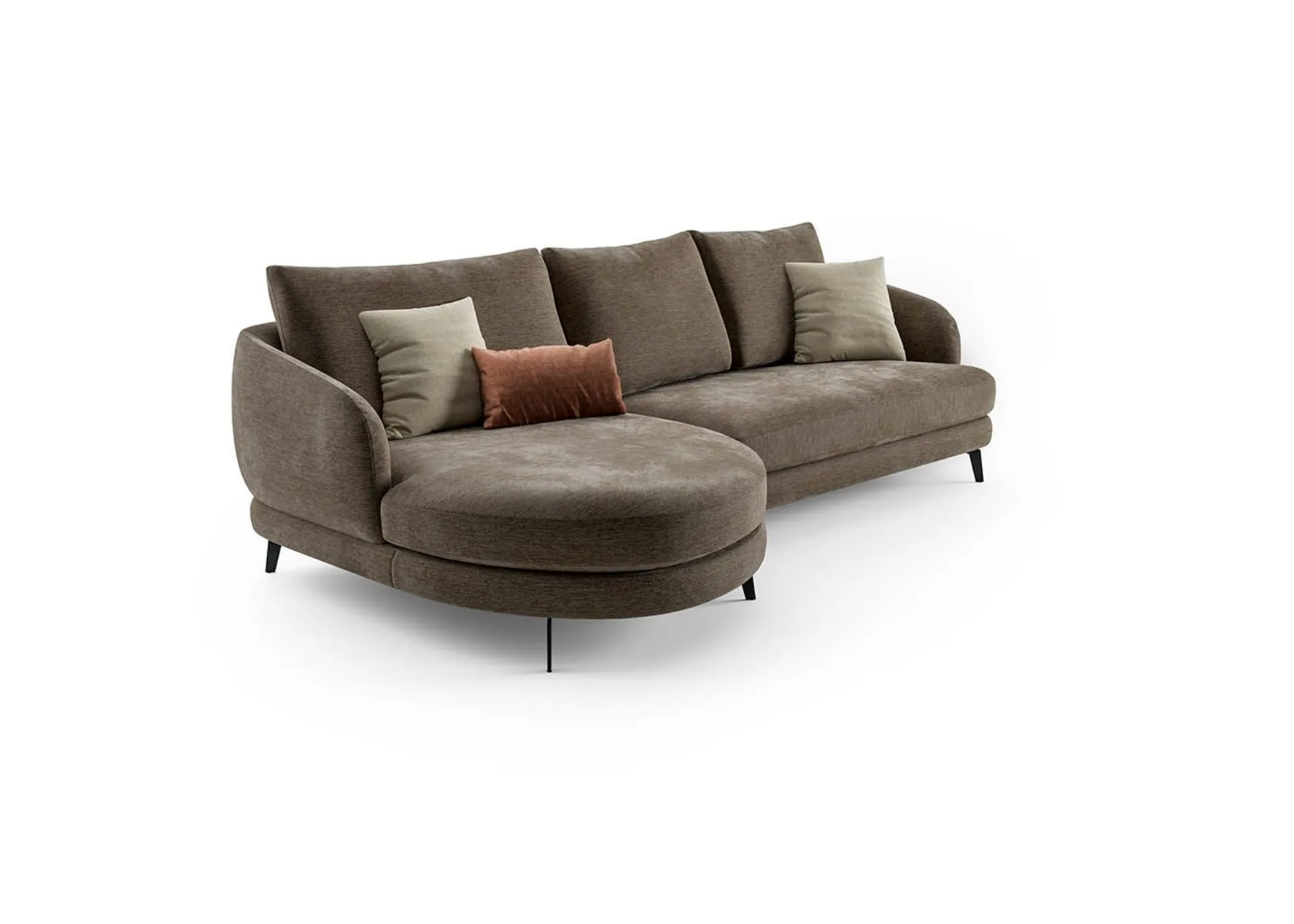 Le linee morbide della struttura disegnano volumi equilibrati e contemporanei, mentre il profilo slanciato dato dal design dei piedini alti in metallo alleggerisce lo spazio, trasformando il divano in un elemento architettonico elegante e adatto sia ai living moderni e che a quelli più classici.
