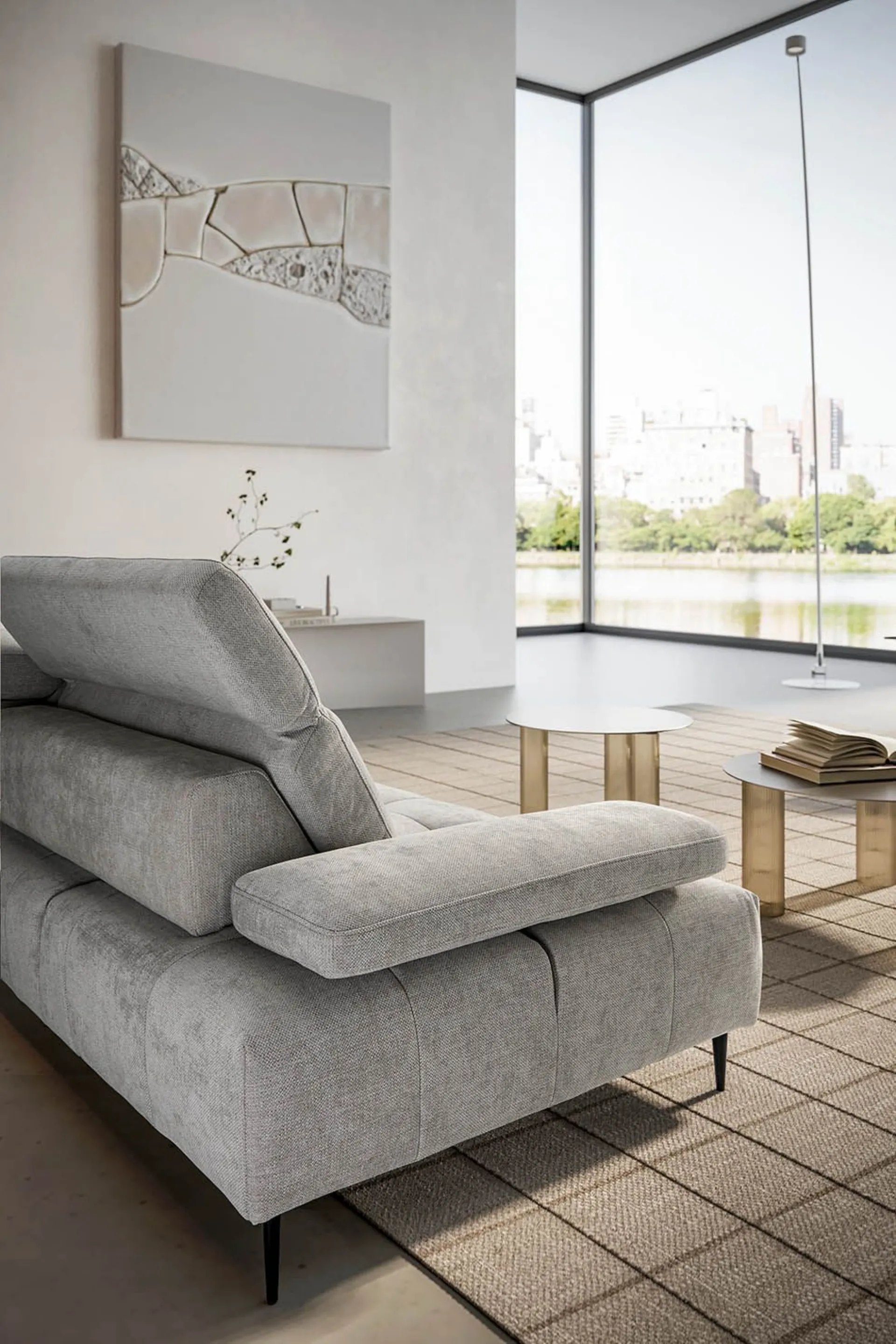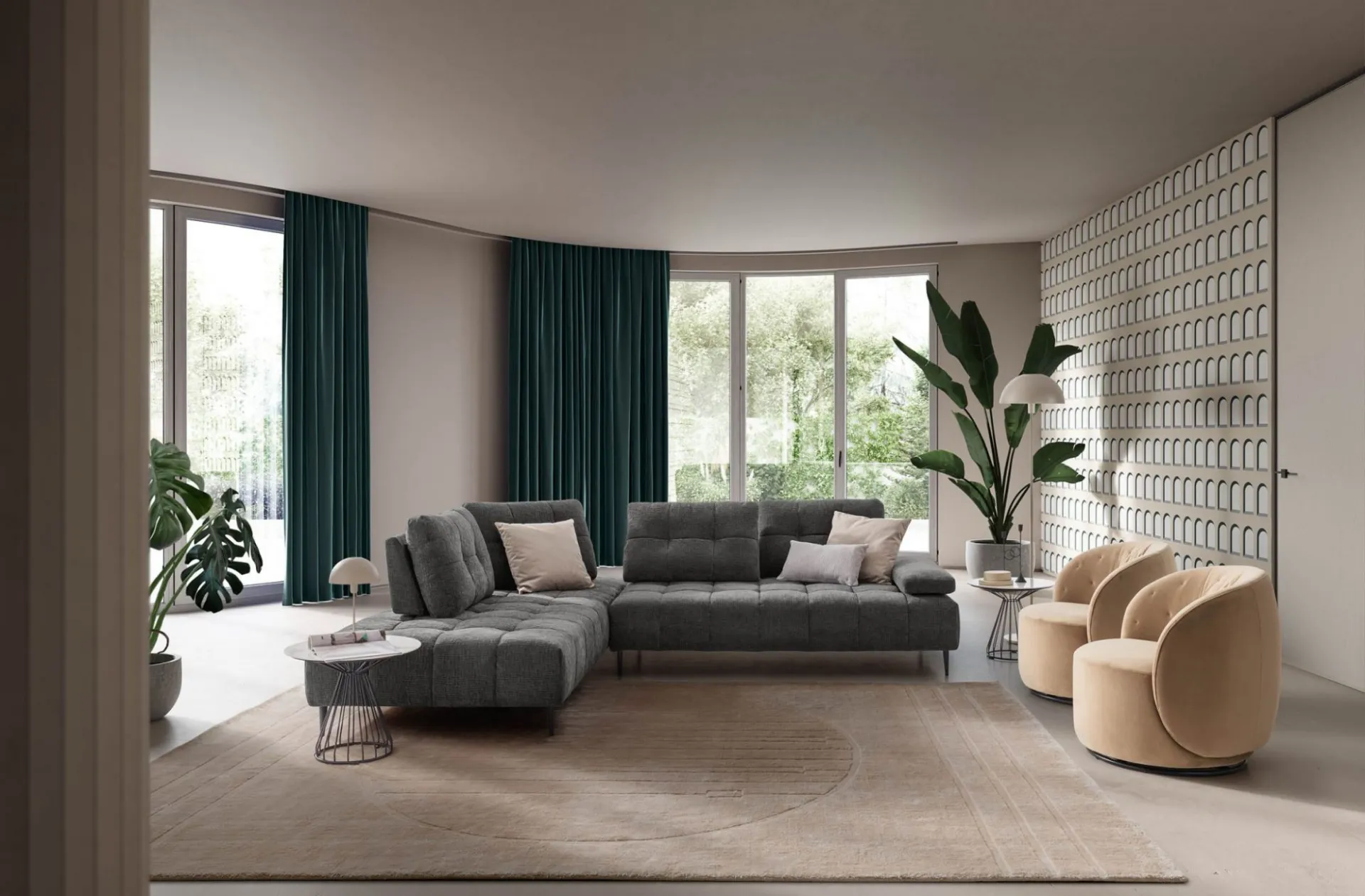 Il profilo è slanciato dai piedini alti 15 cm che alleggeriscono i volumi complessivi, mentre la seduta ampia in Tecnoform – un sandwich di poliuretani indeformabile con inserto in memory foam – invita al comfort profondo, ideale tanto per la conversazione quanto per i momenti di riposo.