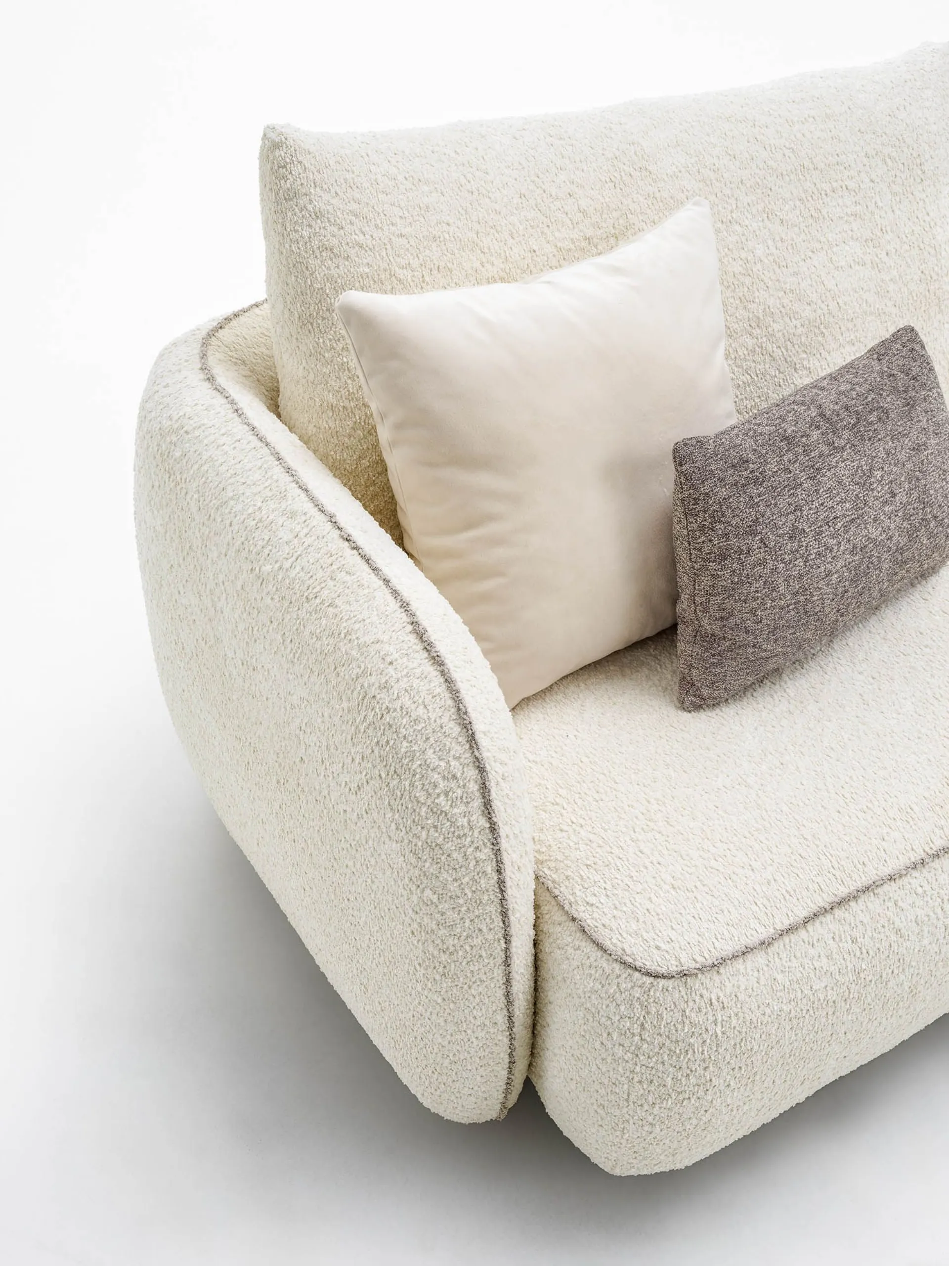 I terminali tondi, insieme ai moduli sagomati e agli elementi a 45°, trasformano il divano in un elemento quasi scultoreo e disegnano traiettorie dinamiche che spezzando la linearità e conferiscono ritmo e unicità all’ambiente.
