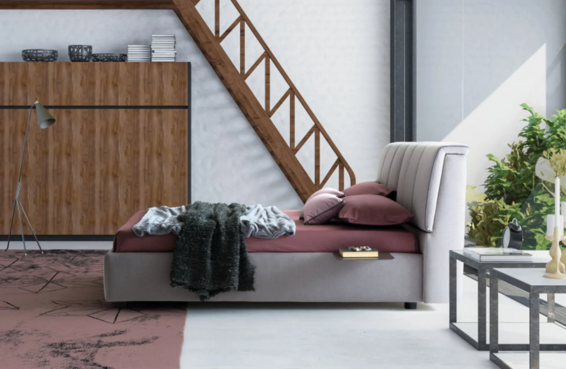 Questo letto dal profilo lineare e armonioso rivela con sorpresa l’intraprendenza insita nel più moderno concept dell’arredo; la morbida testiera, impreziosita in superficie da simmetriche cuciture verticali, abbandona la consueta staticità per svelare il funzionale vano porta oggetti posteriore, preziosa e intelligente soluzione salvaspazio dall’intuitivo meccanismo.