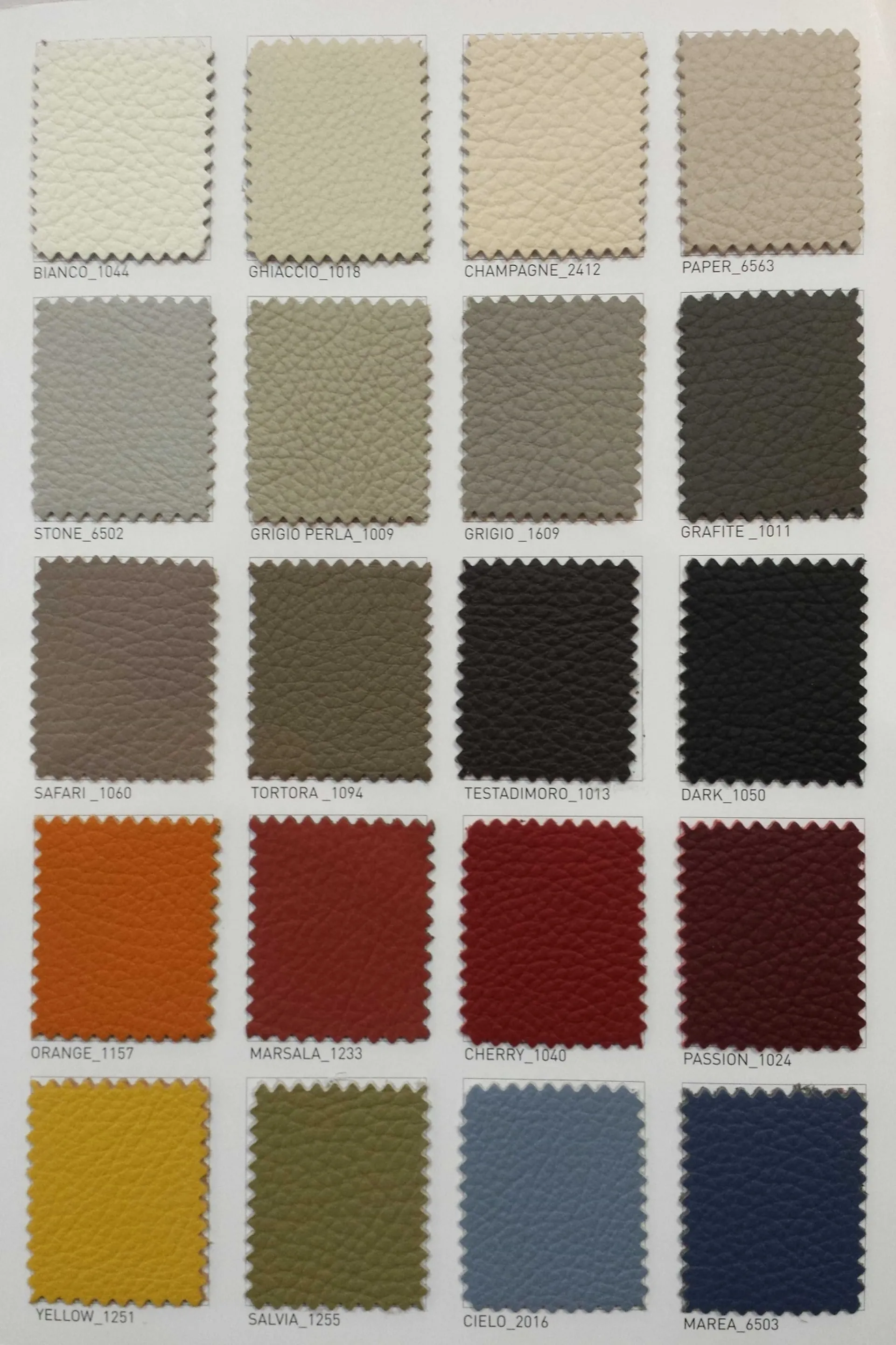 Sedute: densità 35 kg/mc. Termofalda da 200 gr/mc. Elementi di sostegno movibili: densità 30 kg/mc. Termofalda da 200 gr/mq. Cuscini con rullo: densità 23 kg/mc. Termofalda da 450 gr/mq. Rullo: densità 40 kg/ mc. ricoperto da una termofalda di dacron da 100 gr/mq. Imbottiture di completamento: densità 21 kg/mc.