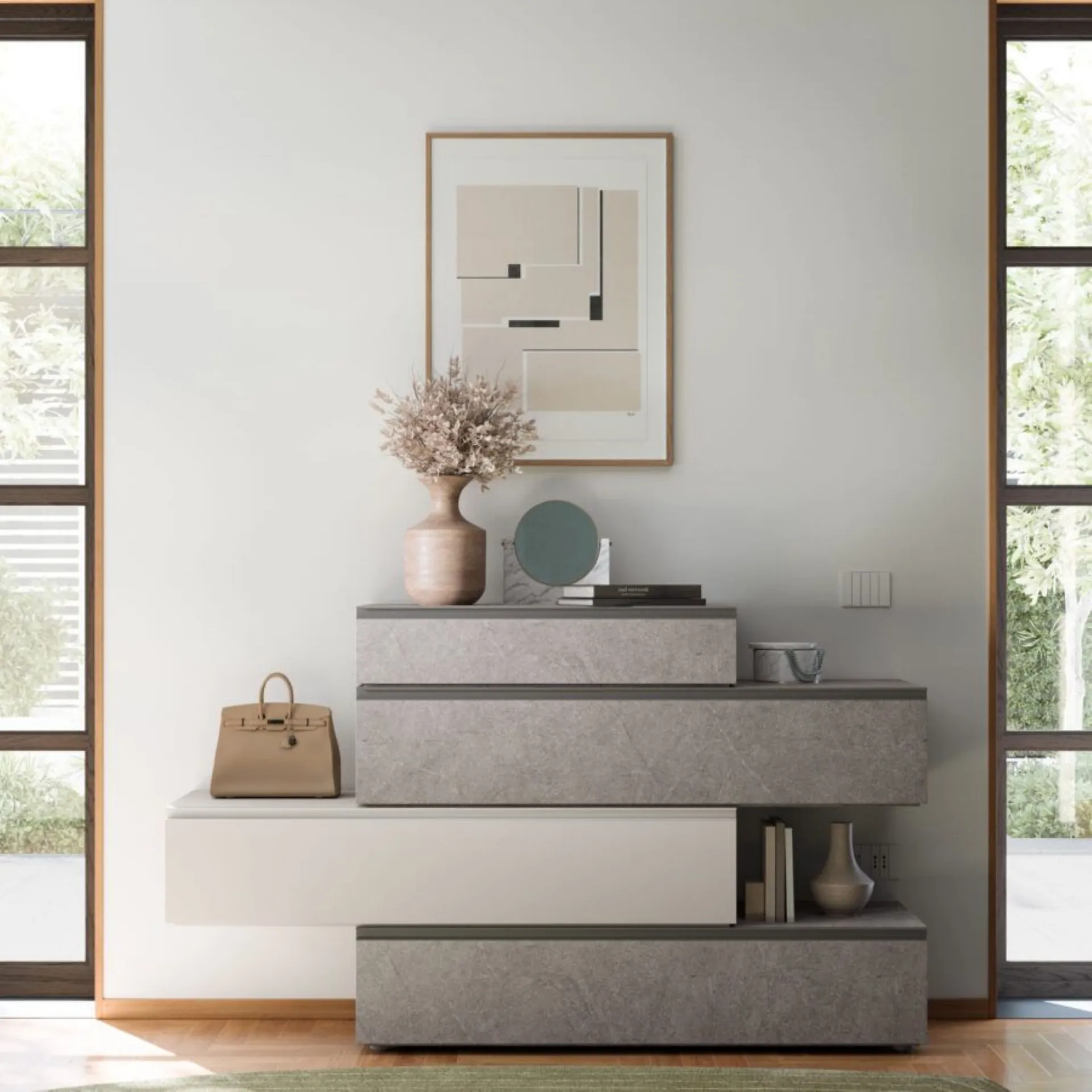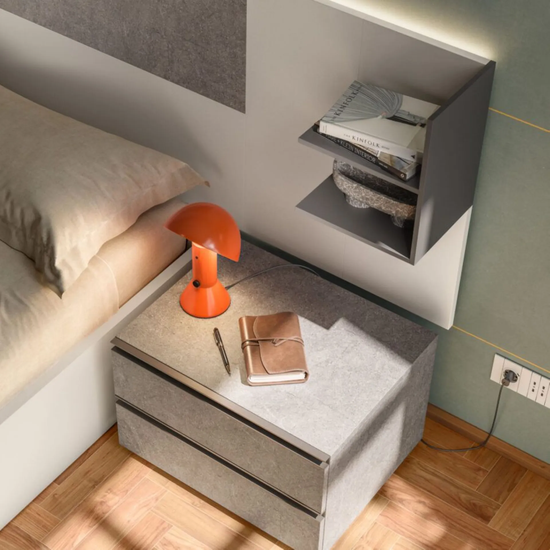 Le nuove collezioni notte ed armadi di Orme interpretano con sapienza, creatività e sartorialità uno stile d’arredo e di vita, in armonia fra contemporaneo e moderno. Sistemi componibili, sistemi modulari, da declinare allo spazio. Soluzioni su misura, ampia gamma di colori e finiture, ricercate e selezionate, lavorazioni speciali al fine di garantire risultati impeccabili, all’insegna della soddisfazione del cliente e del rispetto dell’ambiente. Boiserie Giako Basic in Seta e Roccia Bolsena, casellario in Lavagna, giroletto Alfa H.330 in Seta. Gruppo Bravo in Seta e Roccia Bolsena con maniglie Tratto in Lavagna. Armadio scorrevole Terna in Seta e Roccia Bolsena, attrezzato con ripiani, tubi appendiabiti e cassettiera interna. Struttura interna in Cotone. l.280 h.258. Consegna compresa nel prezzo, 40 giorni lavorativi. La nostra offerta per questa camera matrimoniale è di euro 4.500,00 compreso iva e trasporto, escluso rete, materasso e montaggio. Per maggiori informazioni contattaci via mail o passa nel nostro showroom.