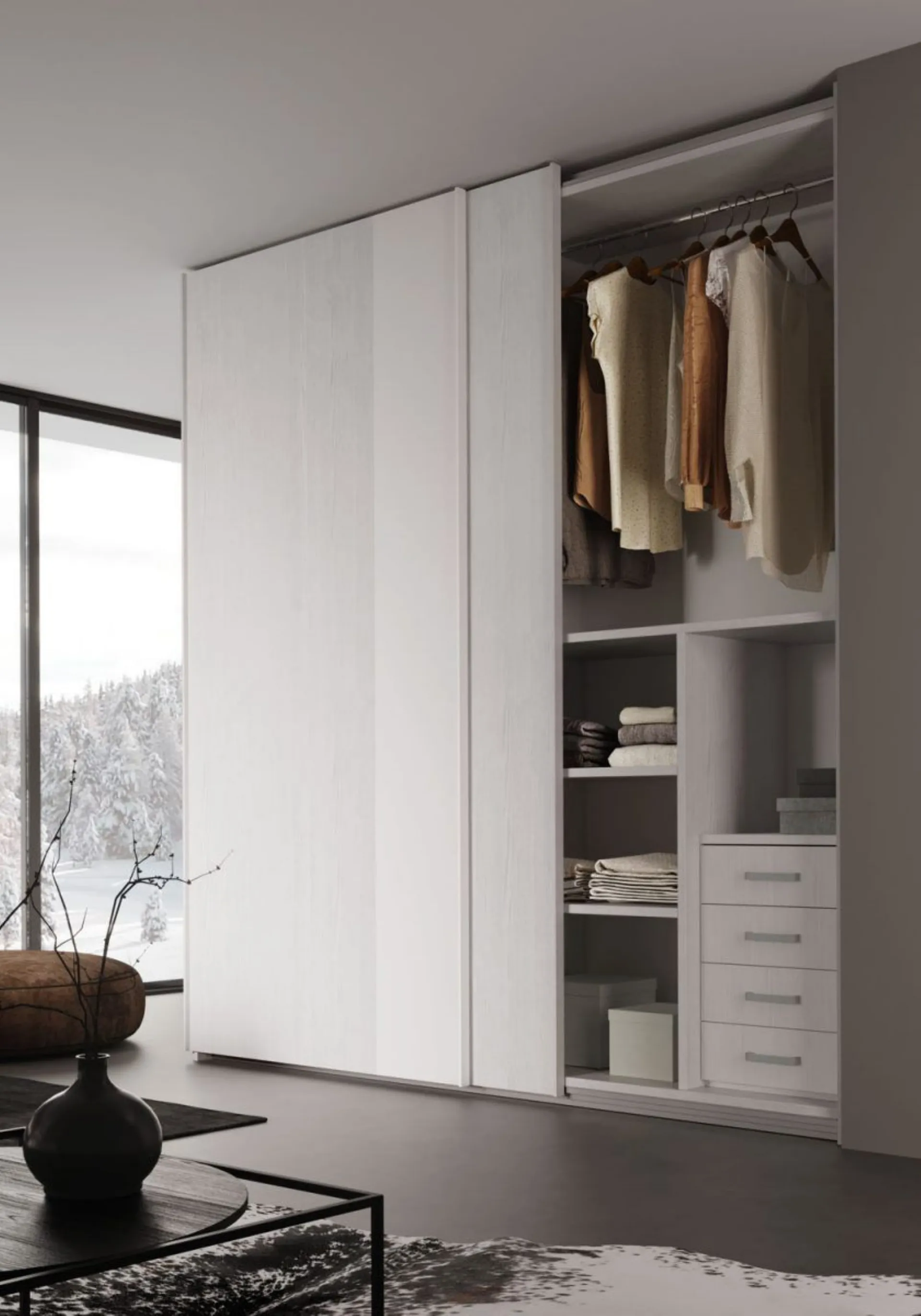 1 armadio ( lunghezza 238.9cm, altezza 258 cm, profondità 61.3 cm ) con due ante scorrevoli in finitura frassino sbiancato, inserti su ante e maniglioni in tinta bianco