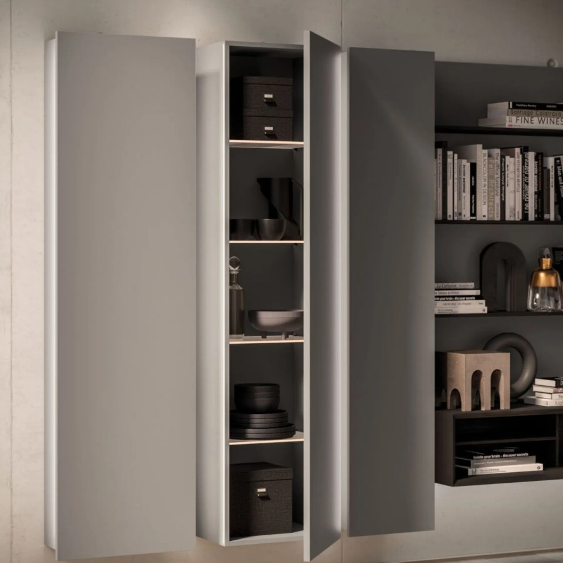 Verticalità e orizzontalità si incontrano, in questa composizione che risolve lo spazio giorno con una certa originalità, mantenendo una gradevole compostezza stilistica. Linee e volumi creano un gioco ritmico che da personalità all’ambiente. Pensili Sipario in finitura laccato opaco Titanio. Boiserie orizzontale in laccato opaco Titanio con mensole in materico Carbone. Dimensioni composizione: Larghezza 320cm, Altezza 185cm, Profondità 48cm. Spedizione compresa nel prezzo in tutta Italia 40-50 giorni lavorativi. La composizione ha un prezzo base laminato di euro 1.900,00. Personalizzando con materiali legno e laccati come in foto l'offerta è di euro 3.100,00. Per maggiori informazioni e preventivi contattaci via mail.