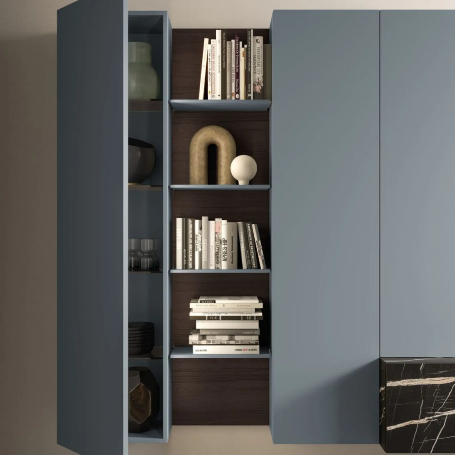 Le venature del legno fanno da sfondo e si contrappongono alla finitura marmo e alla finitura laccata, in un piacevole equilibrio di volumi pieni e linee sottili. L’illuminazione si integra con intelligenza nel design, soddisfando le esigenze del presente. Pensili Sipario in laccato opaco Nebbia e basi sospese Modulo in melaminico marmo Tunisi. Boiserie orizzontale in materico Carbone e mensole in laccato opaco Nebbia. Dimensioni composizione: Larghezza 360cm, Altezza 185cm, Profondità 48cm. Spedizione compresa nel prezzo in tutta Italia 40-50 giorni lavorativi. La composizione in laminato ha un prezzo base di euro 2.500,00. Personalizzando con materiali legno e laccati come in foto l'offerta è di euro 2.900,00. Per maggiori informazioni e preventivi contattaci via mail.