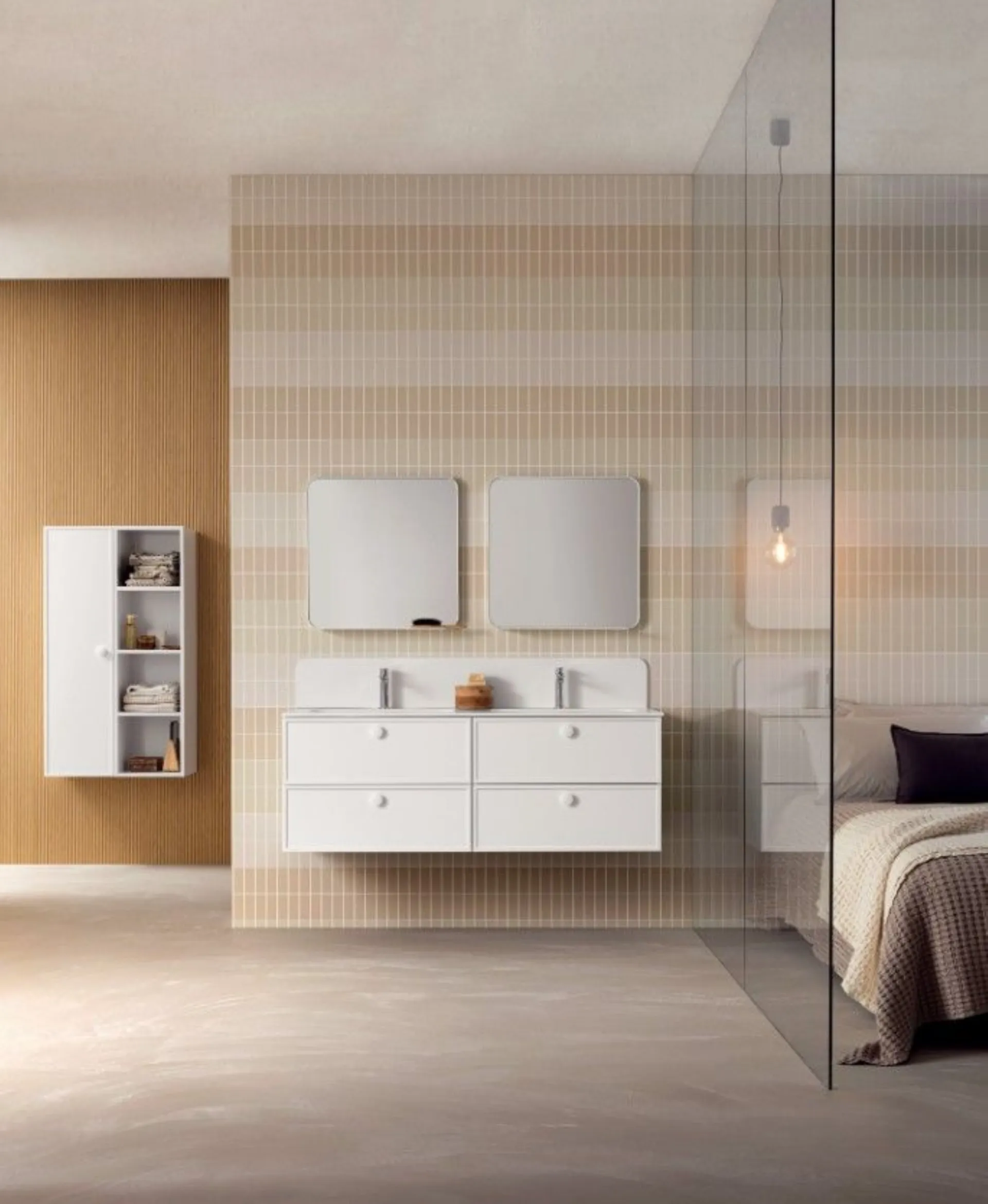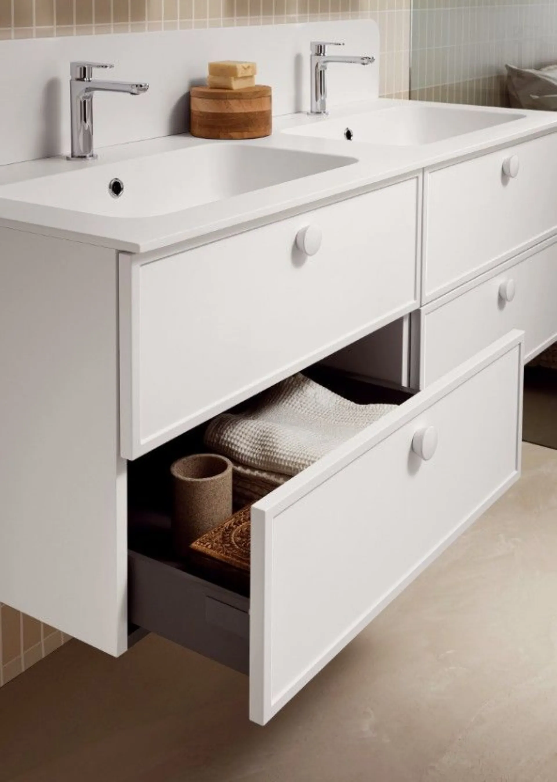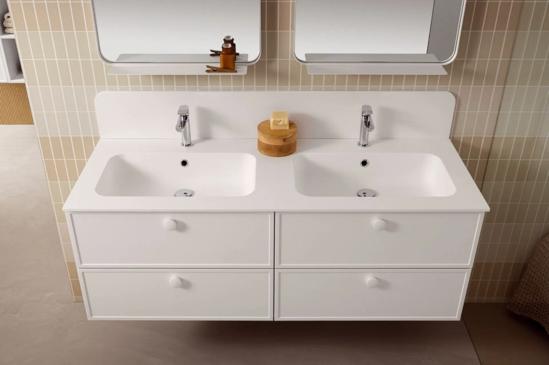 Bagno mod. PICTA composizione 02 con frontali in Laccato Opaco, piano in Mineralguss Bianco opaco con 2 vasche integrate . Composizione l.1140.5 per base e l.70 per pensile. Possibilità di personalizzarlo con varie misure e colori.