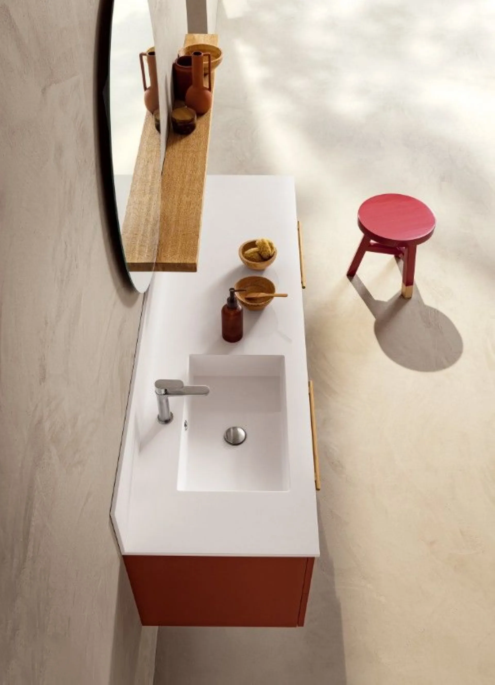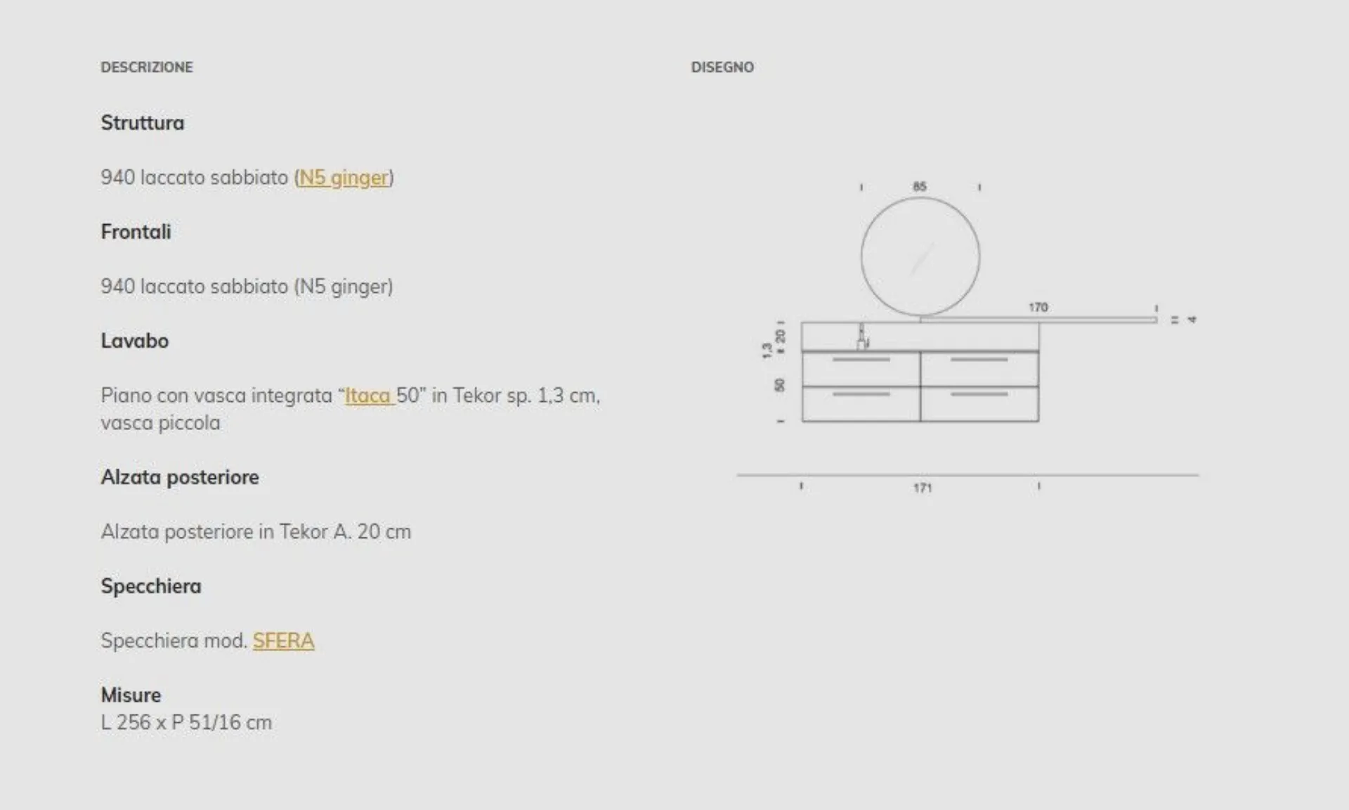 Bagno mod. PICTA composizione 07 con frontali in Laccato Opaco, piano e lavabo integrato in Tekor sp.1.3 compreso alzata a muro . Composizione l.170 e mensola a sbalzo l.85 Possibilità di personalizzarlo con varie misure e colori.