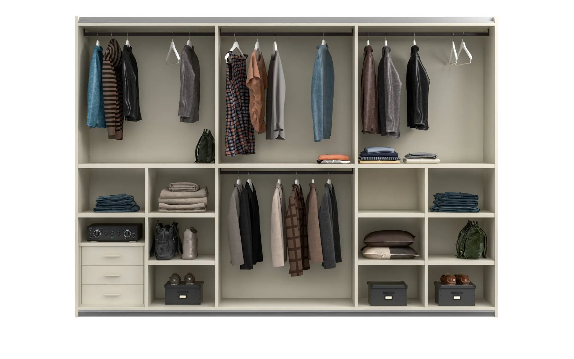 Armadio moderno in laccato opaco con doppia anta scorrevole e banda orizzontale in legno, chiusura assistita, ripiani interni, appendi abiti. Di lunghezza 272cm, altezza 258cm e profondità 65cm, l'articolo è disponibile ad euro 2.100,00, possibiltà di aggiunta cassettiera al prezzo di euro 200,00. Con finiture a scelta, la spedizione varia dai 30 ai 35 giorni.