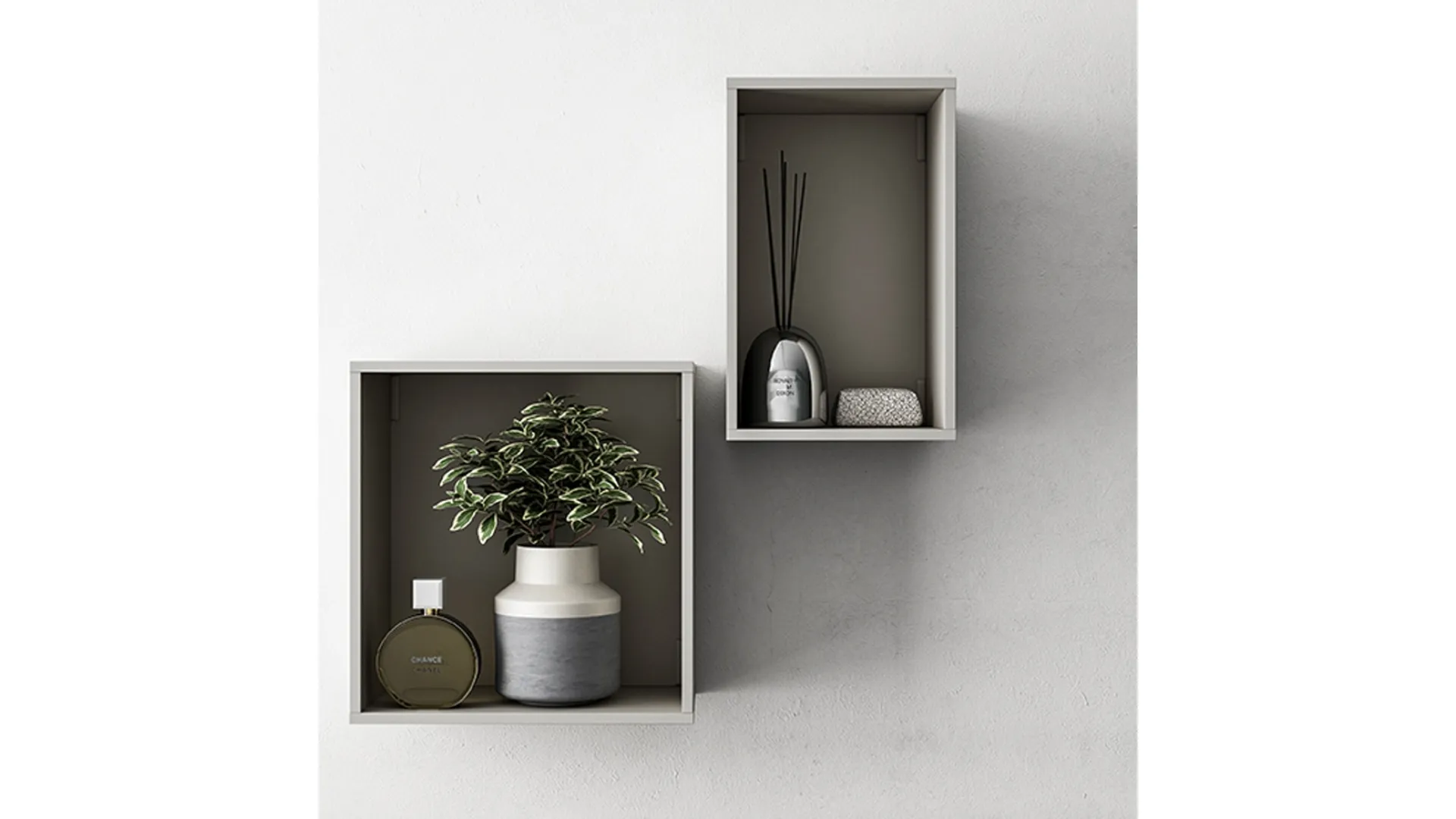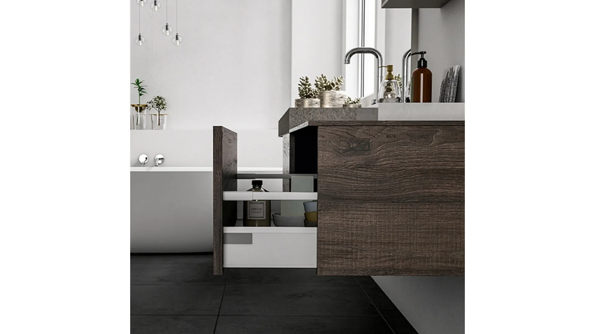Bagno realizzato con linee semplici dal carattere moderno, con laminati di effetti diversi per uno stile ricercato. La vasca è integrata nello spesso piano in laminato effetto pietra che poggia sui cestoni, facili e veloci da aprire con il sistema push-pull.