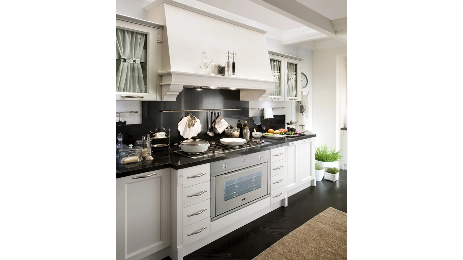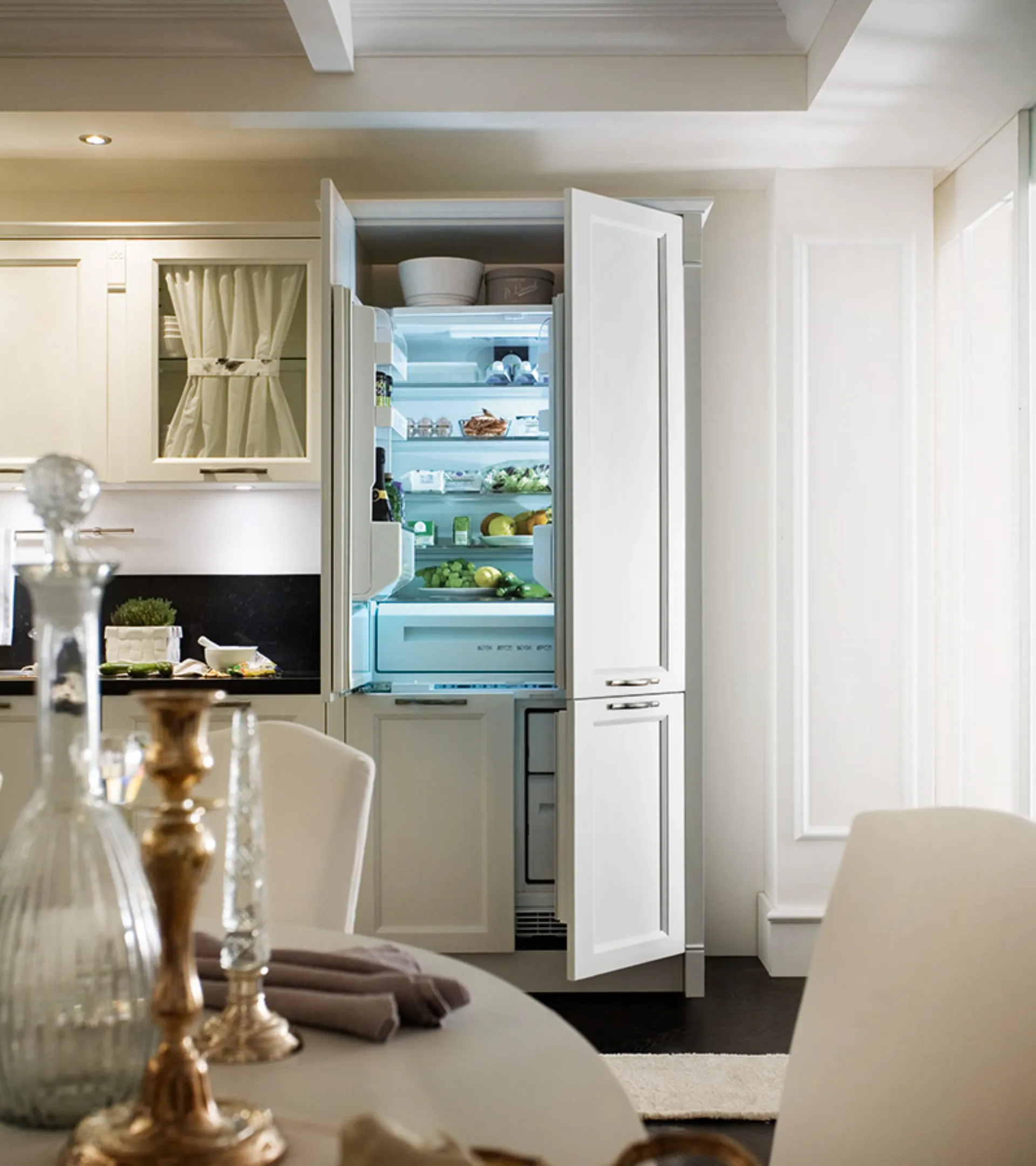 L'atmosfera elegante emerge con forza in tutti gli elementi che contraddistinguono la cucina. La luminosità della finitura Neve conferisce una raffinata continuità tra i diversi volumi. Ogni montante è impreziosito dalle mostrine con fregio.