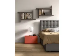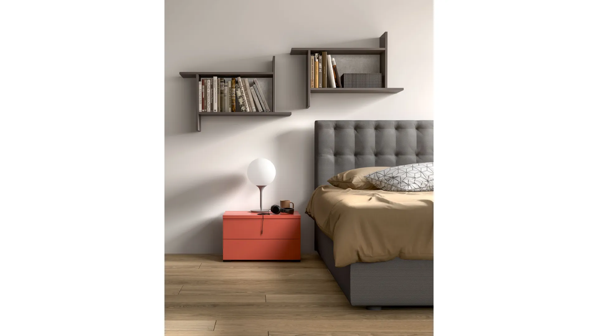 Composizione per ragazzi comprensiva di letto singolo con testera imbottita e rete a doghe, scrivania con libreria e pensili. Sedia per scrivania e materanno sono esclusi. Comoda e spaziosa, questa zona studio è perfetta per stimolare concentrazione e creatività. La combinazione del Rovere Nodato con i colori Papaya – Grafite e la finitura Graphic dello schienale dà carattere e allegria alla stanza. Un’ampia possibilità di combinazioni di finiture per accontentare anche i gusti più esigenti.