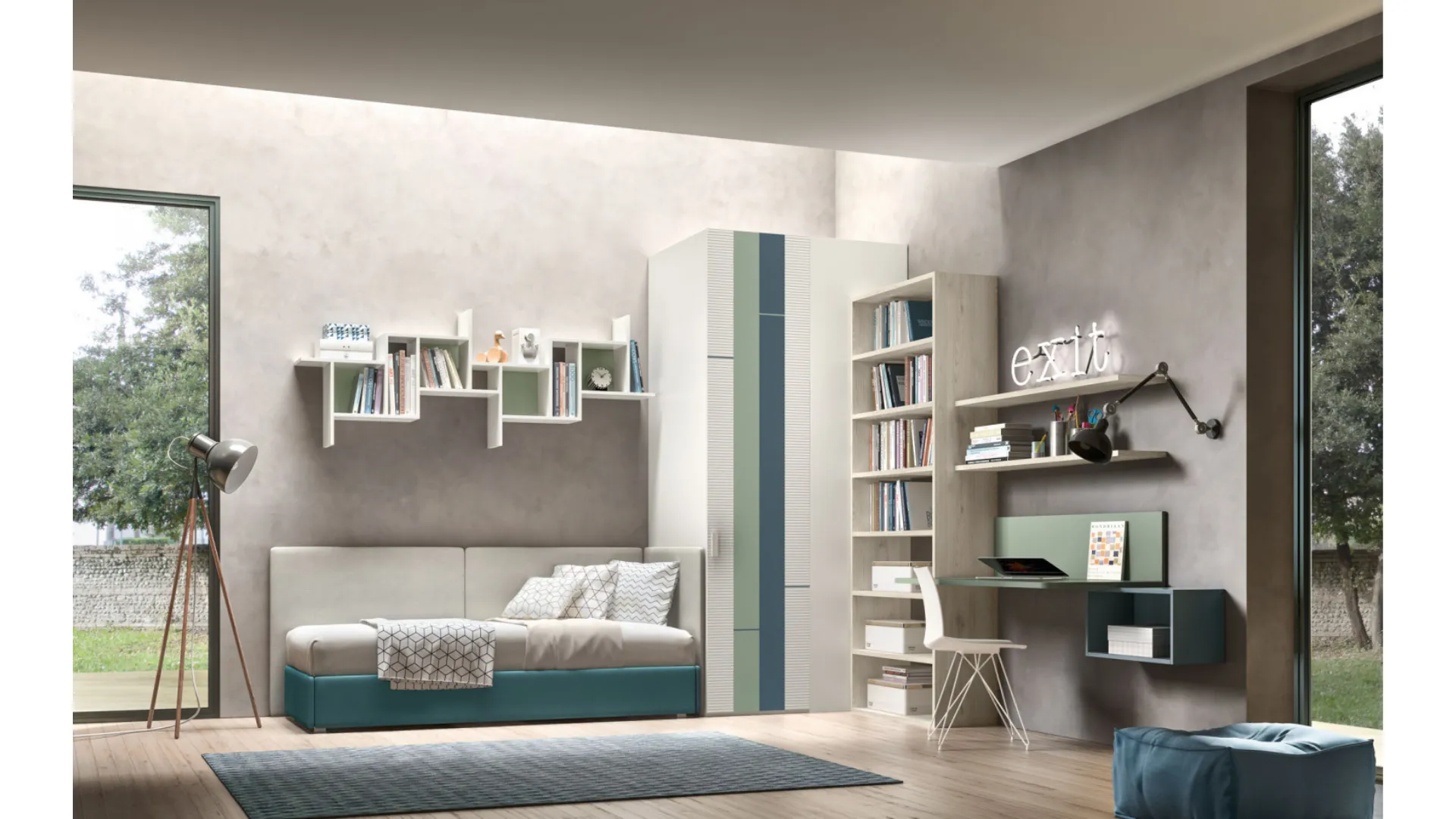 Cameretta per teenager dotata di un letto, con rete a doghe comprese, è un'ampia cabina armadio. L’armadio diventa cabina, un vero e proprio guardaroba dove trovano sistemazione, oltre ai vestiti, un esercito di oggetti e giochi ingombranti. Uno spazio dove il ragazzo può entrare riporre o prendere le sue cose in modo indipendente. Cameretta dotata di pensili a giorno e scrivania sospesa con vano a giorno e una libreria in legno. Materasso e sedia non compresi, le finiture dei materiali sono personalizzabili. Su ordinazione, i tempi per la consegna vanno dai 50 ai 60 giorni lavorativi e la nostra offerta è di €2.600,00. Il montaggio è su richiesta e la consegna disponibile in tutta Europa.