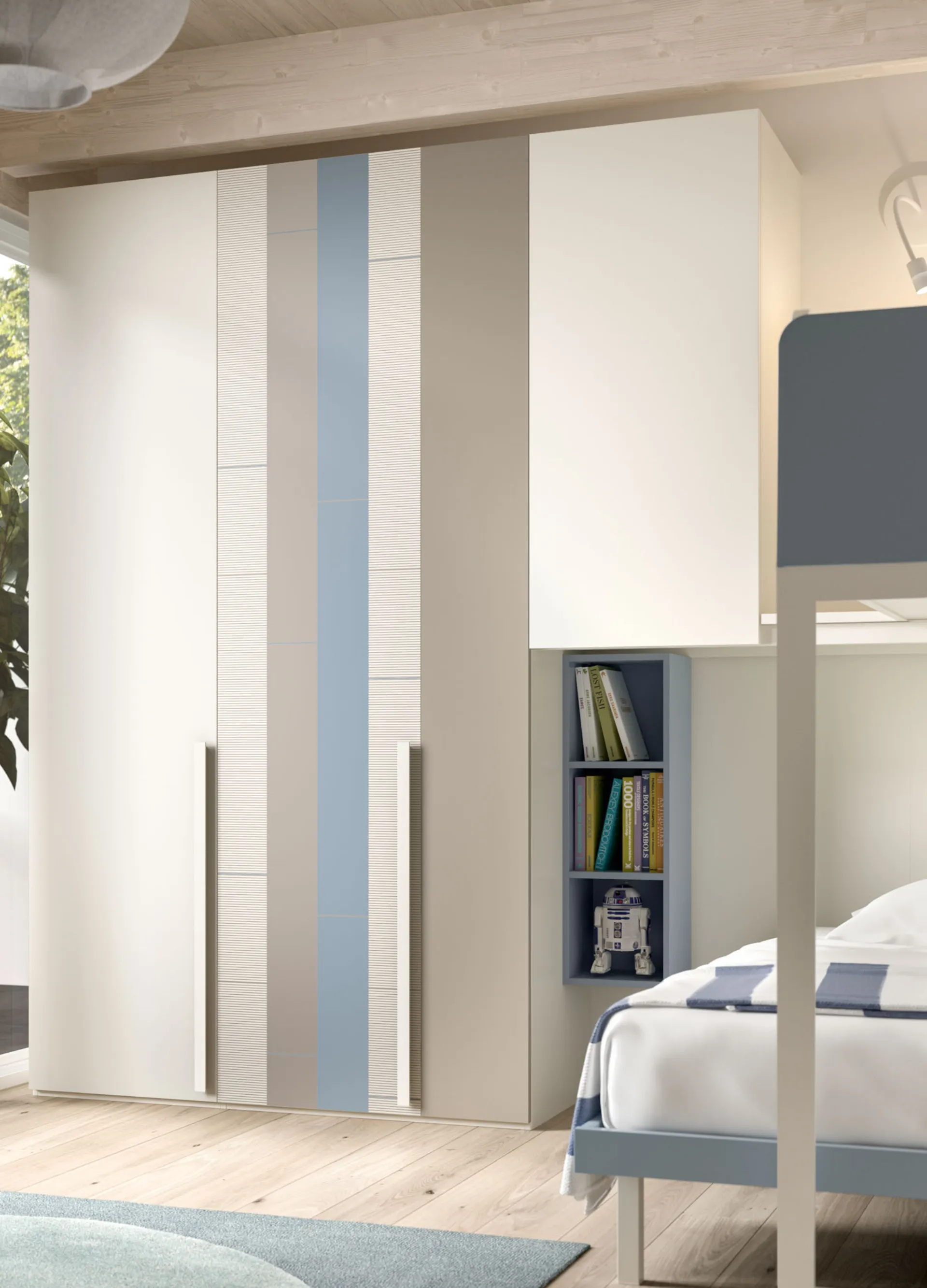 Cameretta con soppalco dotata di due letti con reti a doghe comprese e pensili a giorno. Tre decori, stessa palette colore: novità del catalogo Fantasy! Le due ante dell'armadio si possono personalizzare con tre nuovi decori dallo stile grafico di tendenza. Qui proposti in Avio e Argilla, ma sono disponibili anche altre frizzanti combinazioni colore. Materassi non compresi, le finiture dei materiali sono personalizzabili. Su ordinazione, i tempi per la consegna vanno dai 50 ai 60 giorni lavorativi e la nostra offerta è di €2.900,00. Il montaggio è su richiesta e la consegna disponibile in tutta Europa.