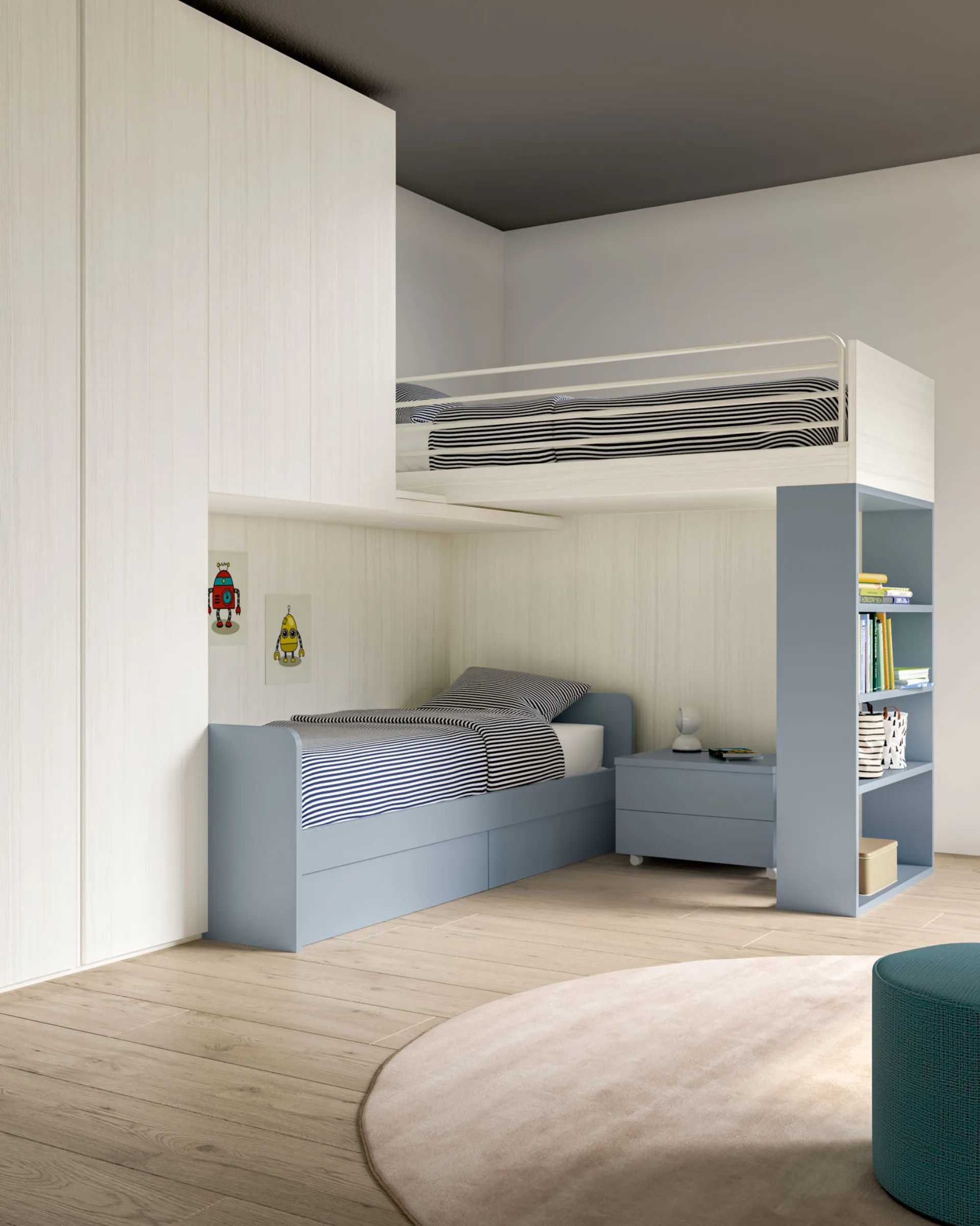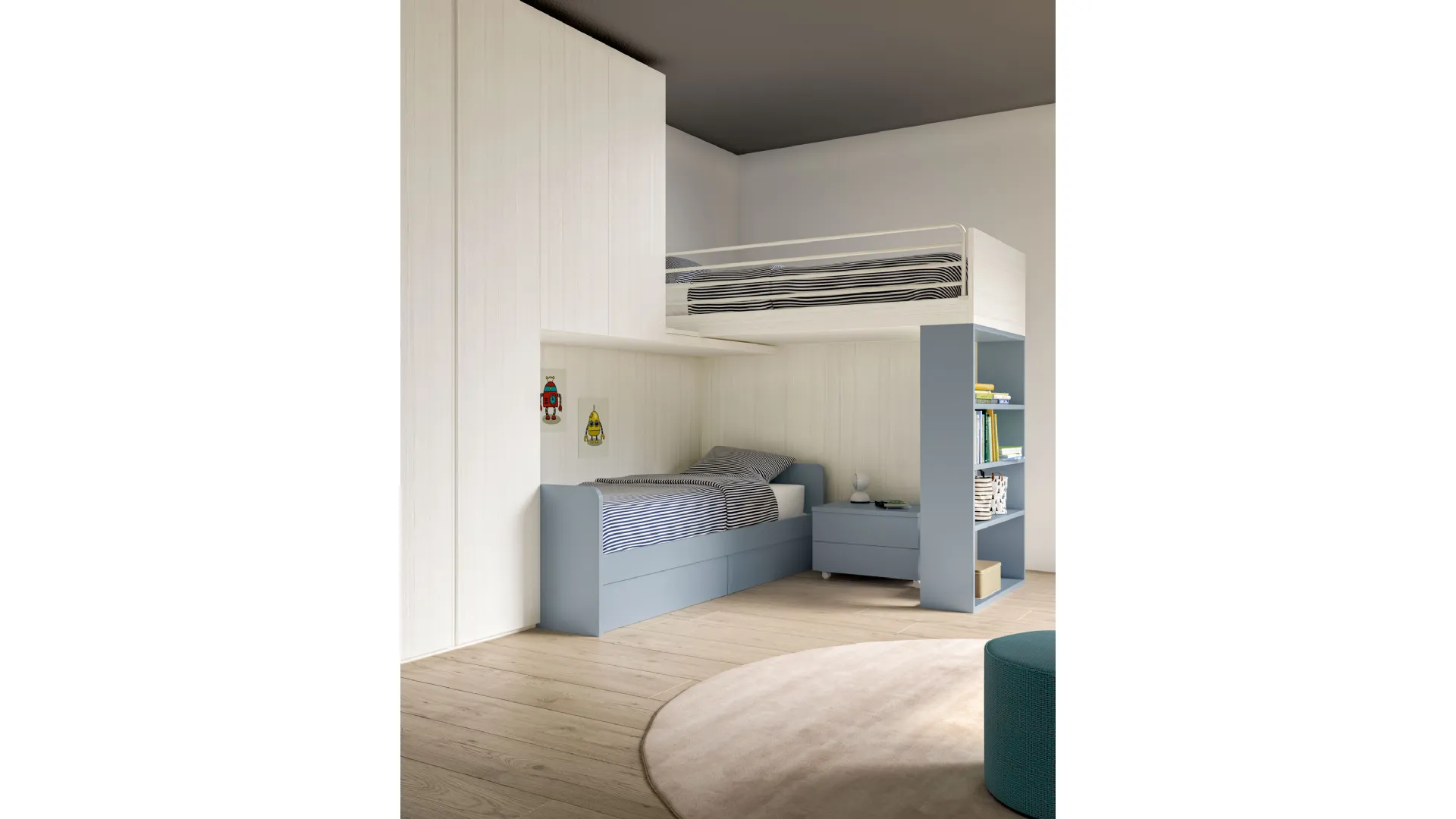 Il letto a castello è un’idea perfetta per vivere la cameretta in modo originale e una soluzione efficiente per risparmiare spazio. È divertente e sicuro grazie a scale studiate perché i bimbi salgano tranquilli, protezioni per non rischiare di cadere e meccanismi a ribalta per riassettare il letto facilmente. Il letto con soppalco permette di adattare l’arredo ad ogni nuovo evento di crescita della famiglia, si presta ad essere spazio gioco o zona scrivania, lasciando sempre aperta la possibilità del secondo letto. Più spazio, più gioco! Camerette prodotte interamente in Italia con materiali certificati e garantiti che rispettano i più rigorosi standard: qualità e sicurezza per la salute dei vostri bambini. Inoltre potrai scegliere tra un'infinita varietà di colori e di composizioni, affidandoti ad un personale esperto e qualificato che sarà in grado di guidarti nelle scelte e di indicarti le soluzioni migliori per i tuoi bambini.