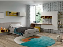 Cameretta per ragazzi con scrittoio di lunghezza 240cm, profondità 50cm e altezza 176cm. Pensili e mensole in legno e, per la zona notte, letto a piazza singola solo rete in versione giroletto con testata in legno e mensole in legno. Letto di lunghezza 200cm e di larghezza 120cm. Cameretta disponibile a €2.600,00. Ante di spessore 22mm e dotati di chiusura rallentata. Finiture a scelta, i tempi per la fornitura variano dai 35 ai 40 giorni.