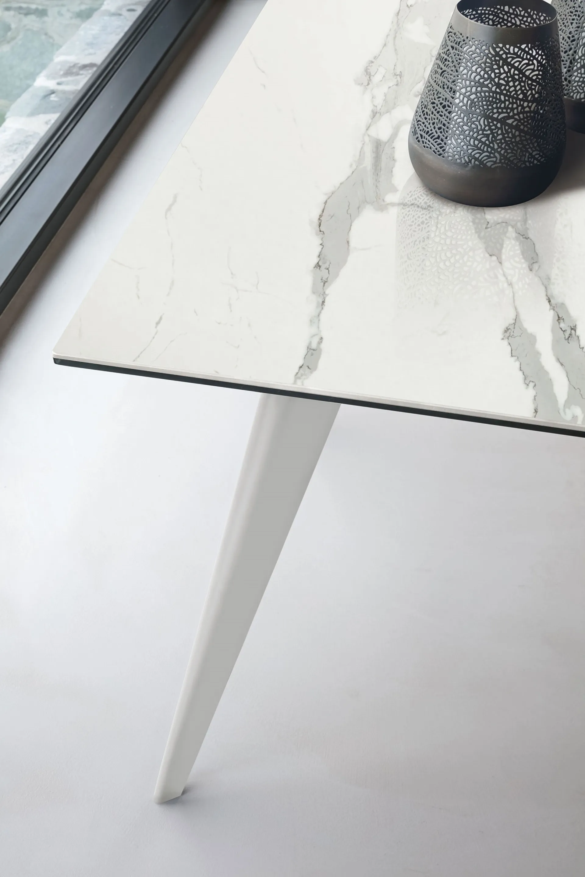 Tavolo allungabile con struttura in metallo verniciato o spazzolato. Piano in gres porcellanato ed allunghe in MDF laccato in tinta con il piano o con la struttura. Lunghezza da chiuso 180cm, lunghezza da aperto 220/260/300cm, larghezza 90cm e altezza 75cm. Finiture di struttura, piano e corsie a scelta, come si vede in foto, la nostra offerta è di €2.800,00.