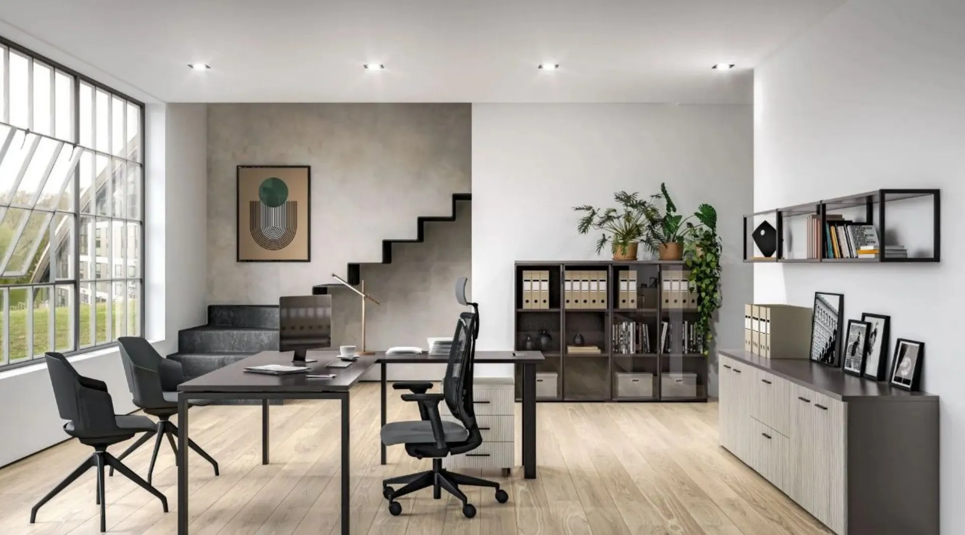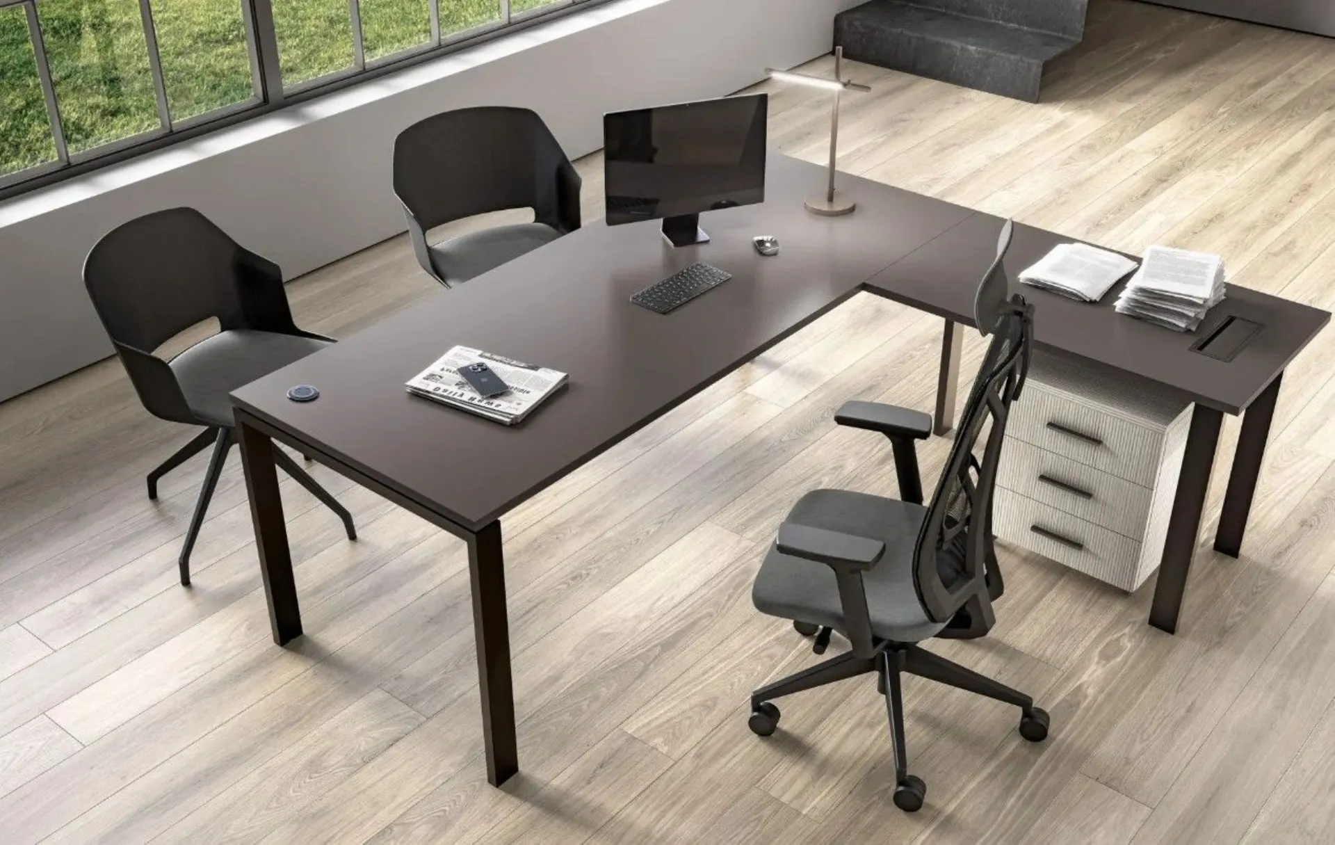 I mobili per ufficio direzionali con piano in Grafite e ante Rigato Grey creano una postazione ordinata e professionale: la scrivania direzionale si abbina a elementi componibili e cassettiera su ruote per ottimizzare lo spazio. Questo arredamento ufficio garantisce comfort e accoglienza grazie alla poltroncina Direct e alle sedute Comfy.
