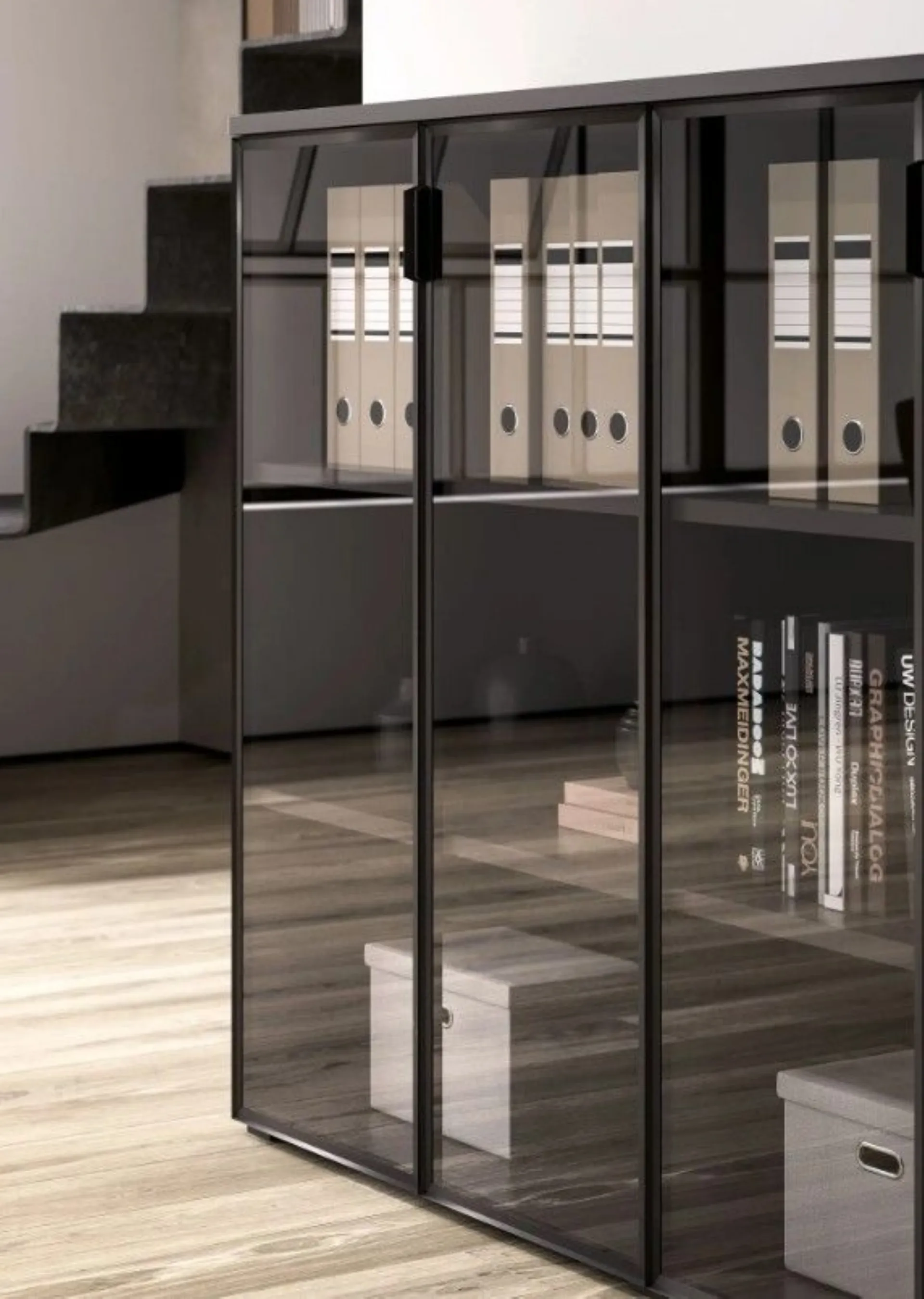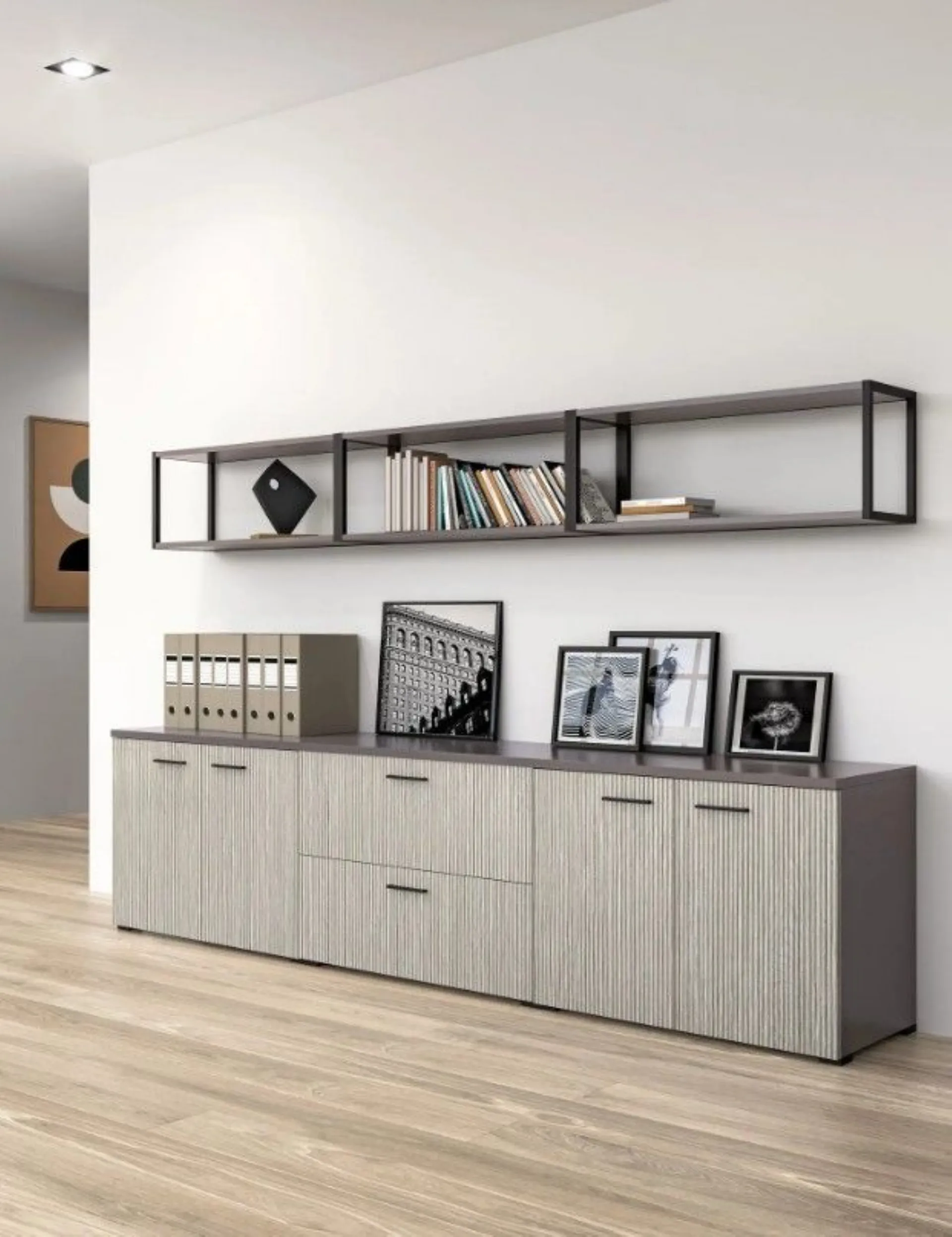 Soluzioni coordinate con elementi in vetro, telaio in tinta Titanio e vetro grigio fumé completano la scrivania con modulo di ricarica induzione; i pensili Urban in metallo e i frontali coordinati valorizzano il progetto, assicurando design moderno e funzionalità quotidiana.