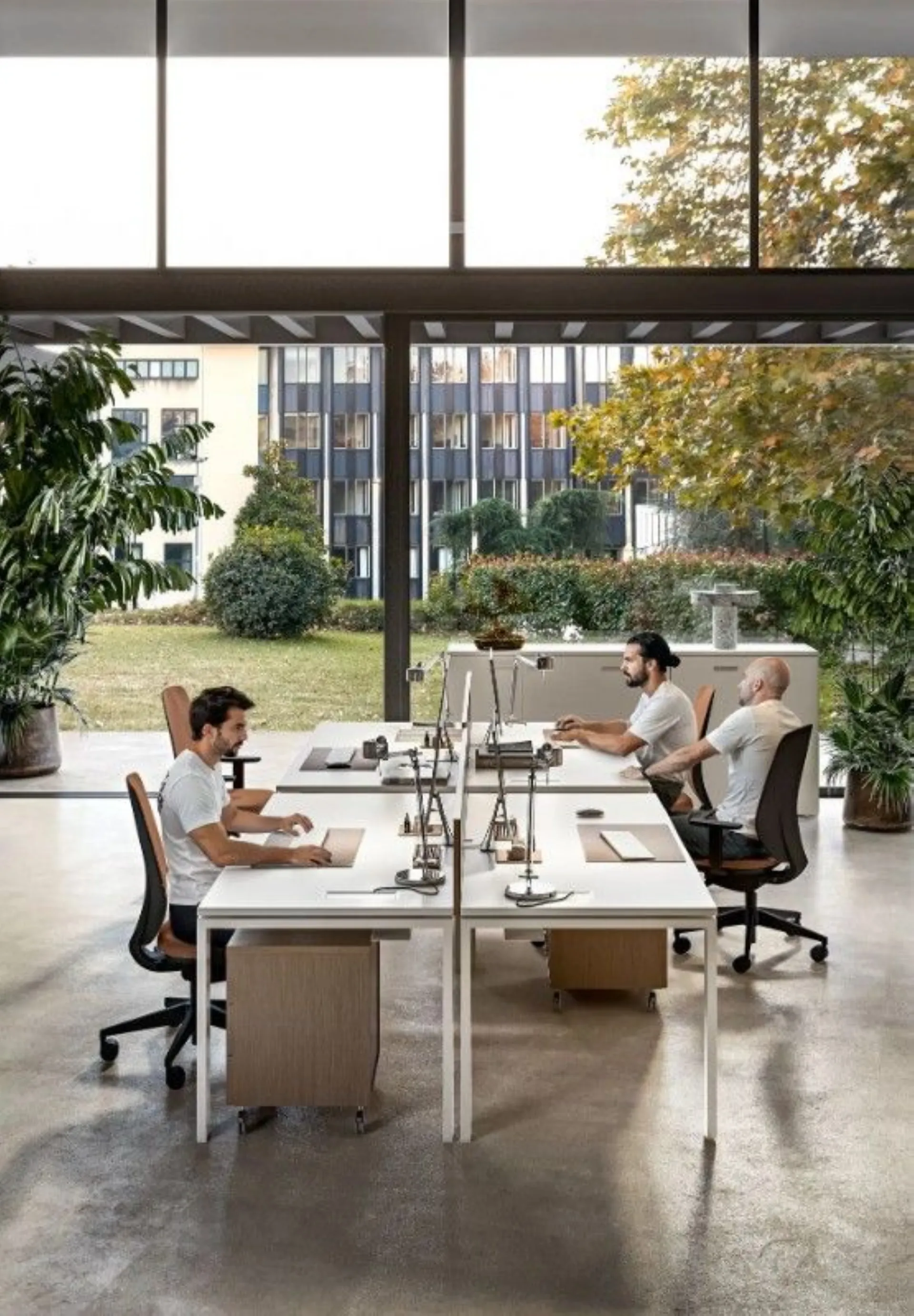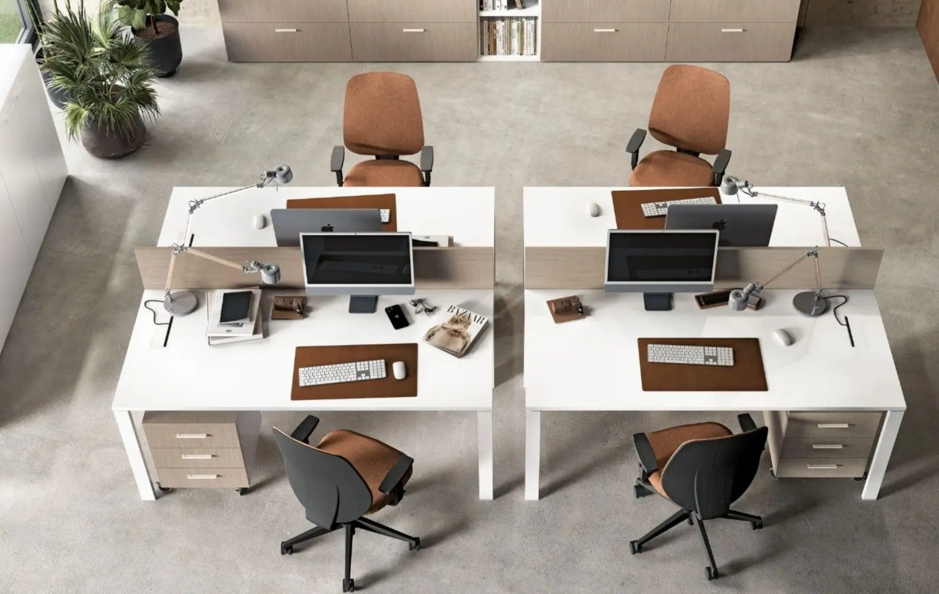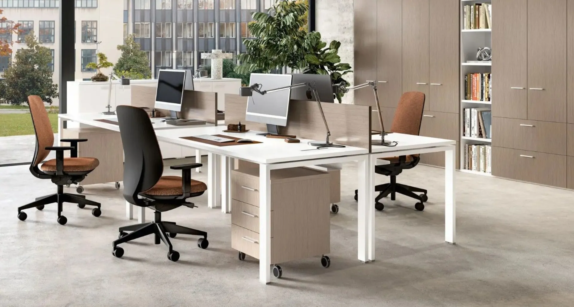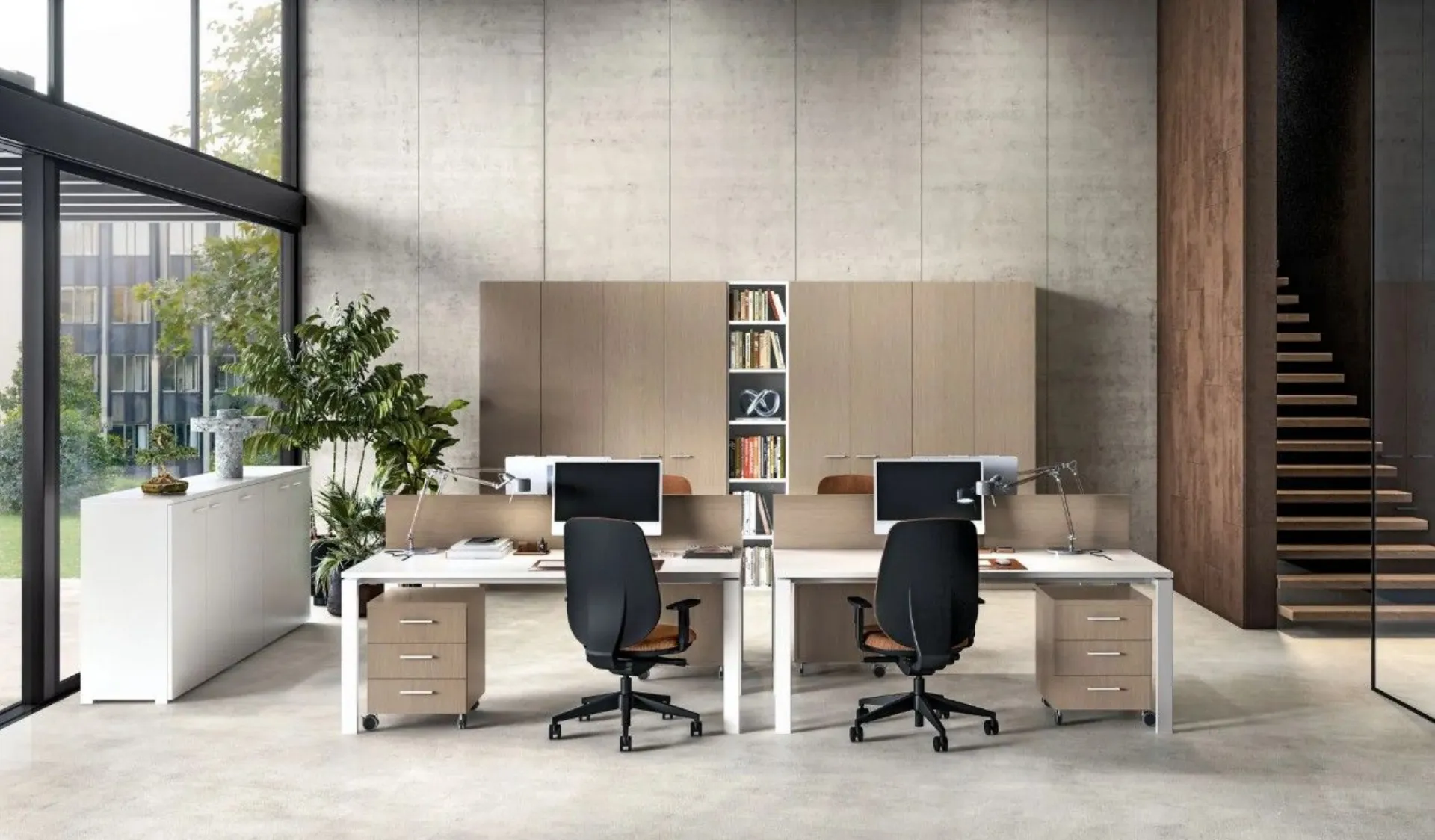 I mobili per ufficio favoriscono armonia e collaborazione: le scrivanie operative per quattro postazioni creano un design moderno e luminoso, mentre le cassettiere ufficio e l’armadio con elemento a giorno assicurano funzionalità e ordine. Ogni postazione è completata dalla poltroncina Shape, per comfort e sostegno durante tutta la giornata.