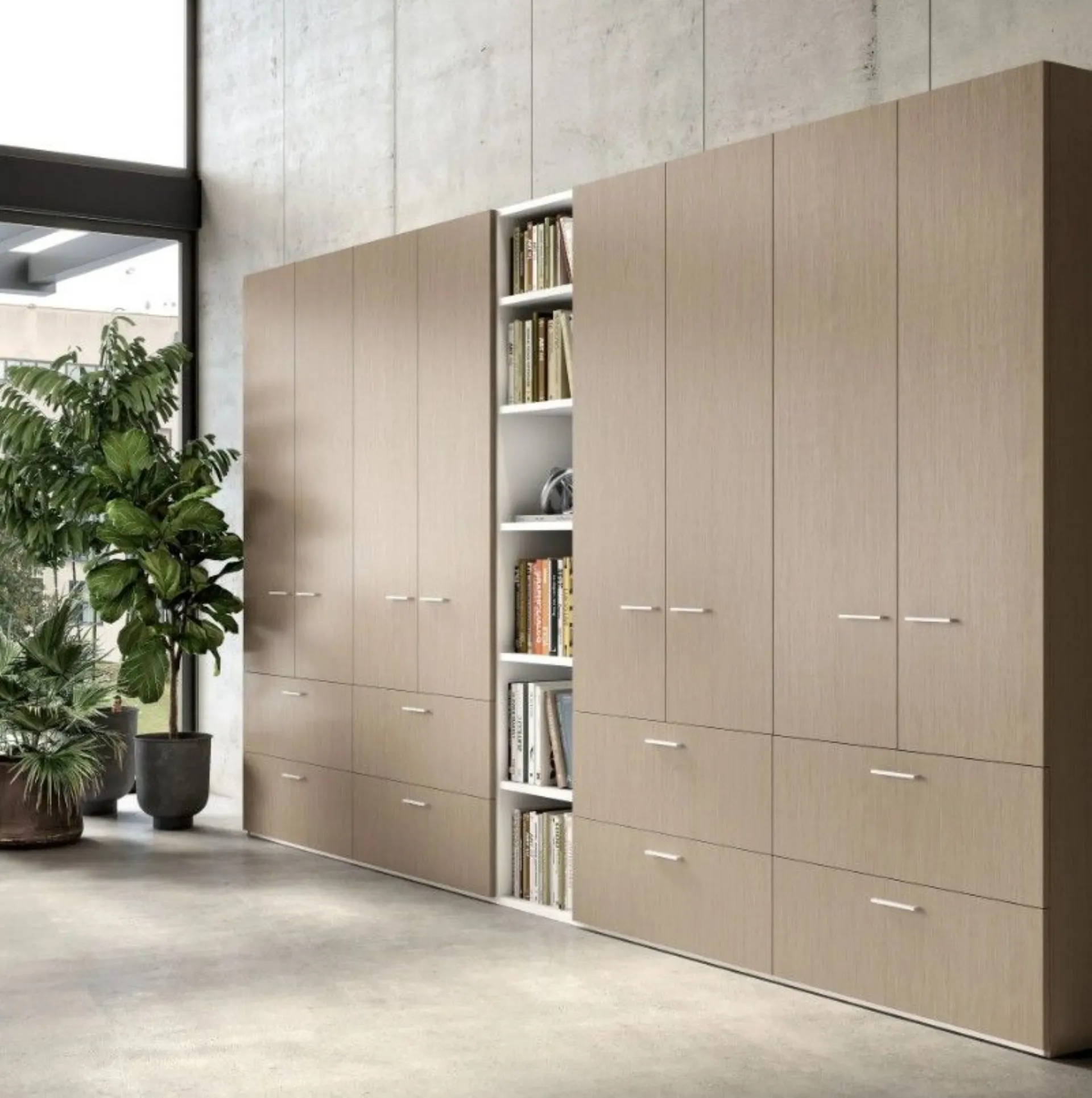 Un arredamento ufficio completo integra armadi ufficio con ante e cassettoni, moduli a giorno e scrivanie con screen divisorio per postazioni ben separate. La configurazione mantiene lo spazio ordinato e funzionale, ideale per lavorare insieme con comfort e stile.
