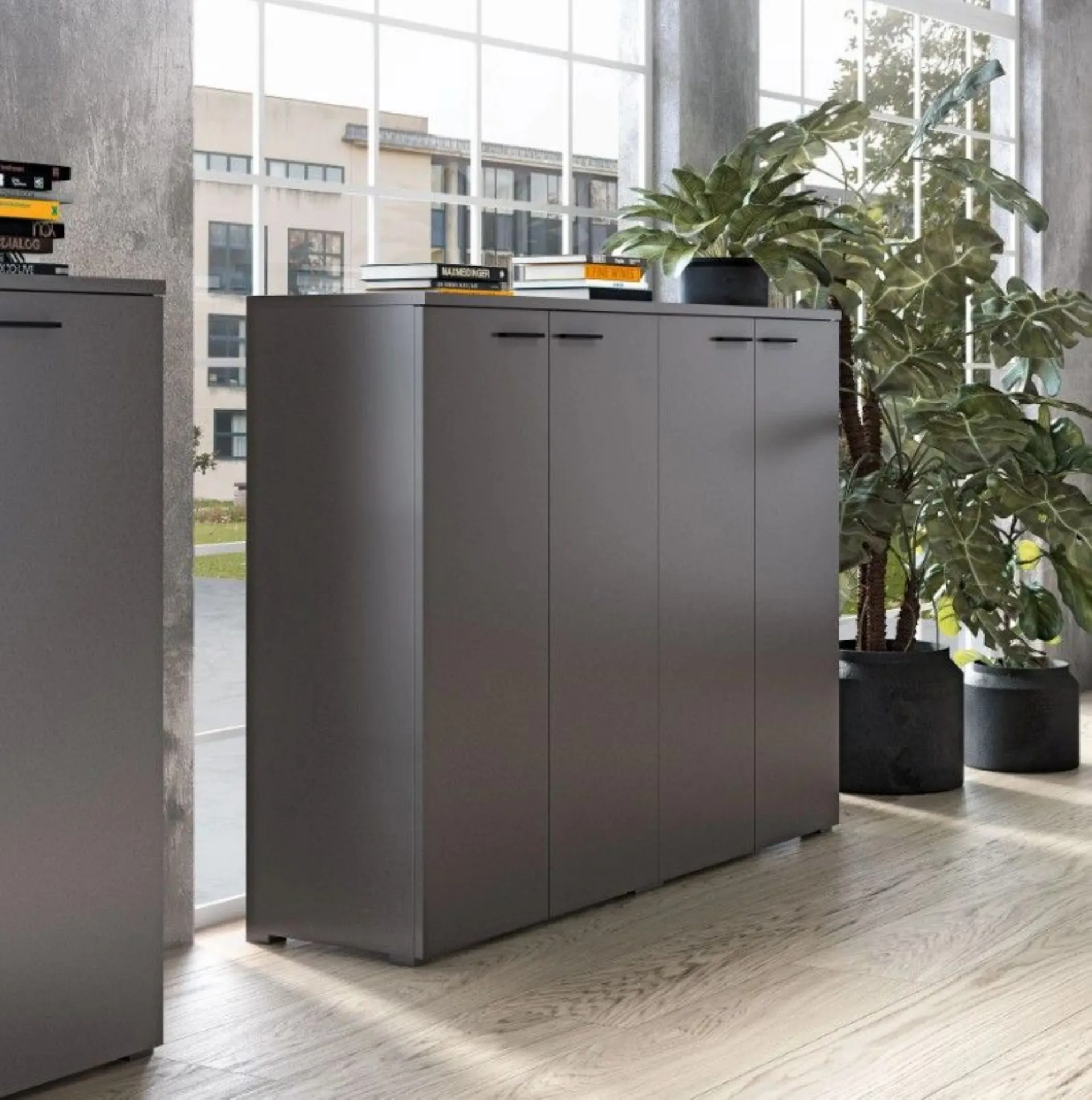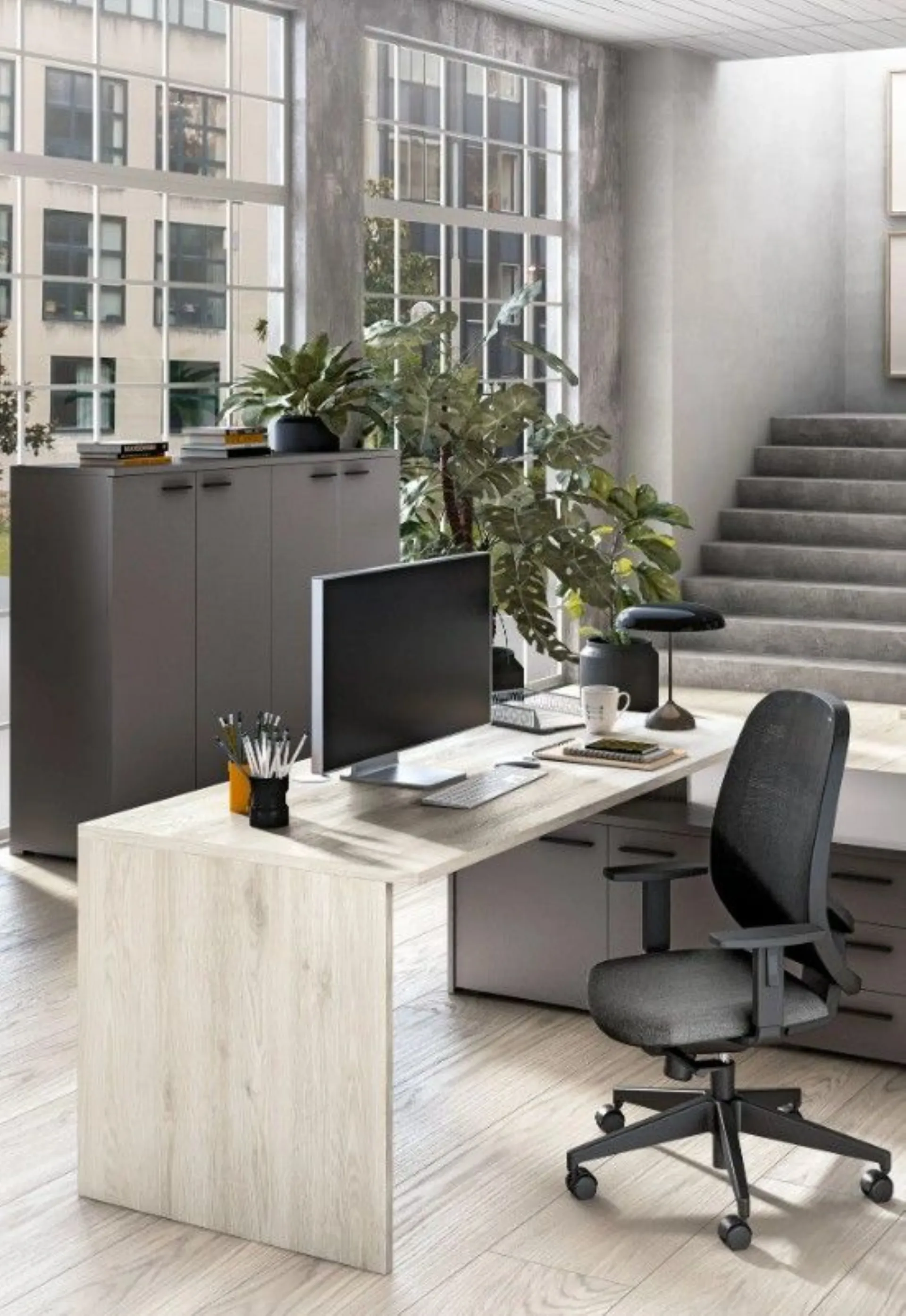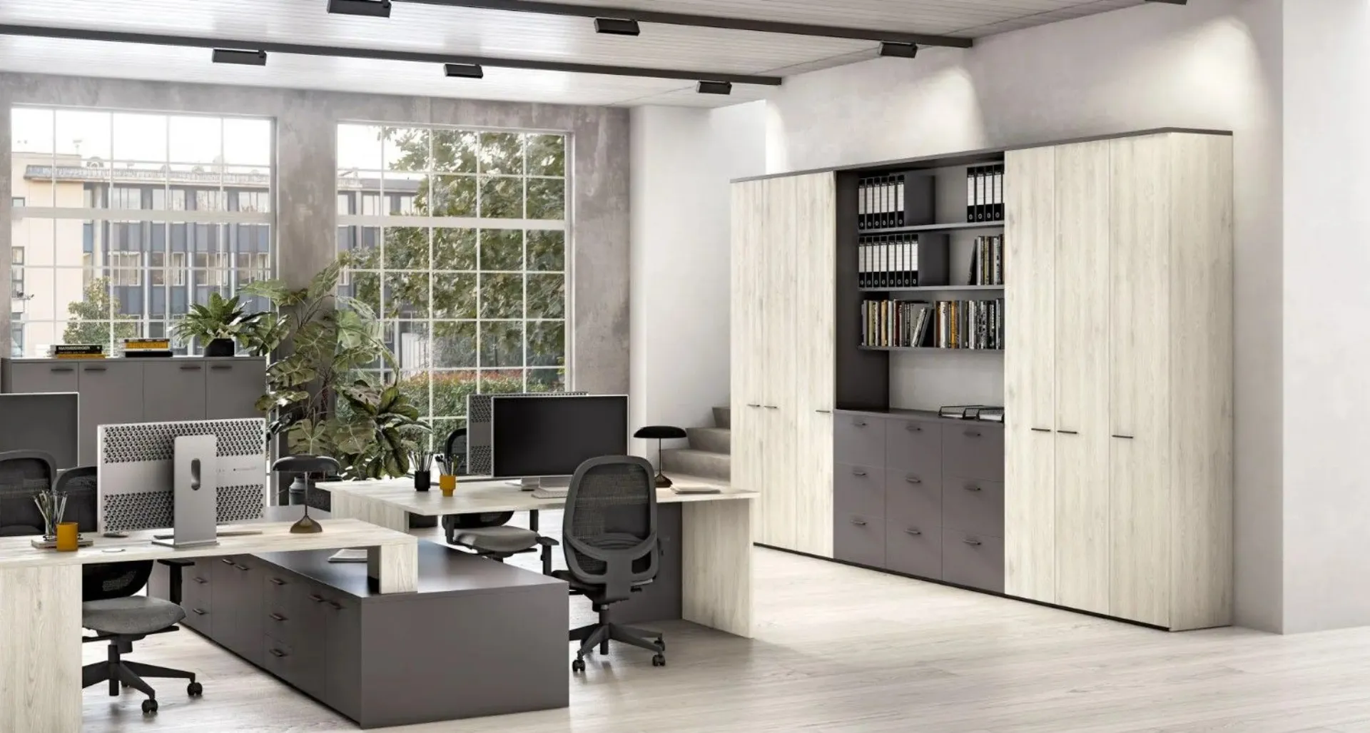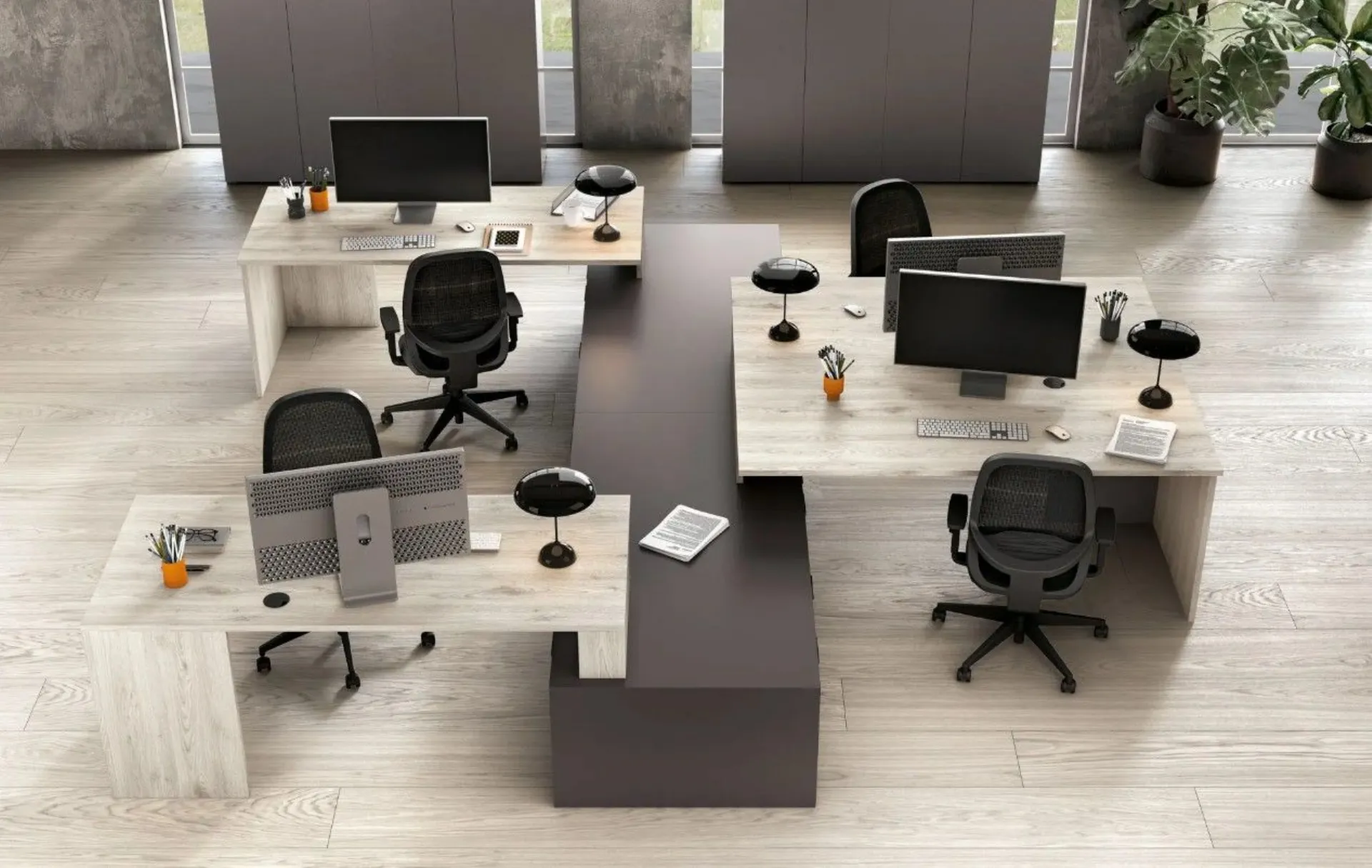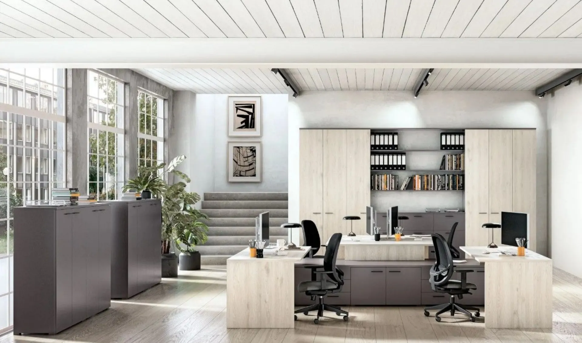 I mobili per ufficio ottimizzano spazio e collaborazione: postazioni per quattro persone con scrivanie operative, cassettiere centrali e elementi componibili mantengono ordine senza occupare superfici preziose. Questo arredamento unisce Rovere Chiaro e Grafite, creando un ambiente elegante e pratico, ideale per lavorare insieme in modo produttivo.